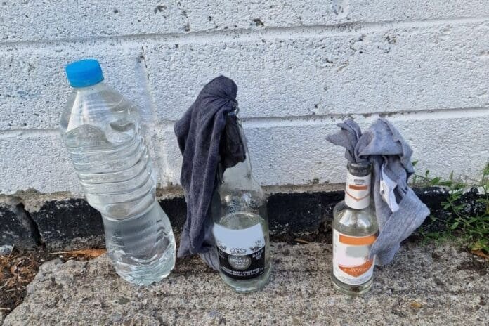 Garda a recuperat mai multe dispozitive incendiare, inclusiv șapte sticle de sticlă și plastic de diferite dimensiuni, care conțineau lichid inflamabil. Au fost găsite și sticle de plastic cu un amestec de vopsea și ulei, precum și pachete de baloane de apă.