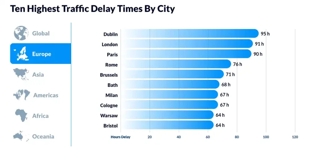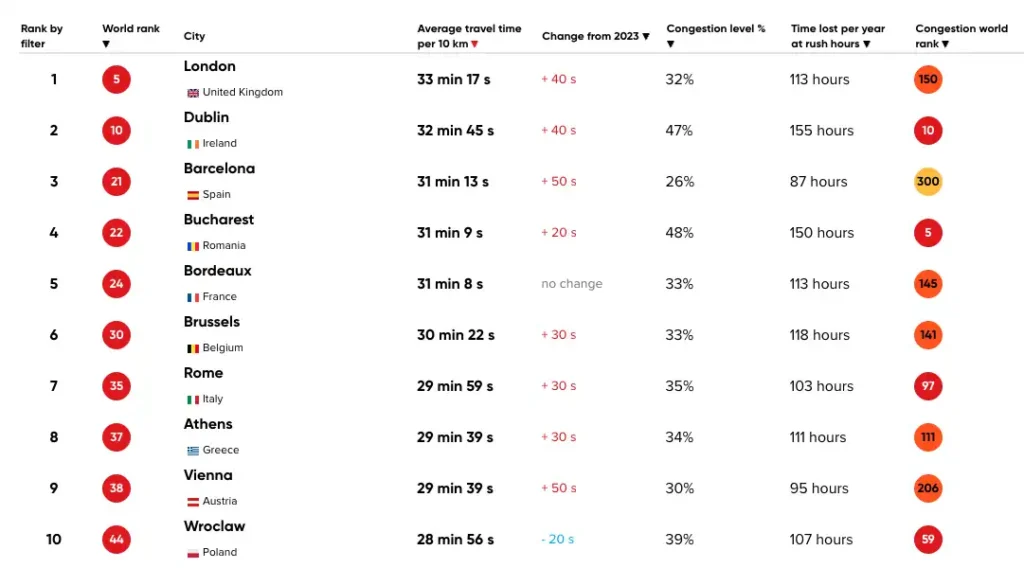 În context european, în acest top, Dublin este orașul din Europa în care pierzi cele mai multe ore în trafic, fiind urmat de Londra și Paris, ambele înregistrând însă o scădere a timpilor pierduți în trafic.