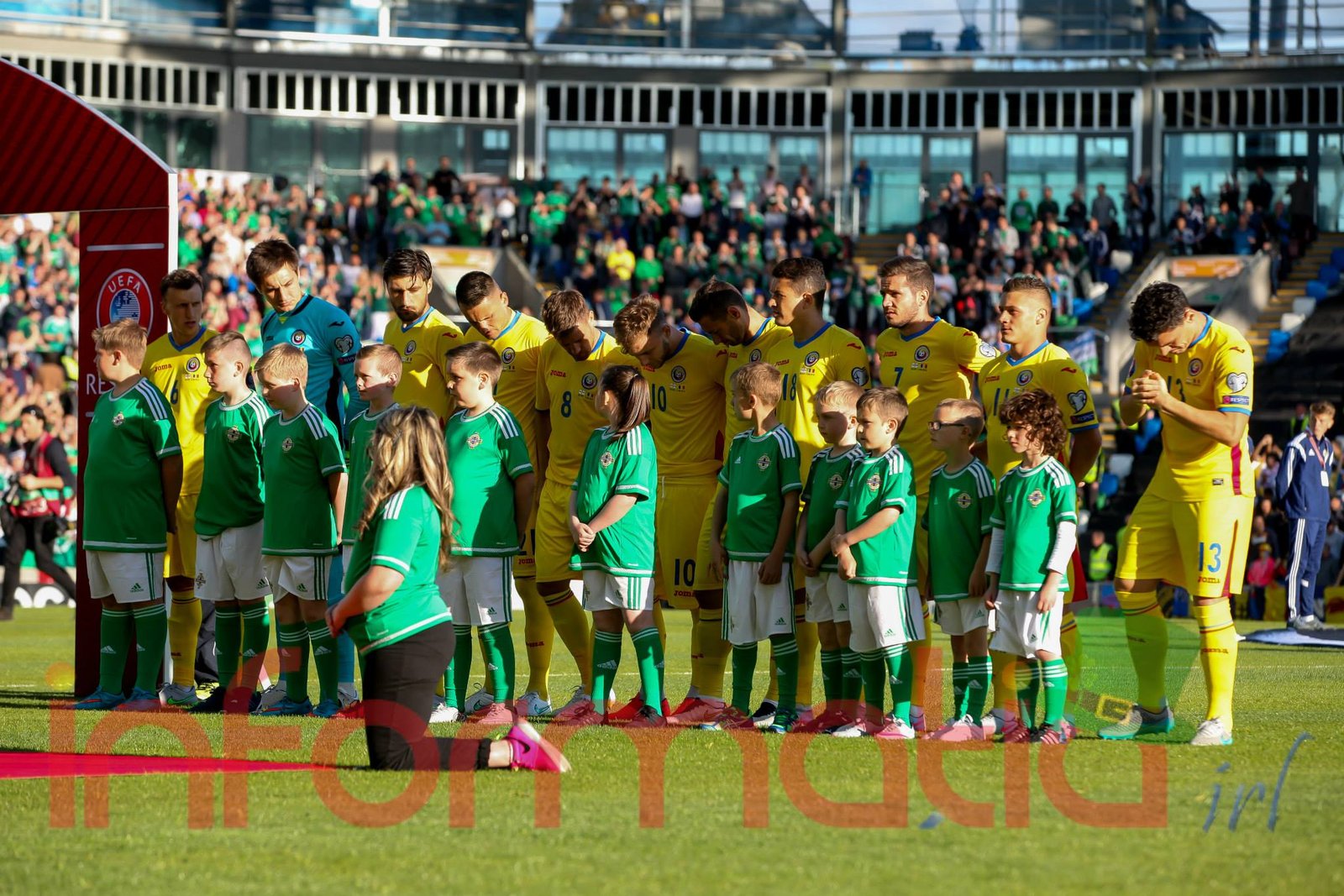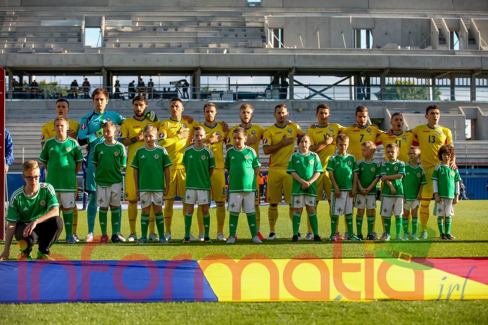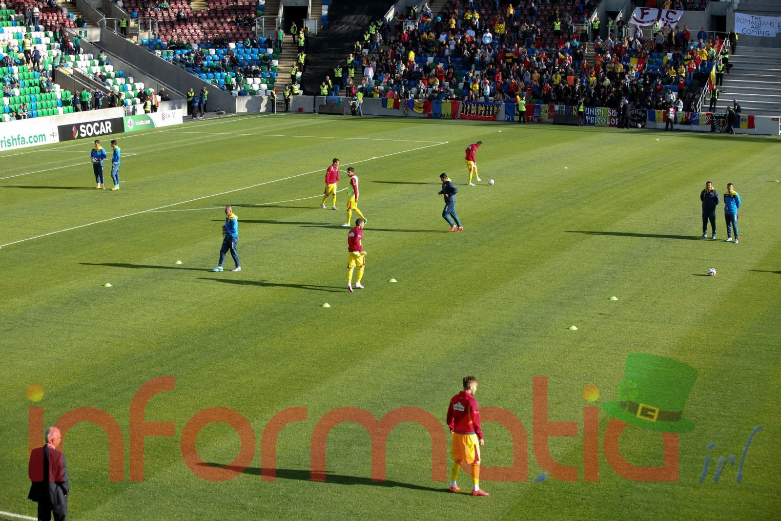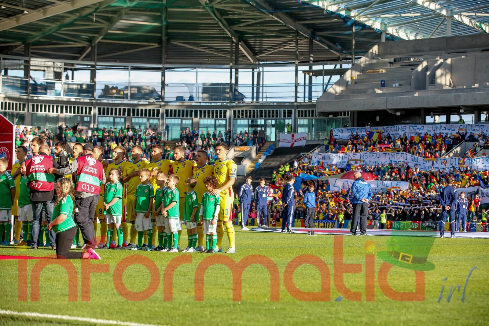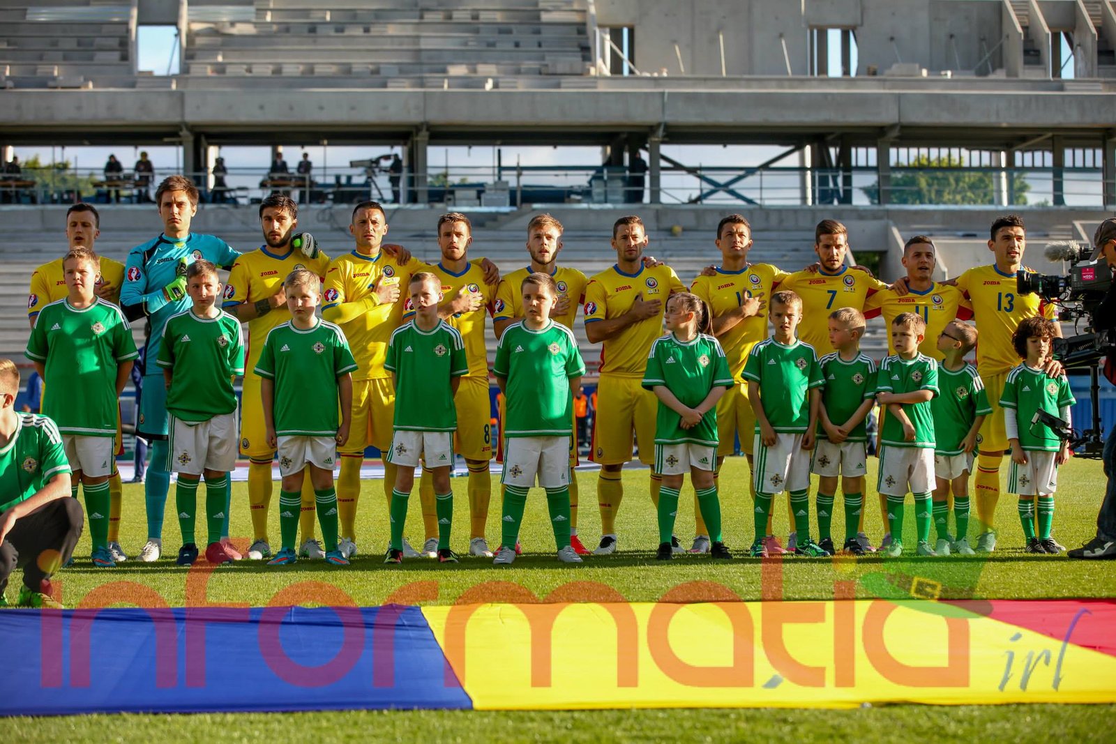 9.39 Jucatorii celor doua echipe ies pe teren, Jucatorii nostri in galben complet, irlandezii cu tricouri verzi si sorturi albe. Acum se canta imnul Romaniei