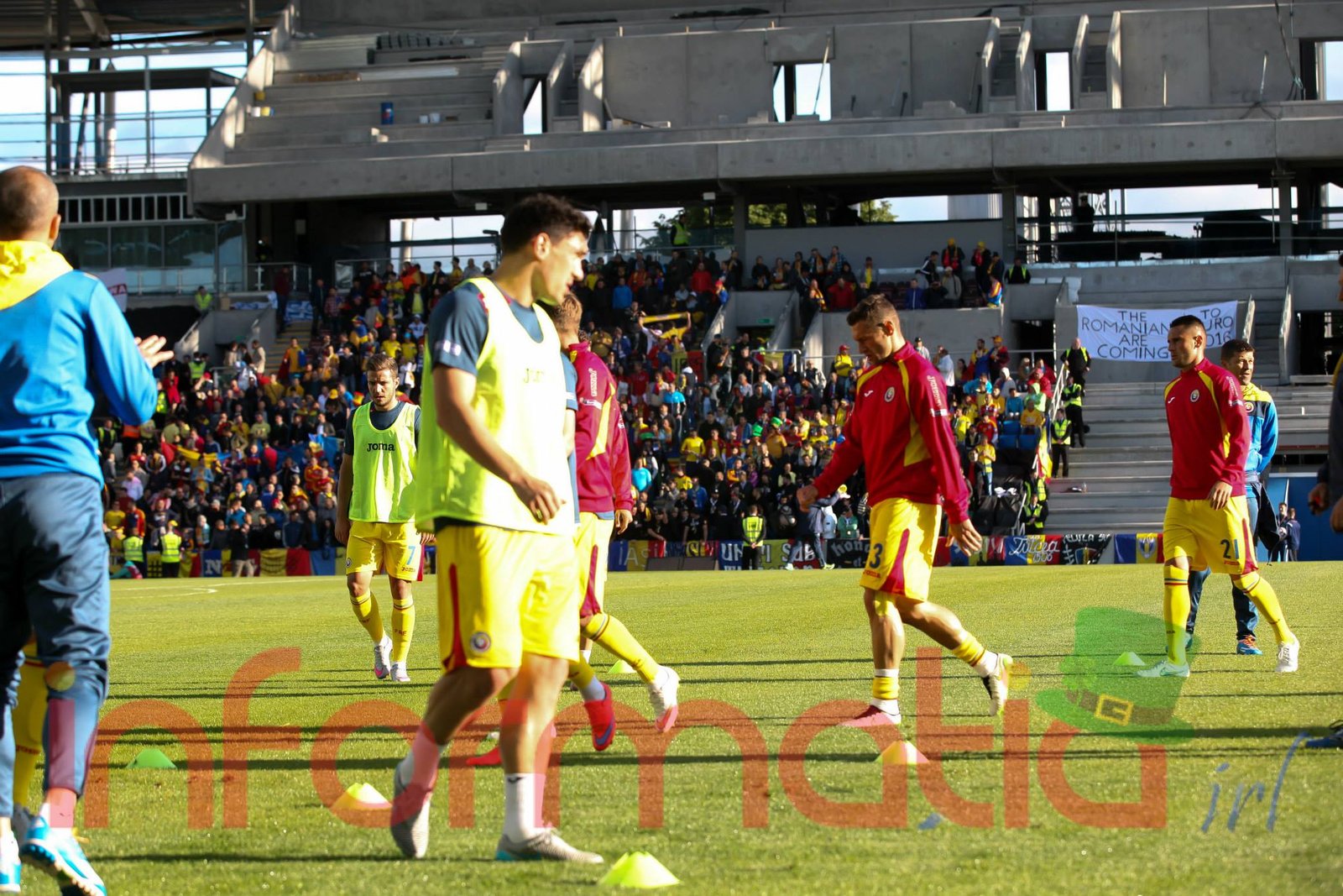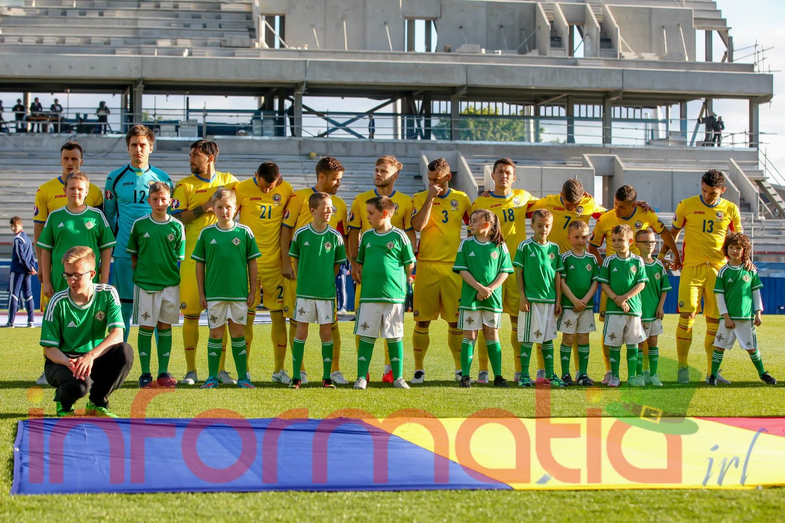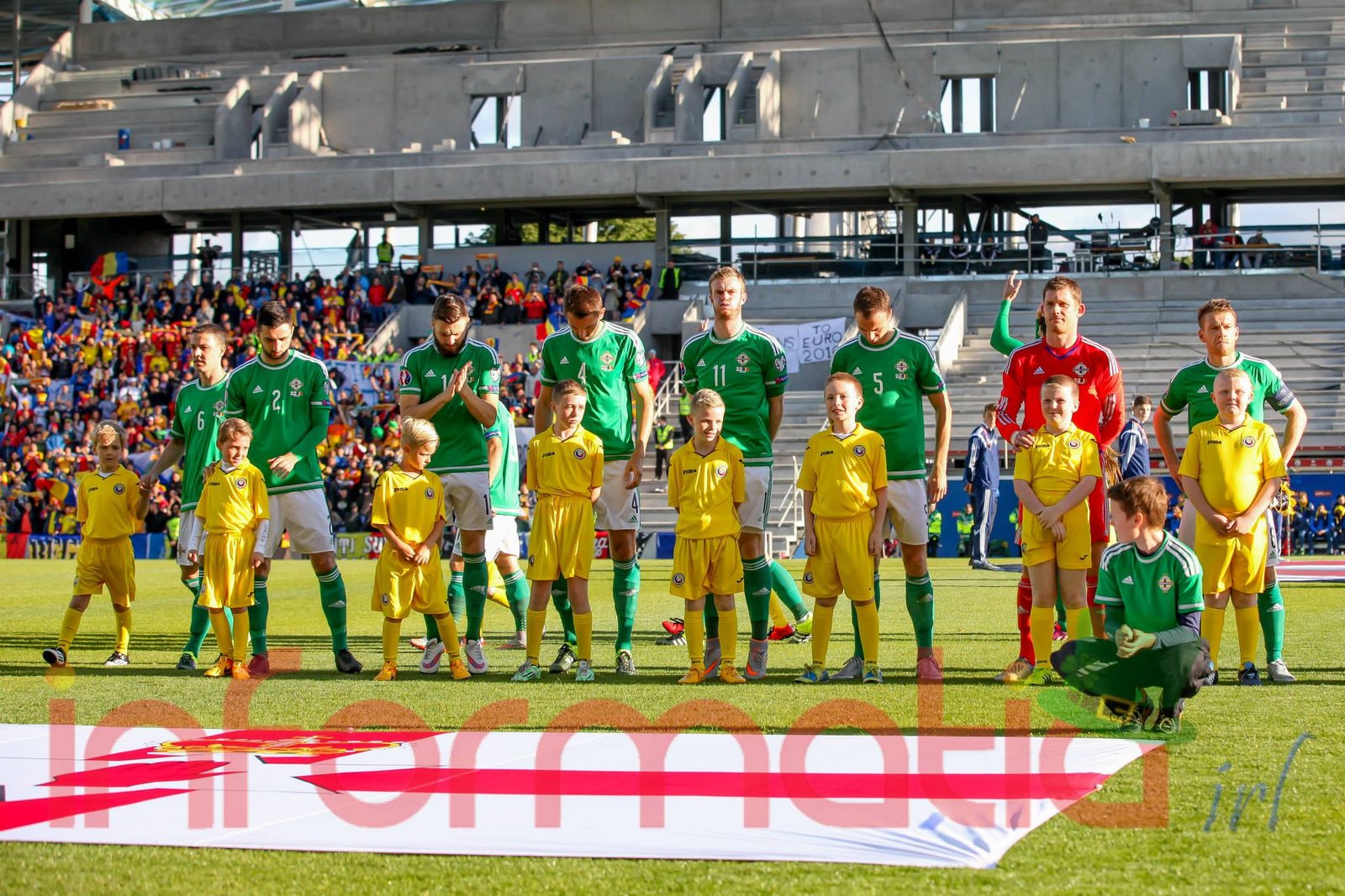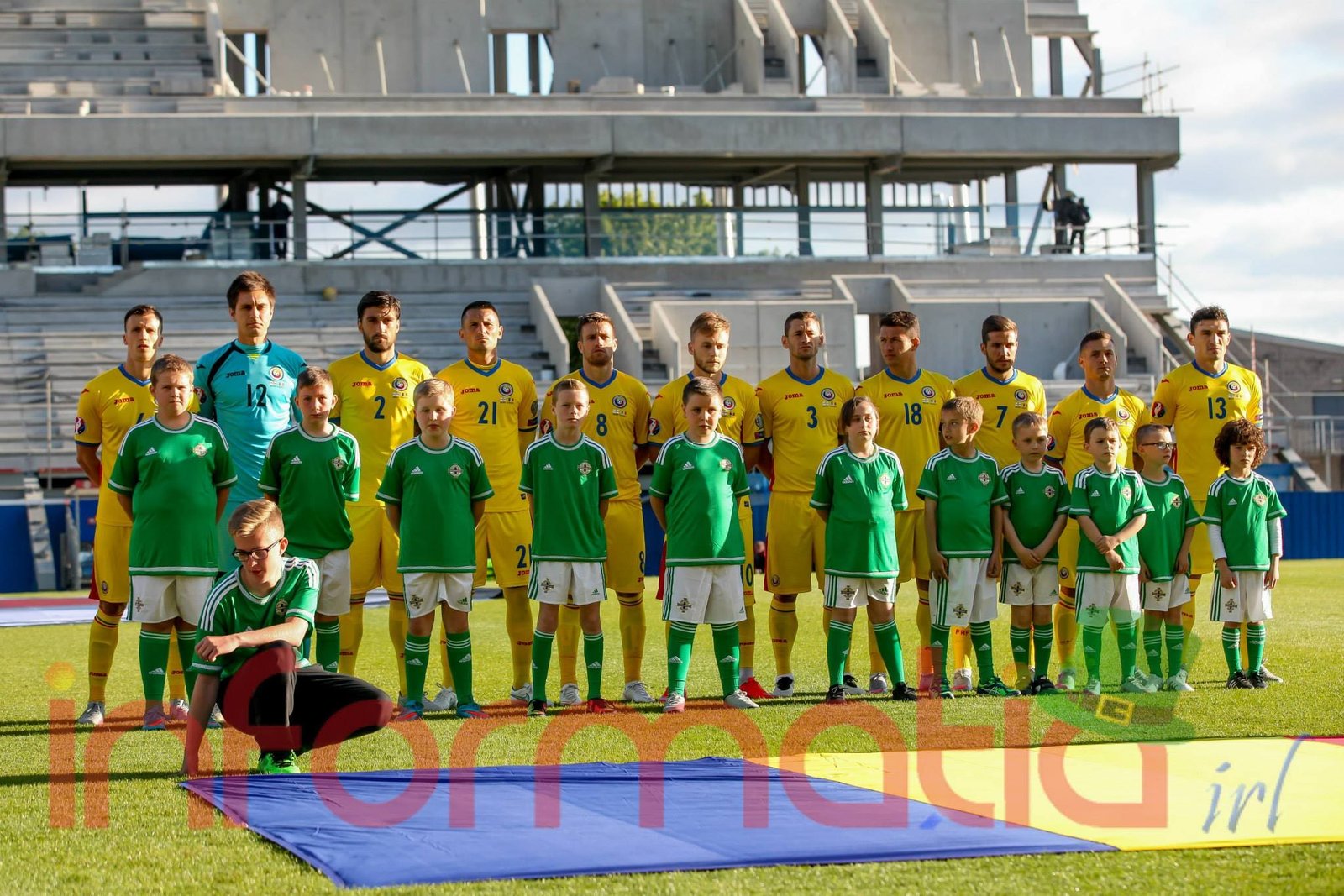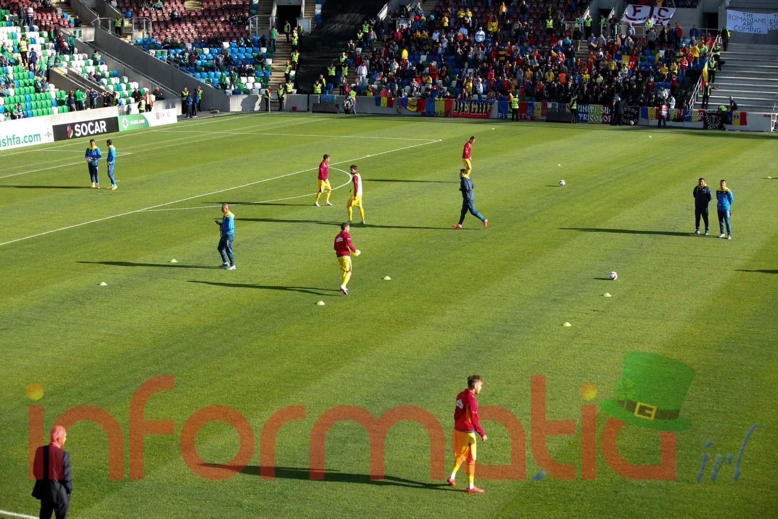 9.39 Jucatorii celor doua echipe ies pe teren, Jucatorii nostri in galben complet, irlandezii cu tricouri verzi si sorturi albe. Acum se canta imnul Romaniei