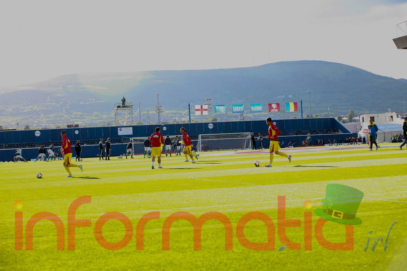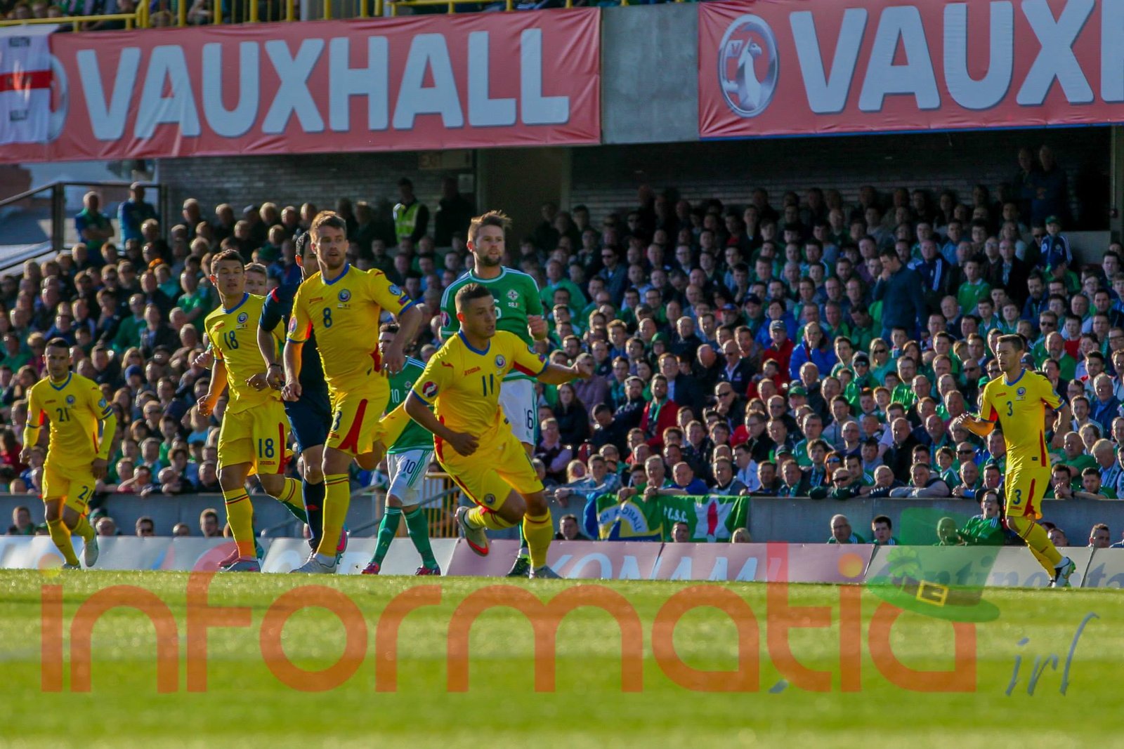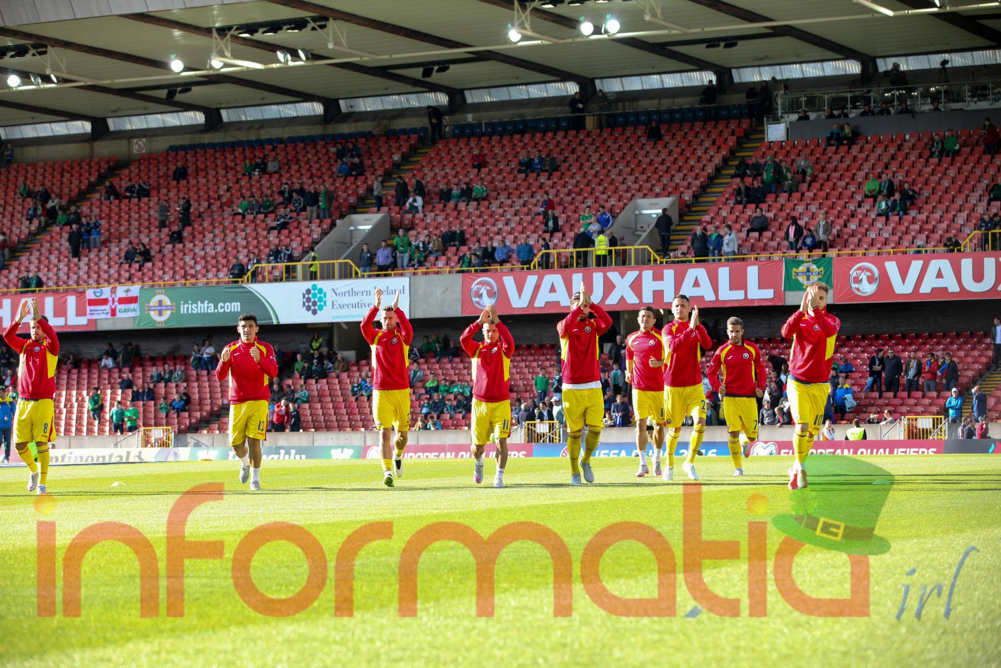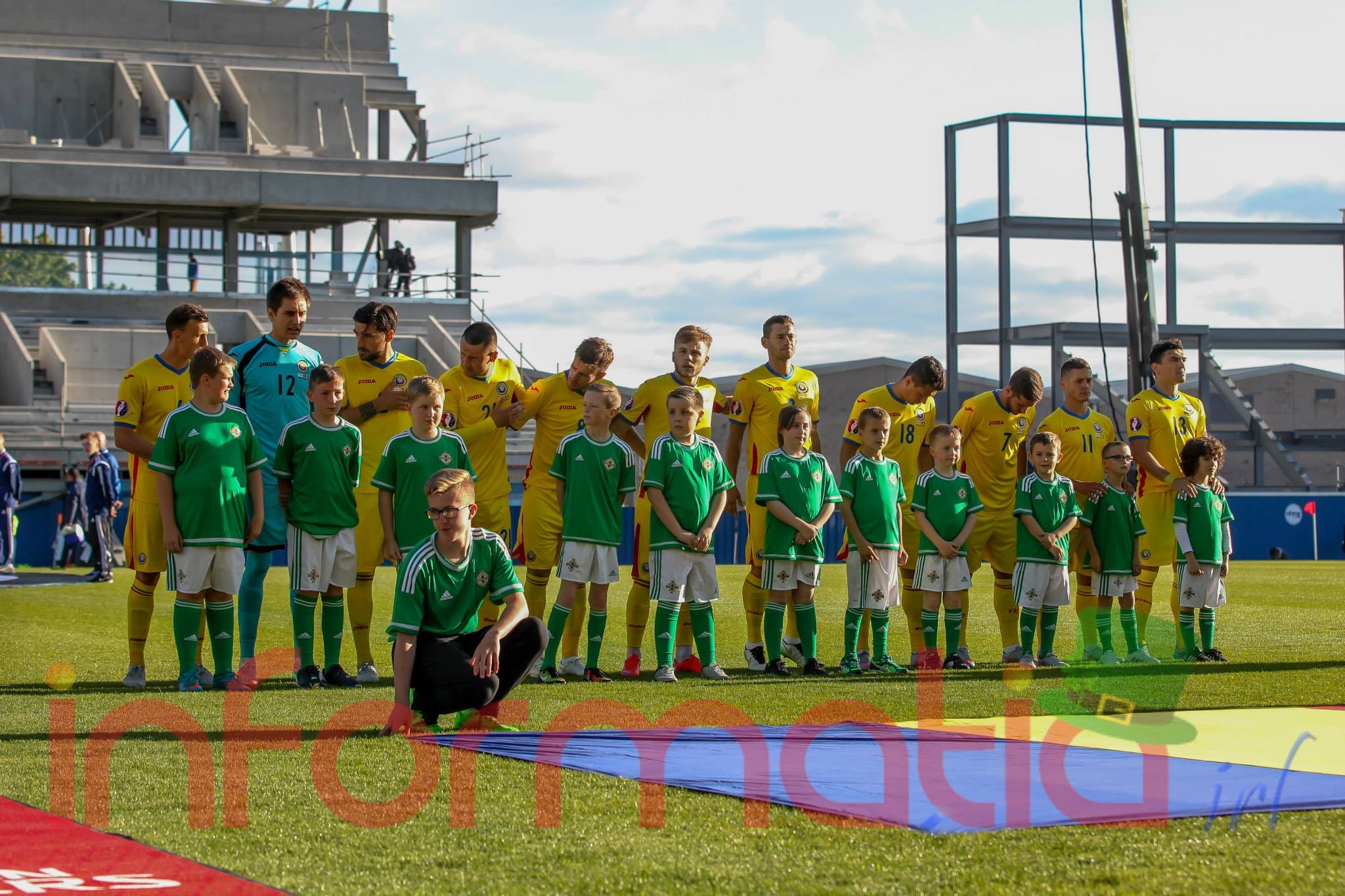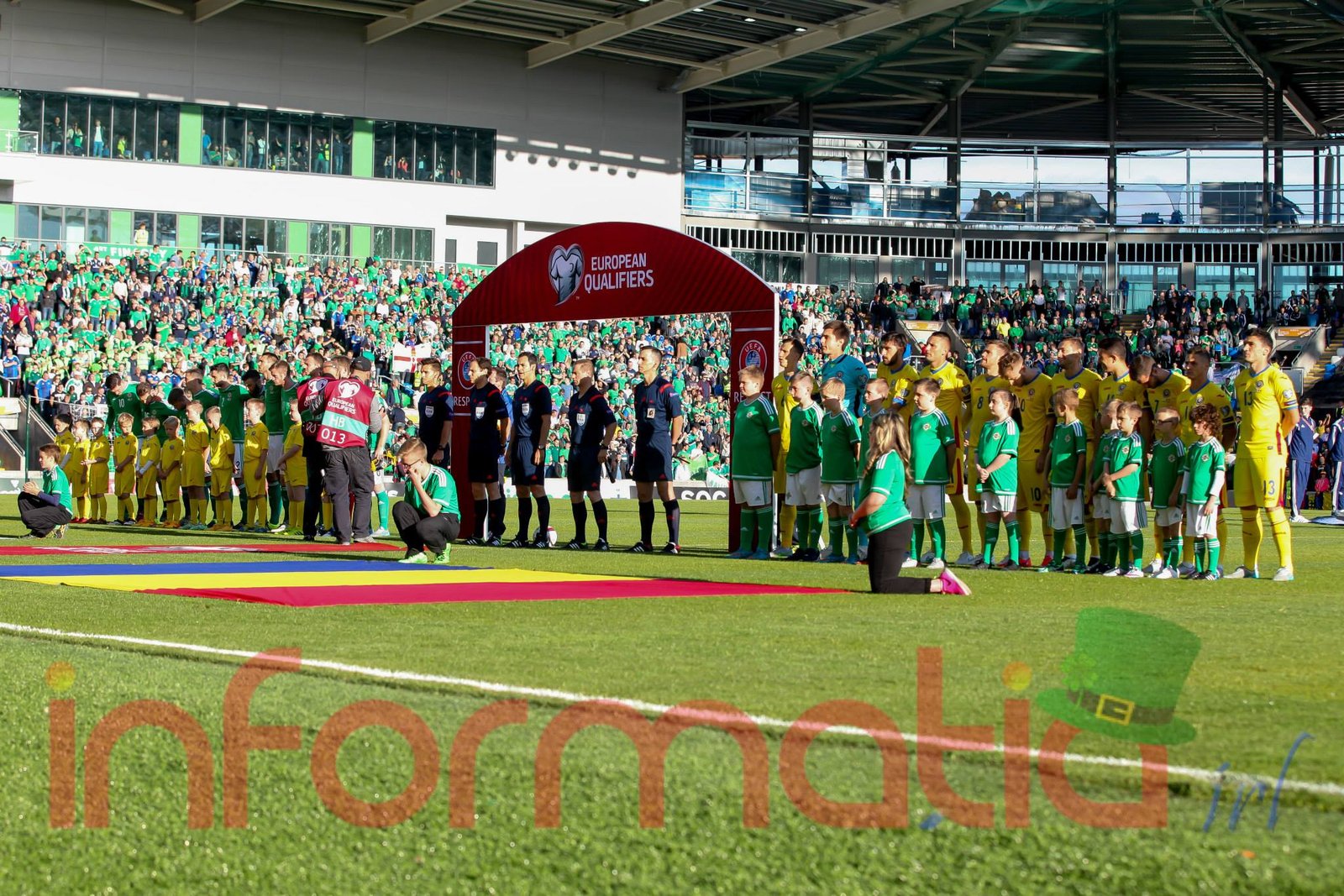 9.39 Jucatorii celor doua echipe ies pe teren, Jucatorii nostri in galben complet, irlandezii cu tricouri verzi si sorturi albe. Acum se canta imnul Romaniei