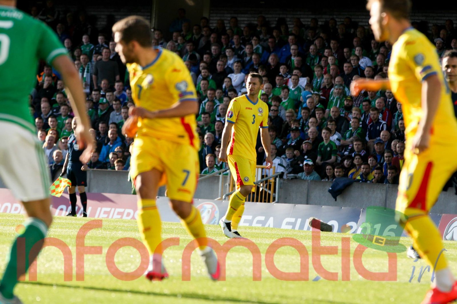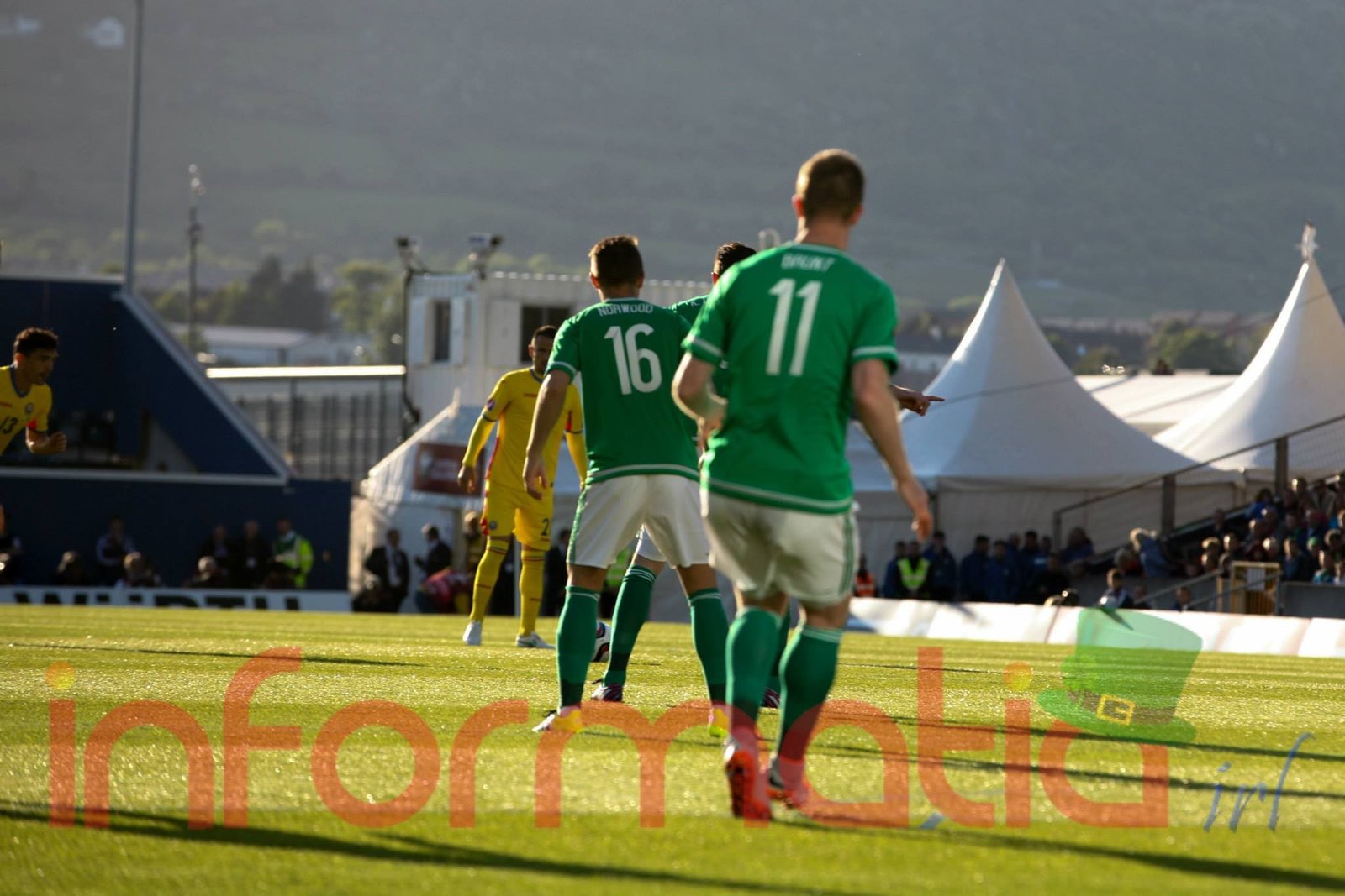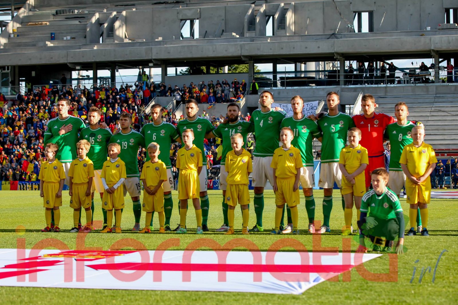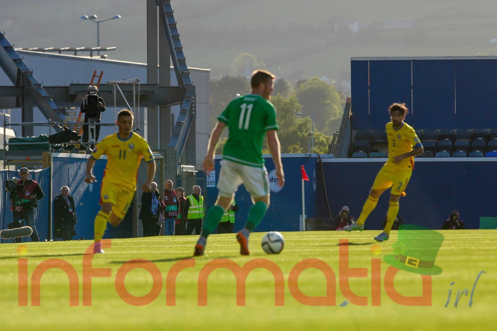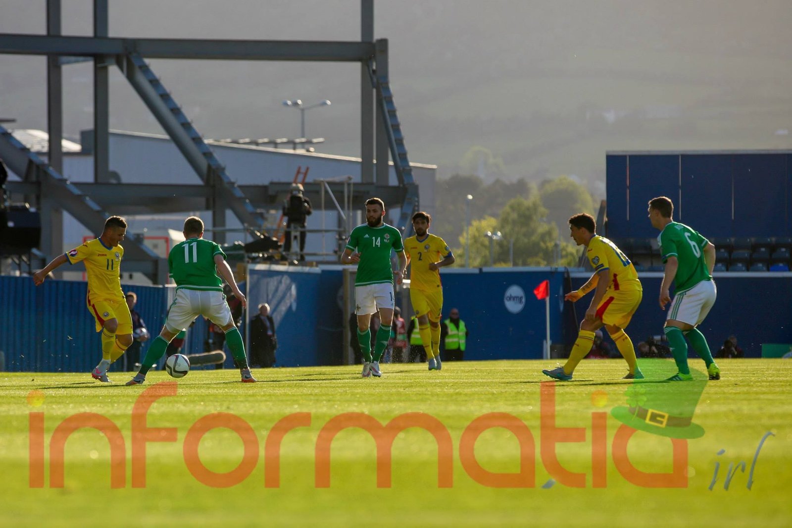 9.39 Jucatorii celor doua echipe ies pe teren, Jucatorii nostri in galben complet, irlandezii cu tricouri verzi si sorturi albe. Acum se canta imnul Romaniei