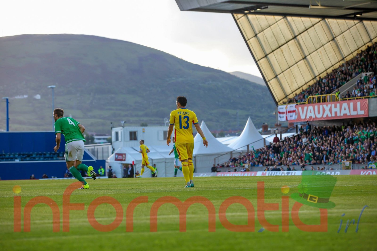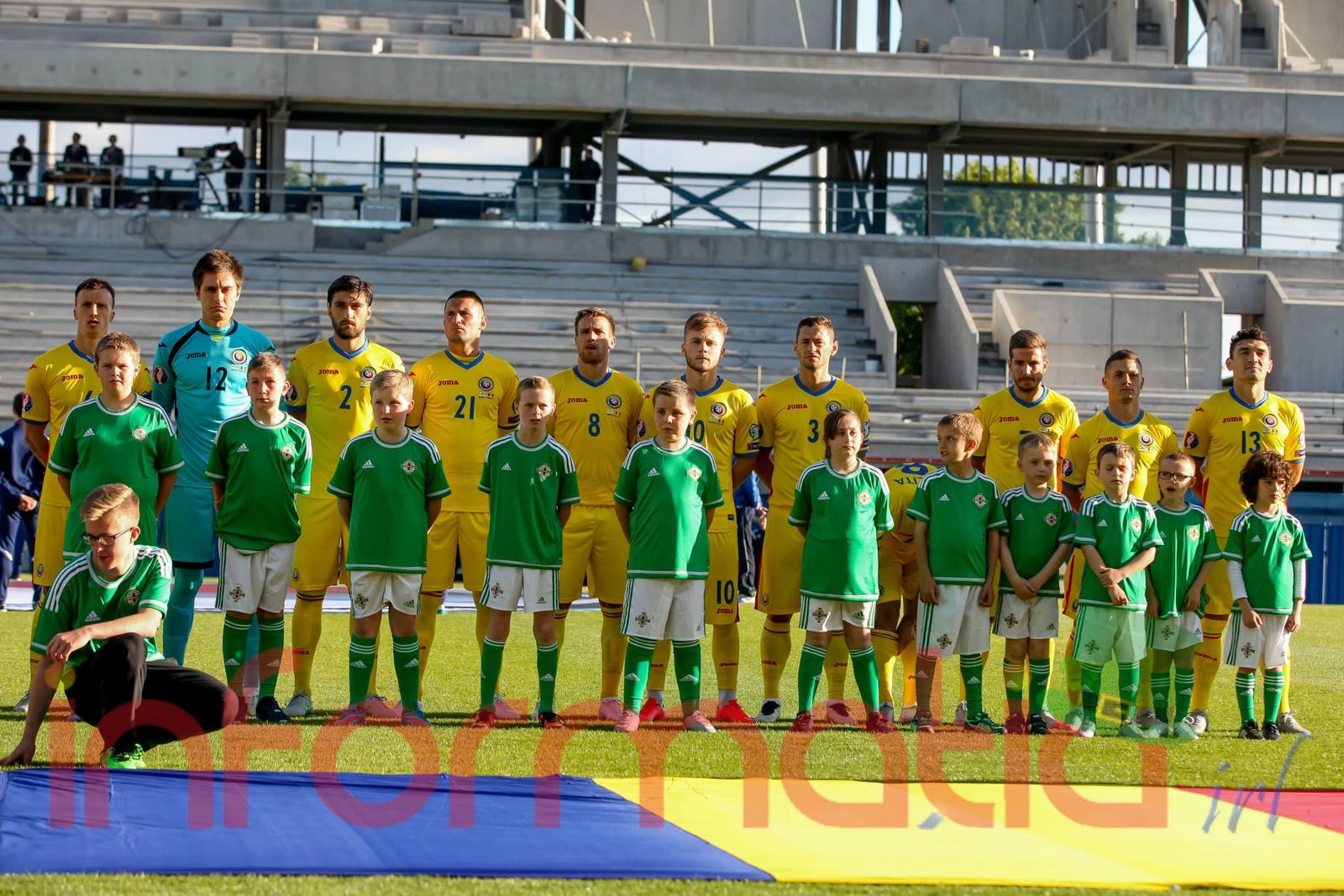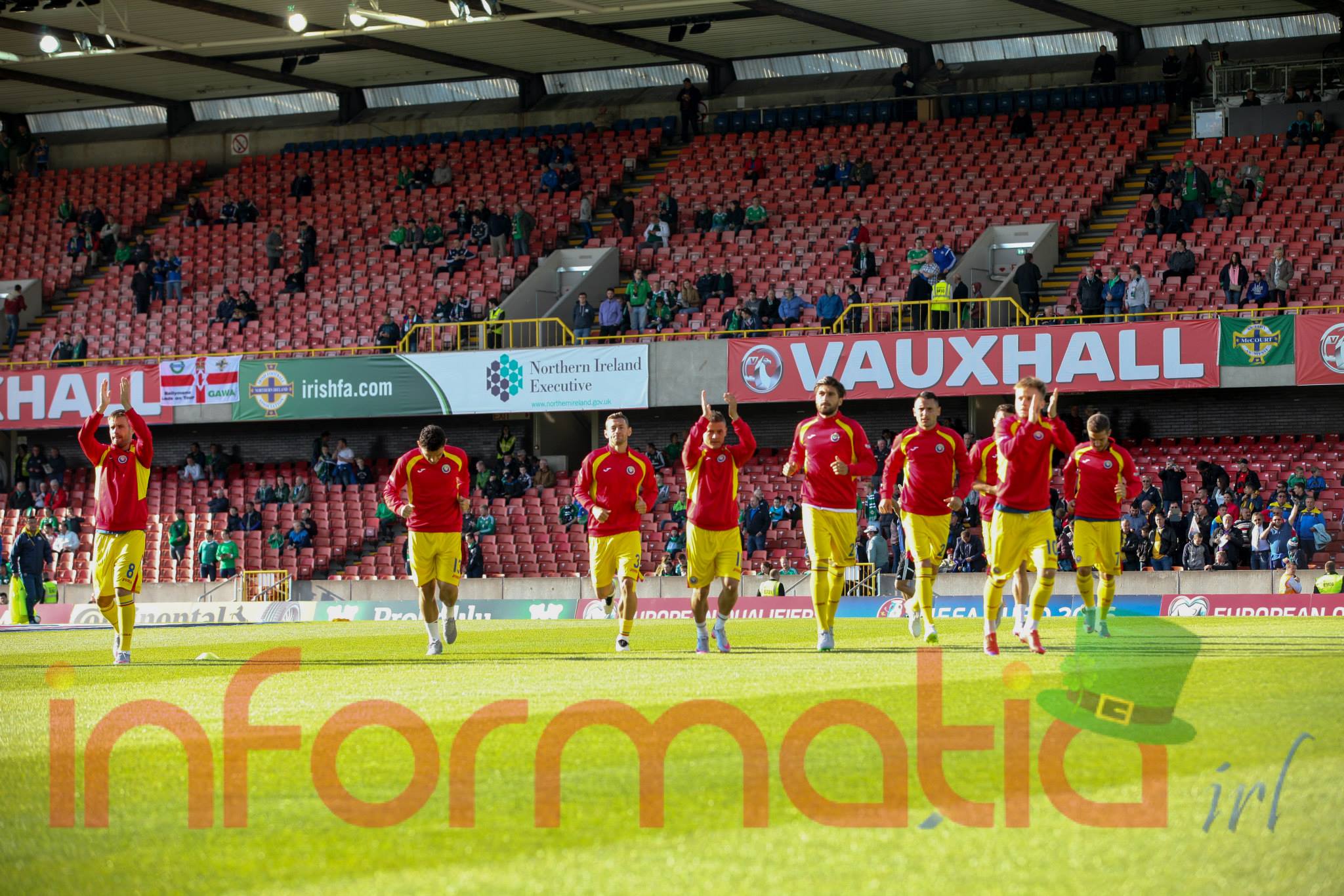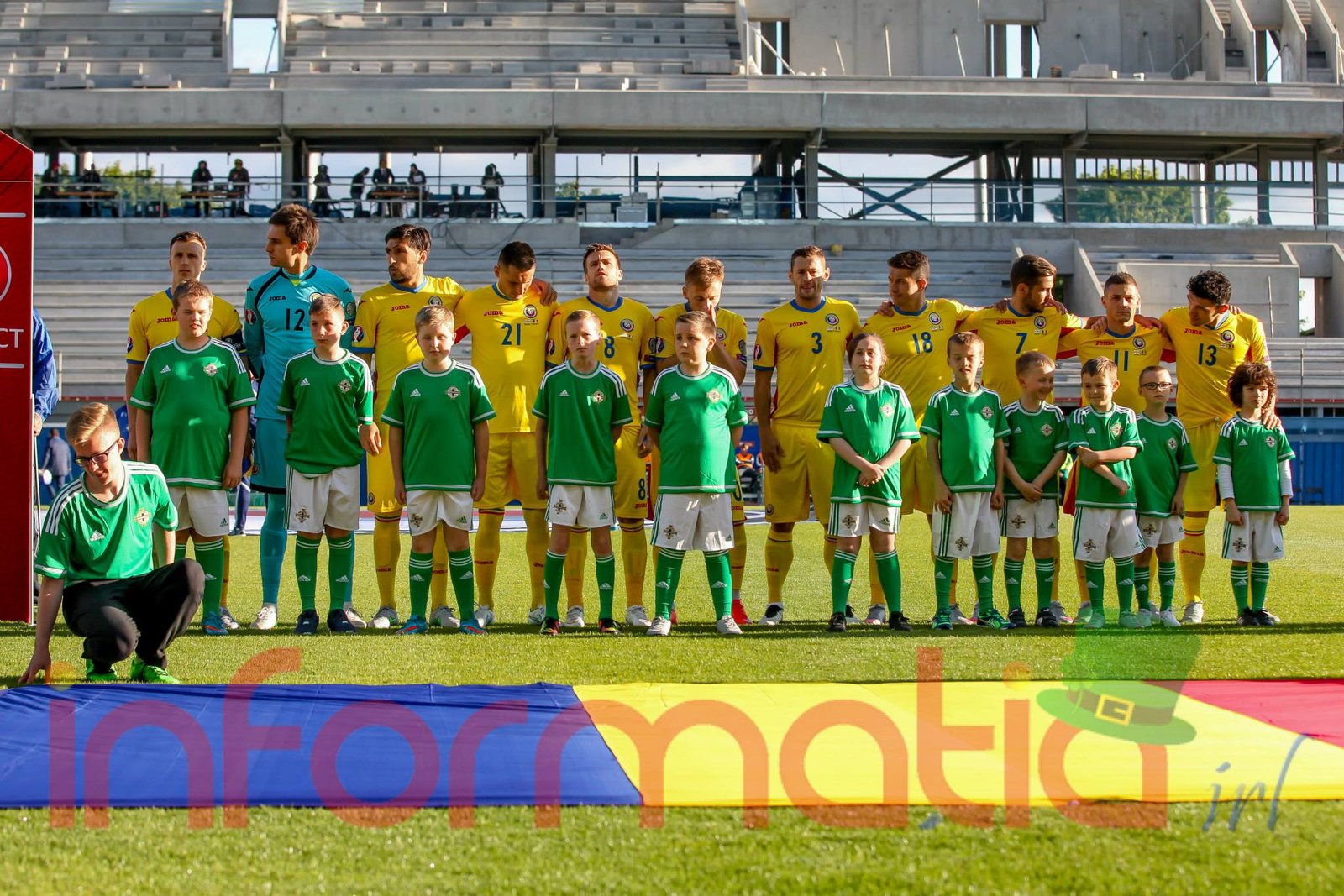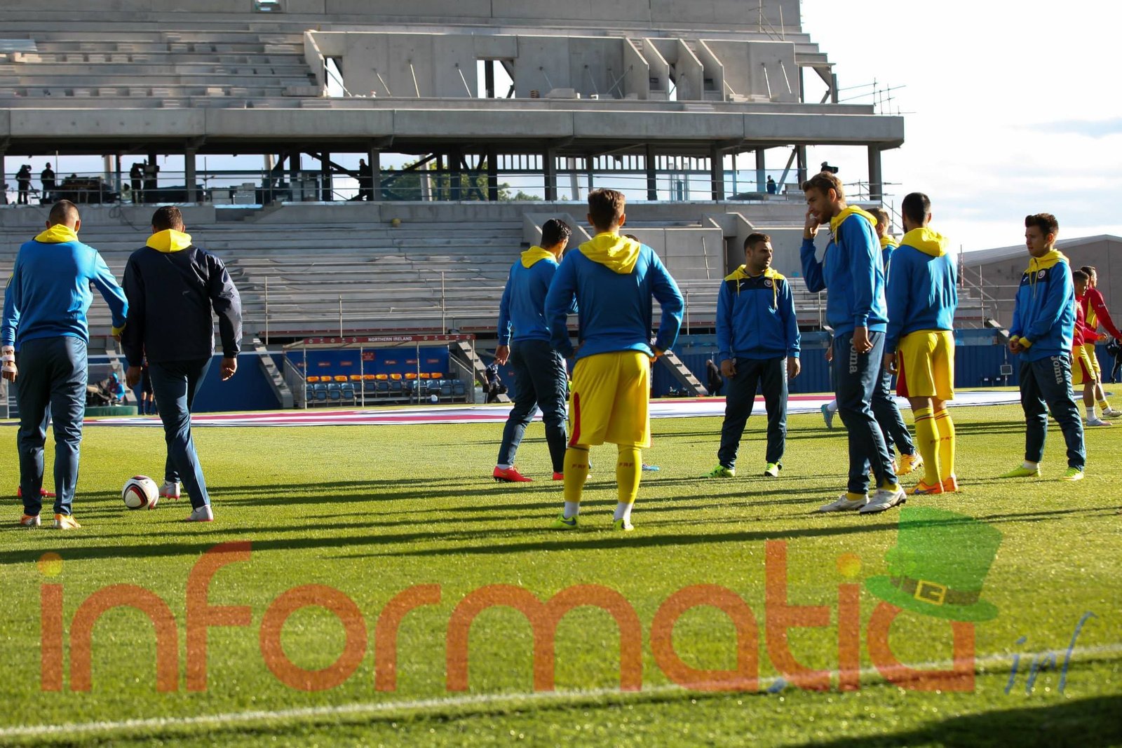 9.39 Jucatorii celor doua echipe ies pe teren, Jucatorii nostri in galben complet, irlandezii cu tricouri verzi si sorturi albe. Acum se canta imnul Romaniei