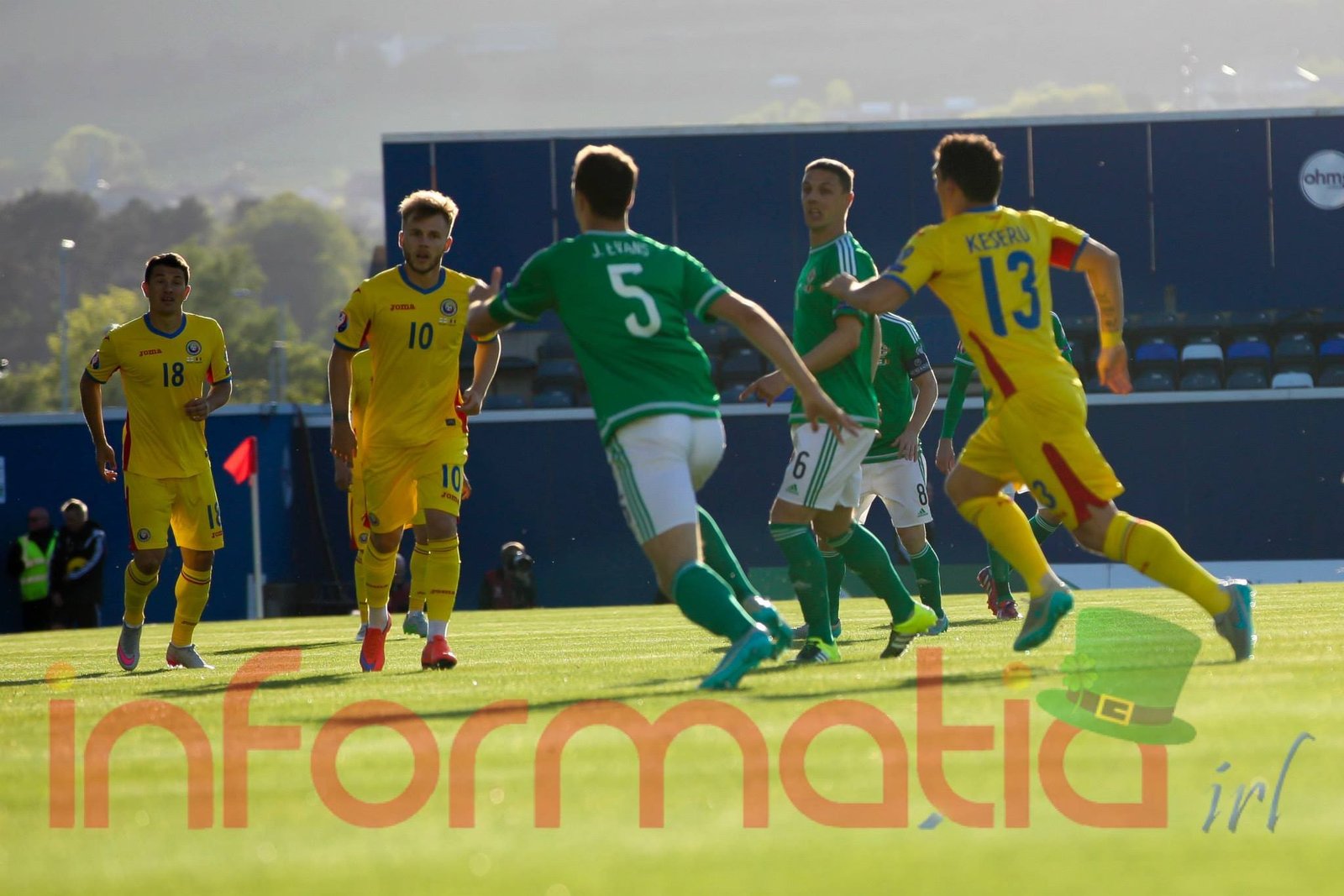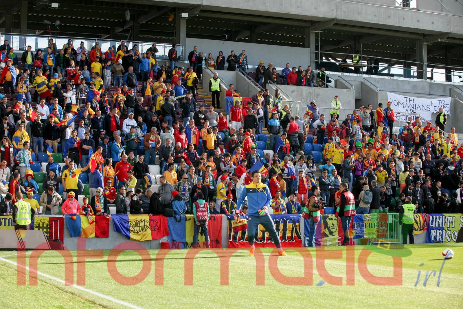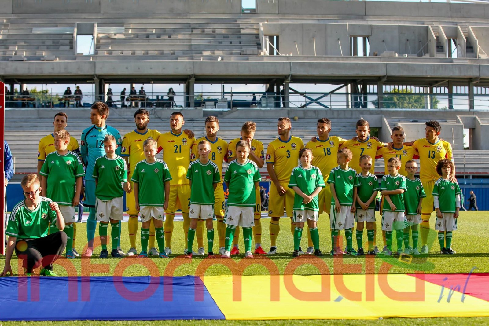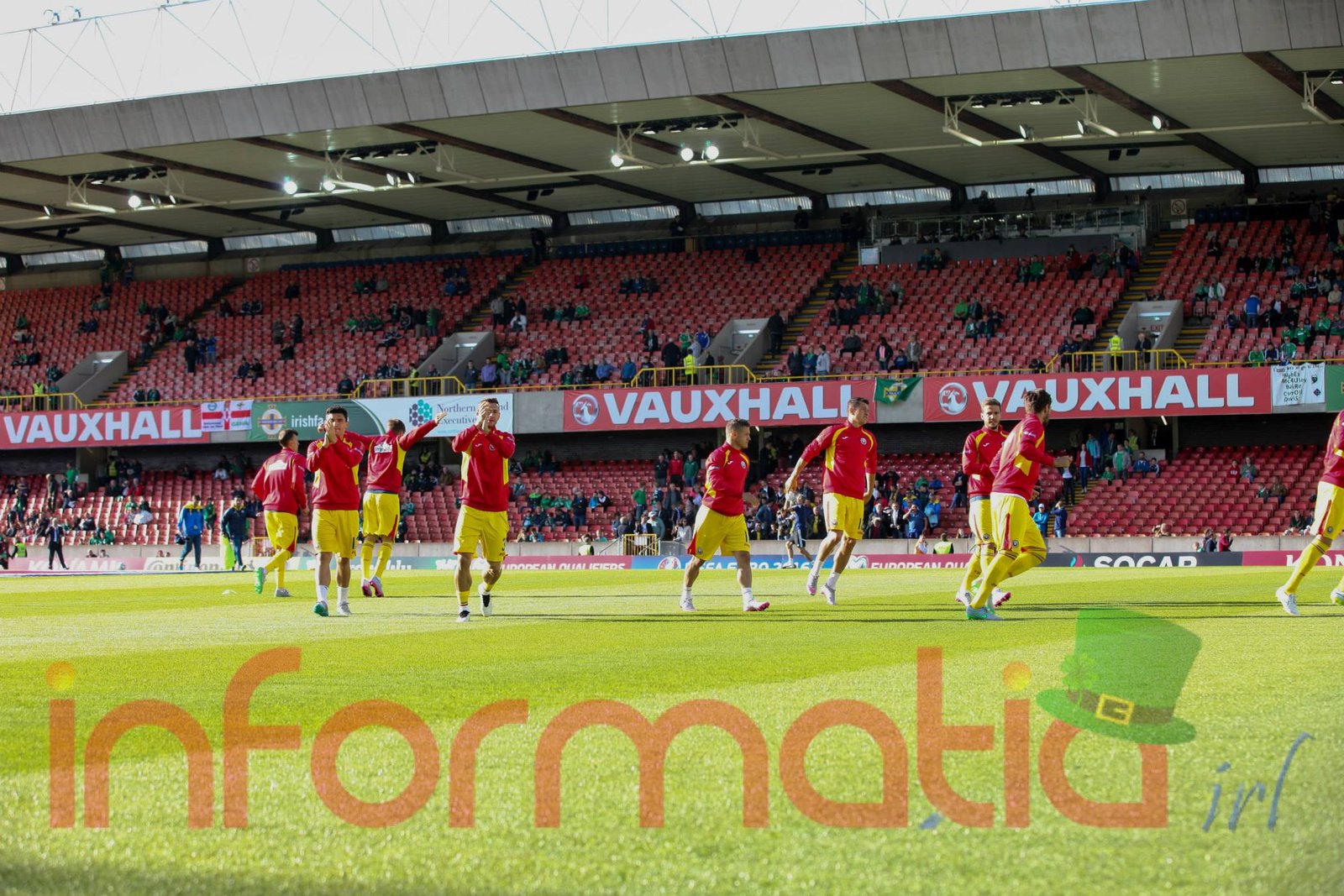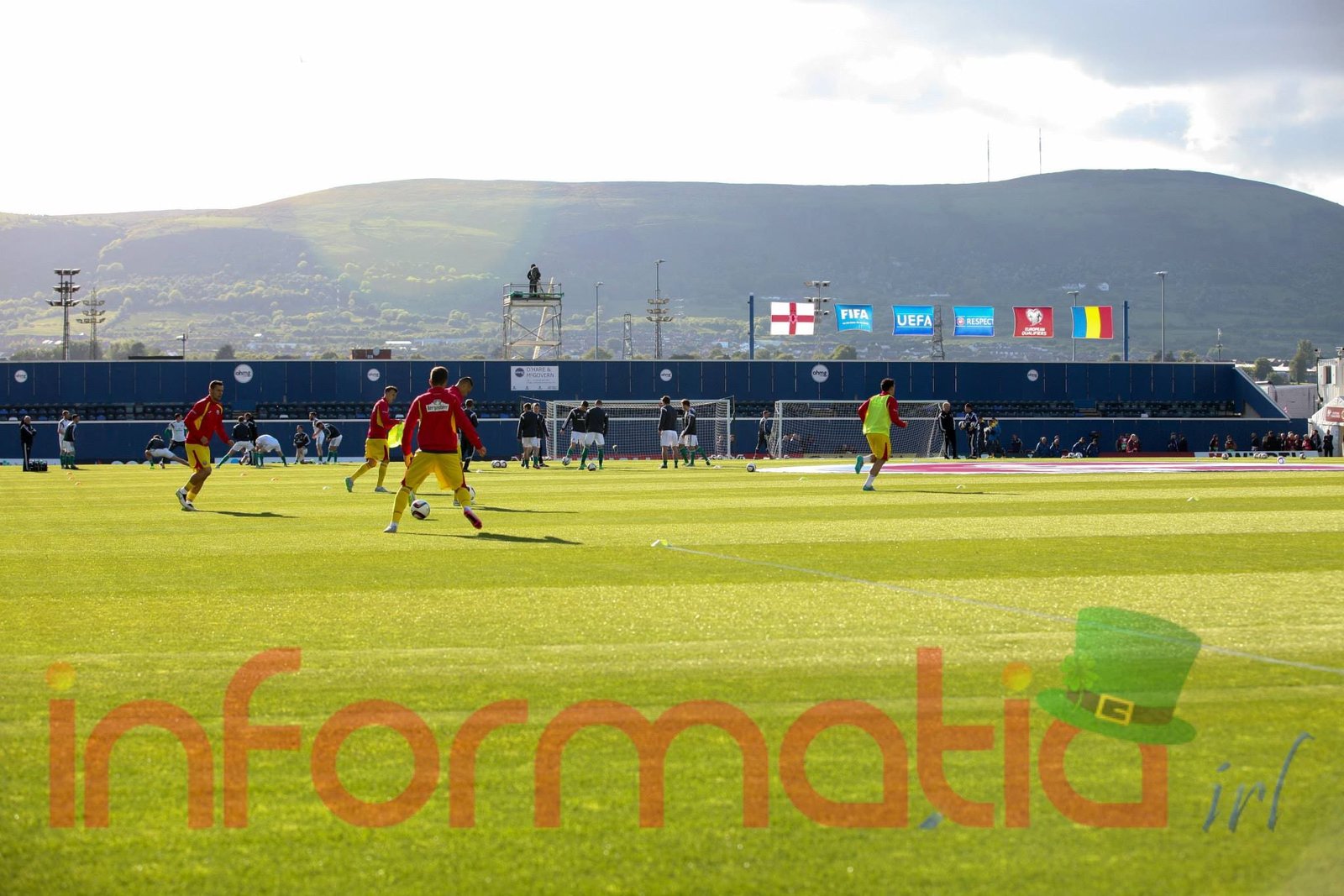 9.39 Jucatorii celor doua echipe ies pe teren, Jucatorii nostri in galben complet, irlandezii cu tricouri verzi si sorturi albe. Acum se canta imnul Romaniei