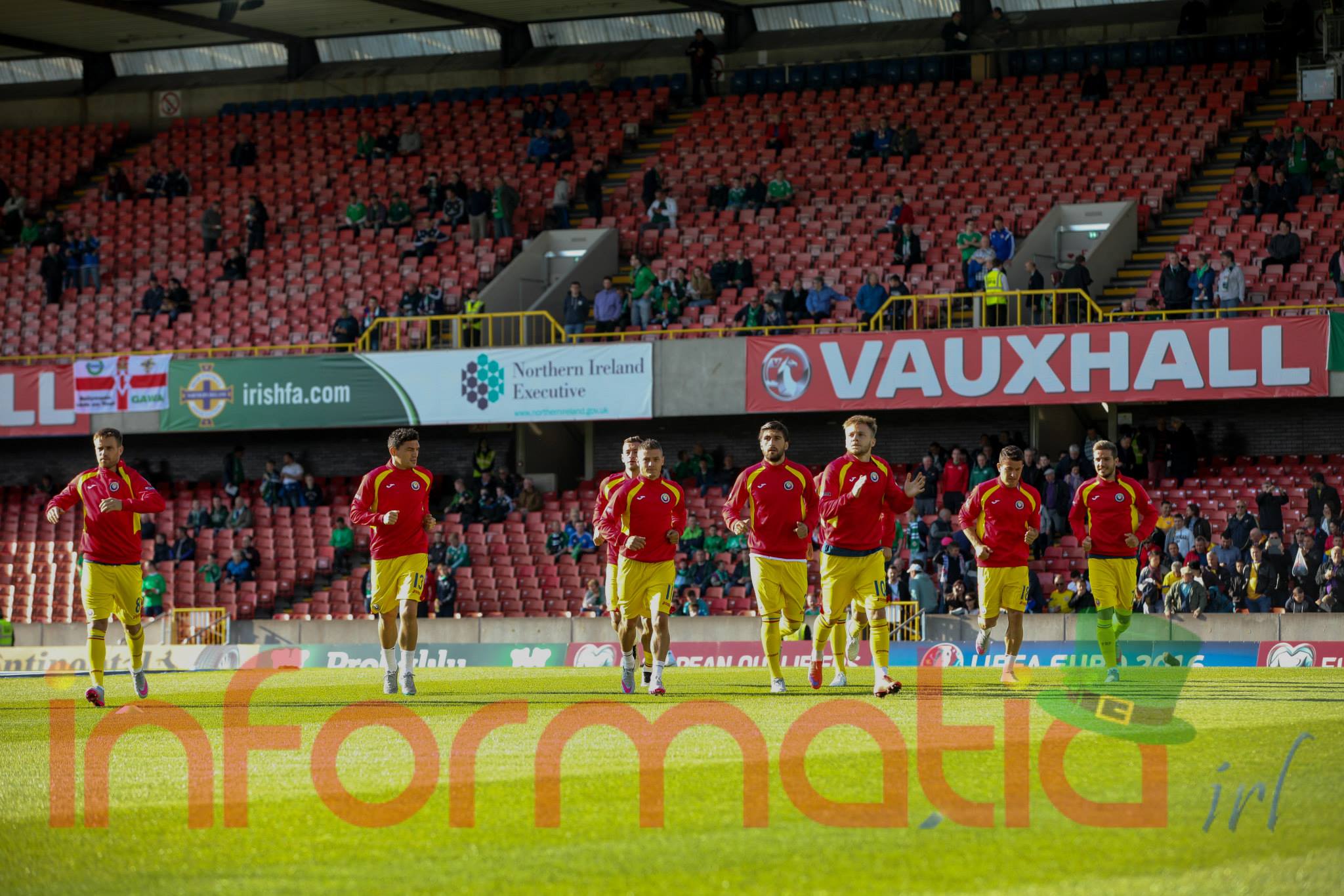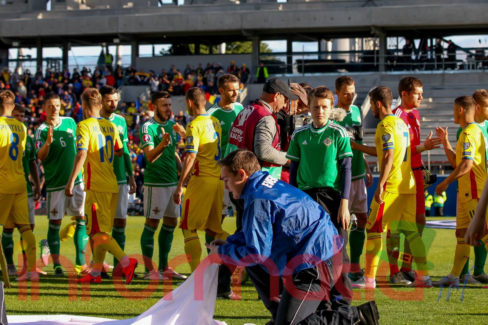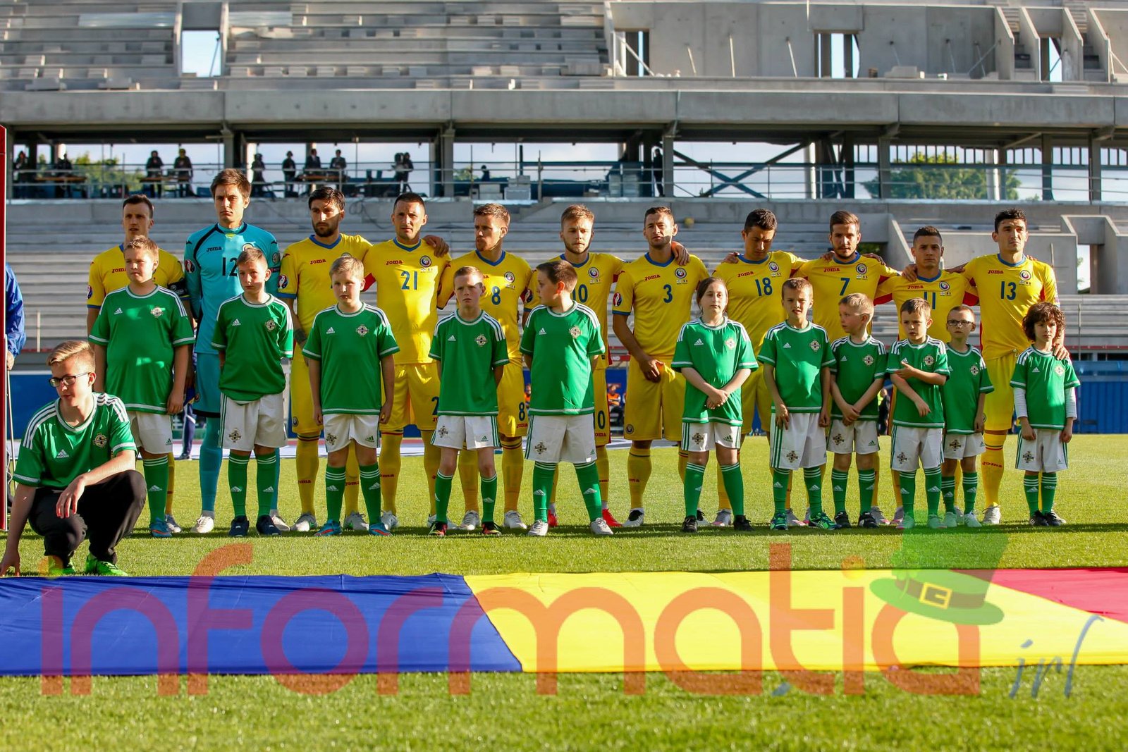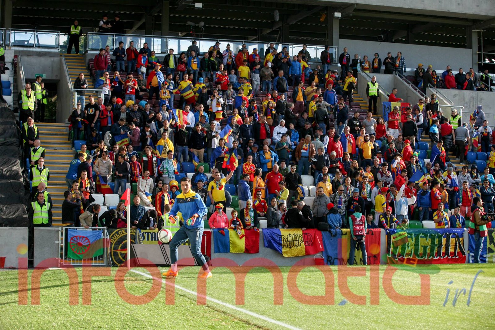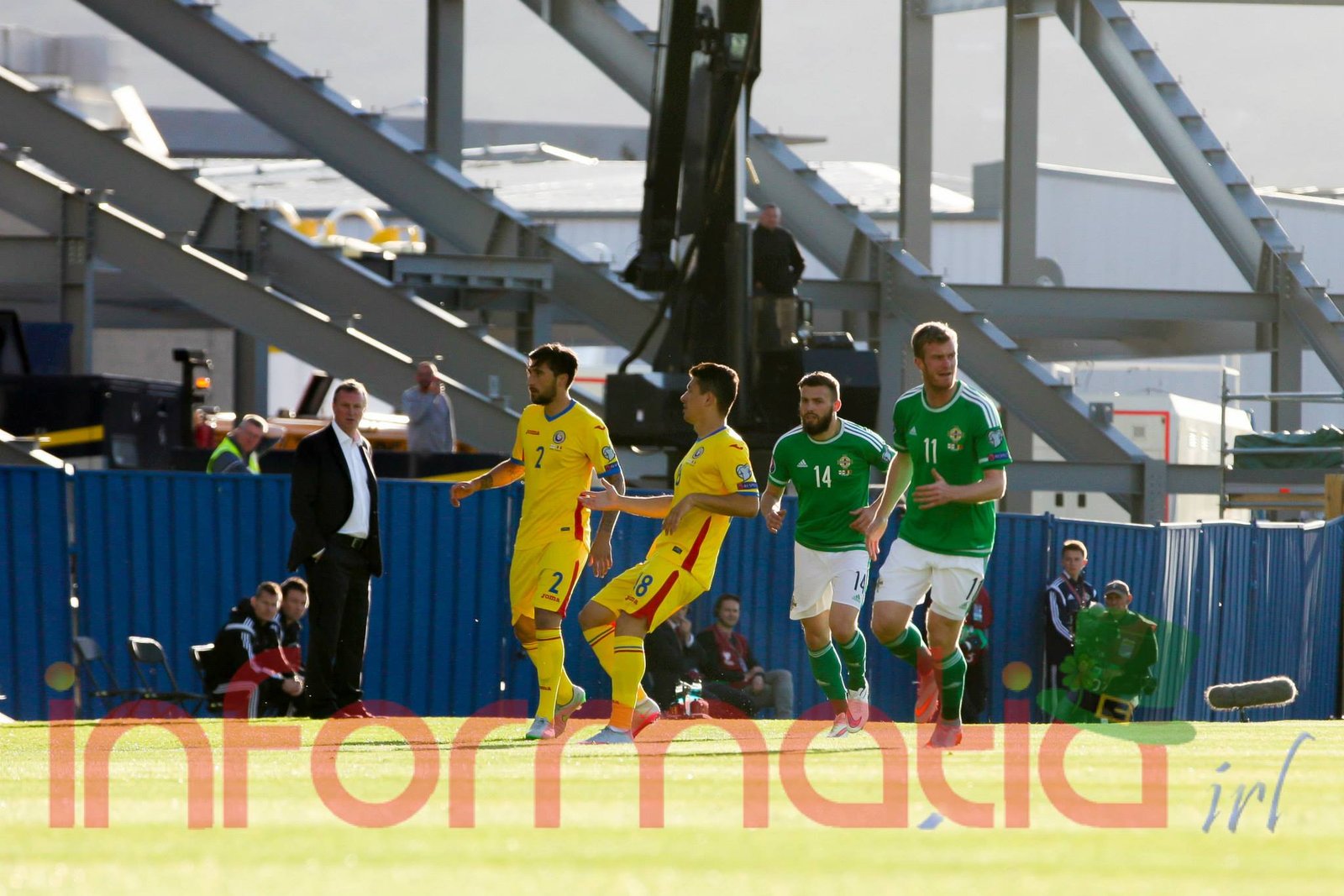9.39 Jucatorii celor doua echipe ies pe teren, Jucatorii nostri in galben complet, irlandezii cu tricouri verzi si sorturi albe. Acum se canta imnul Romaniei