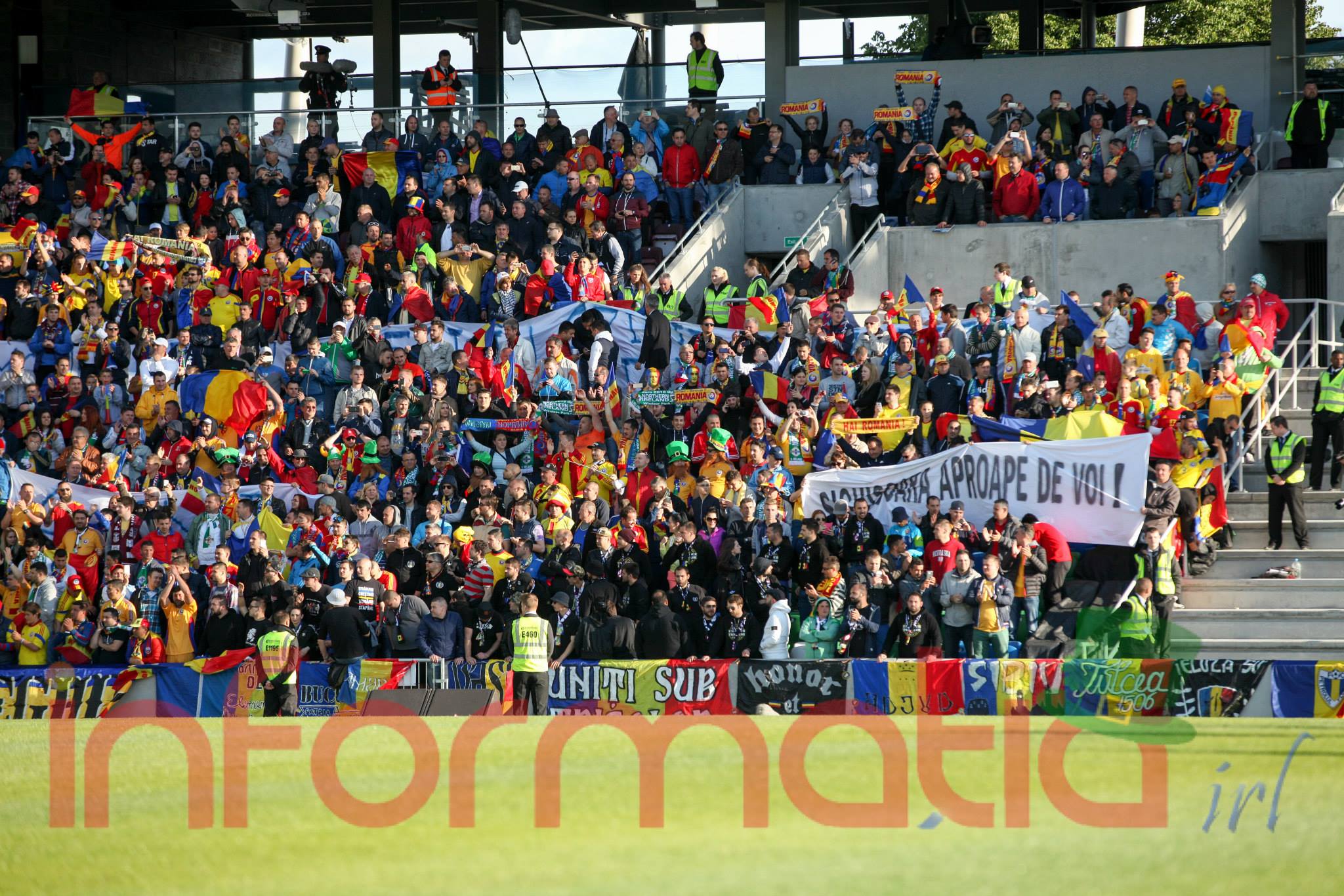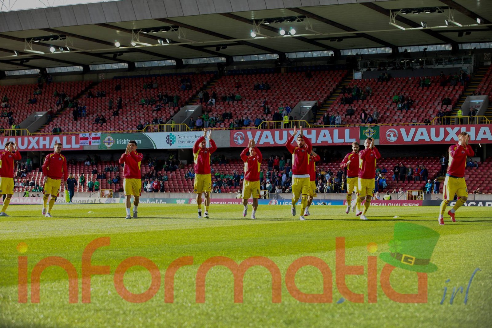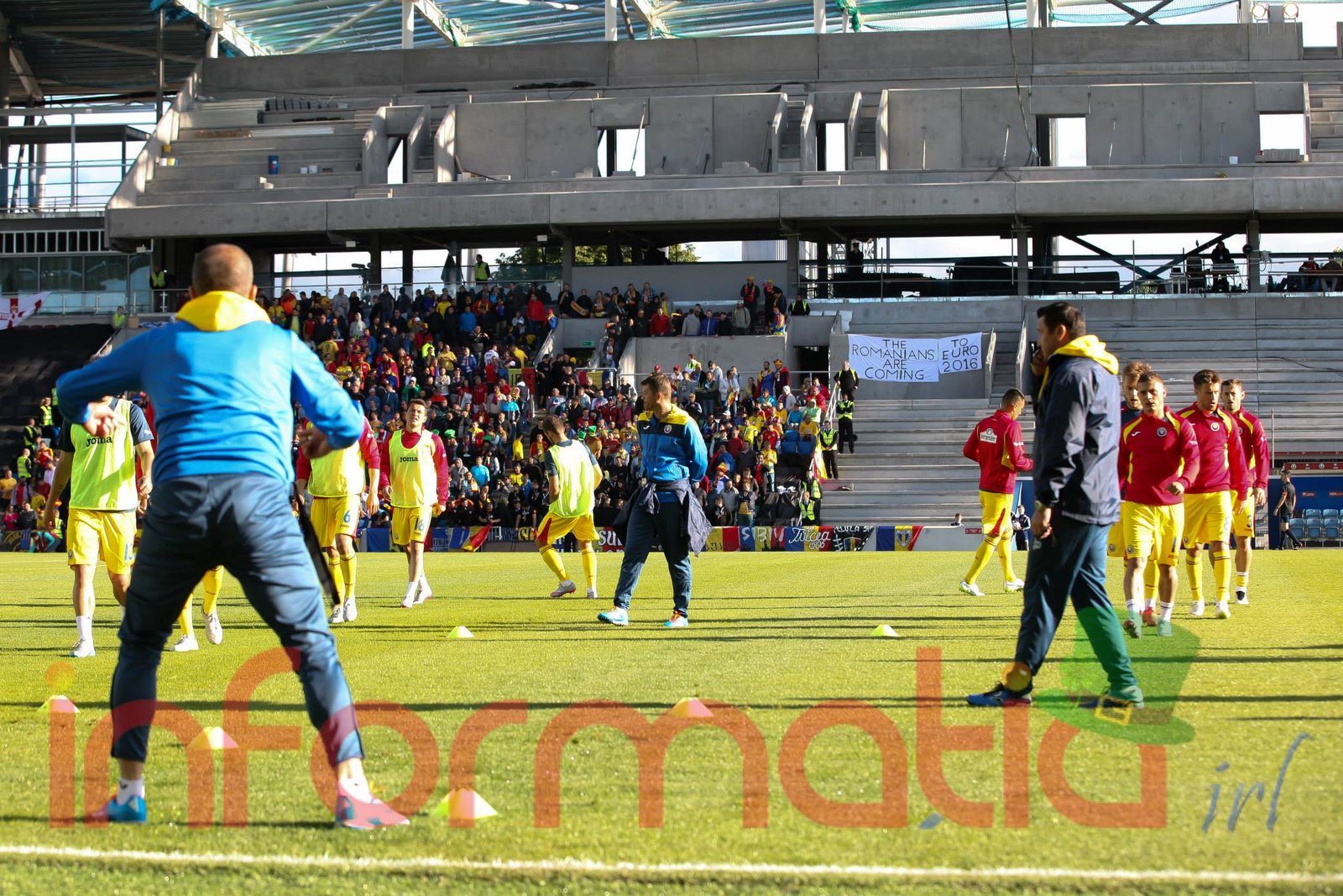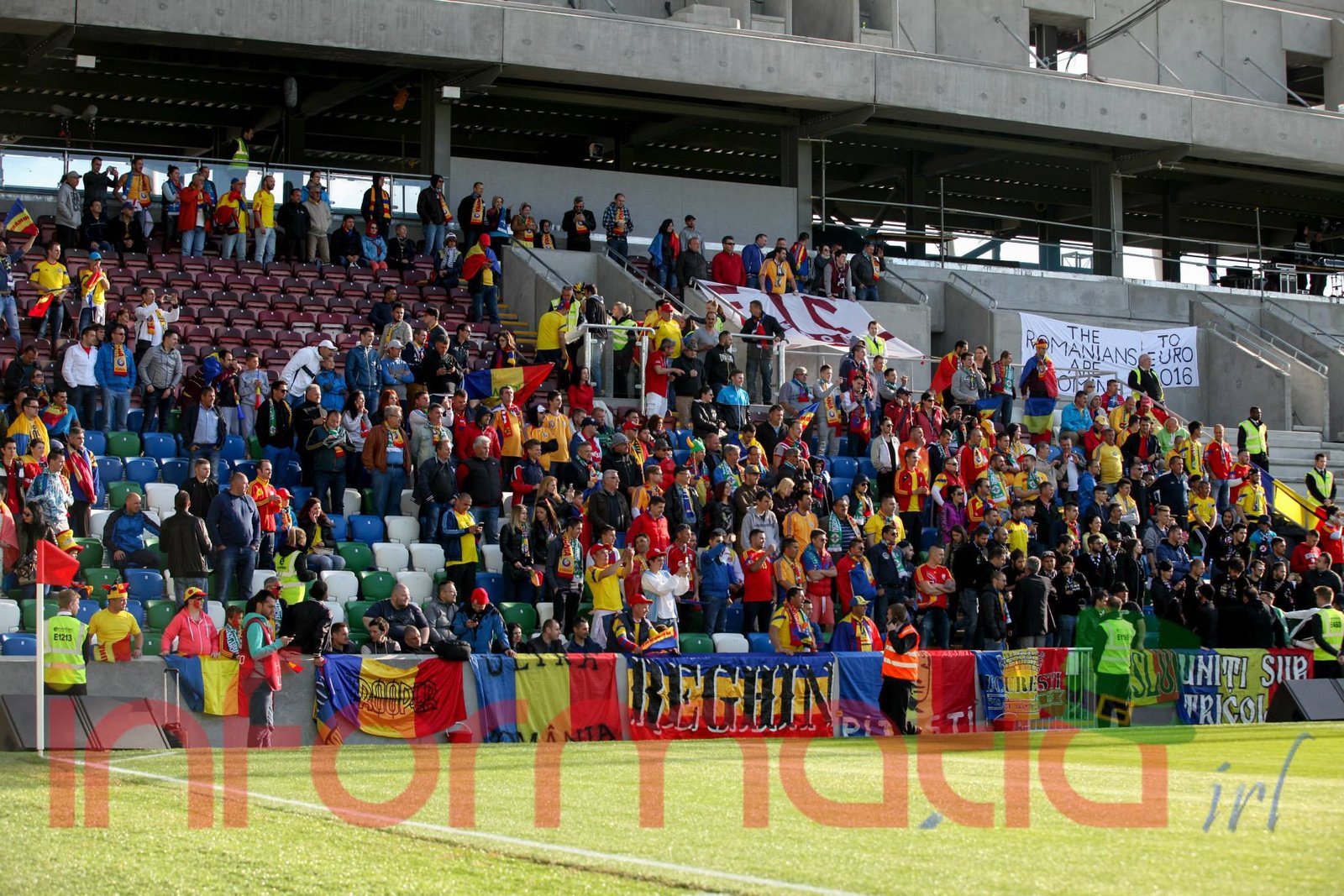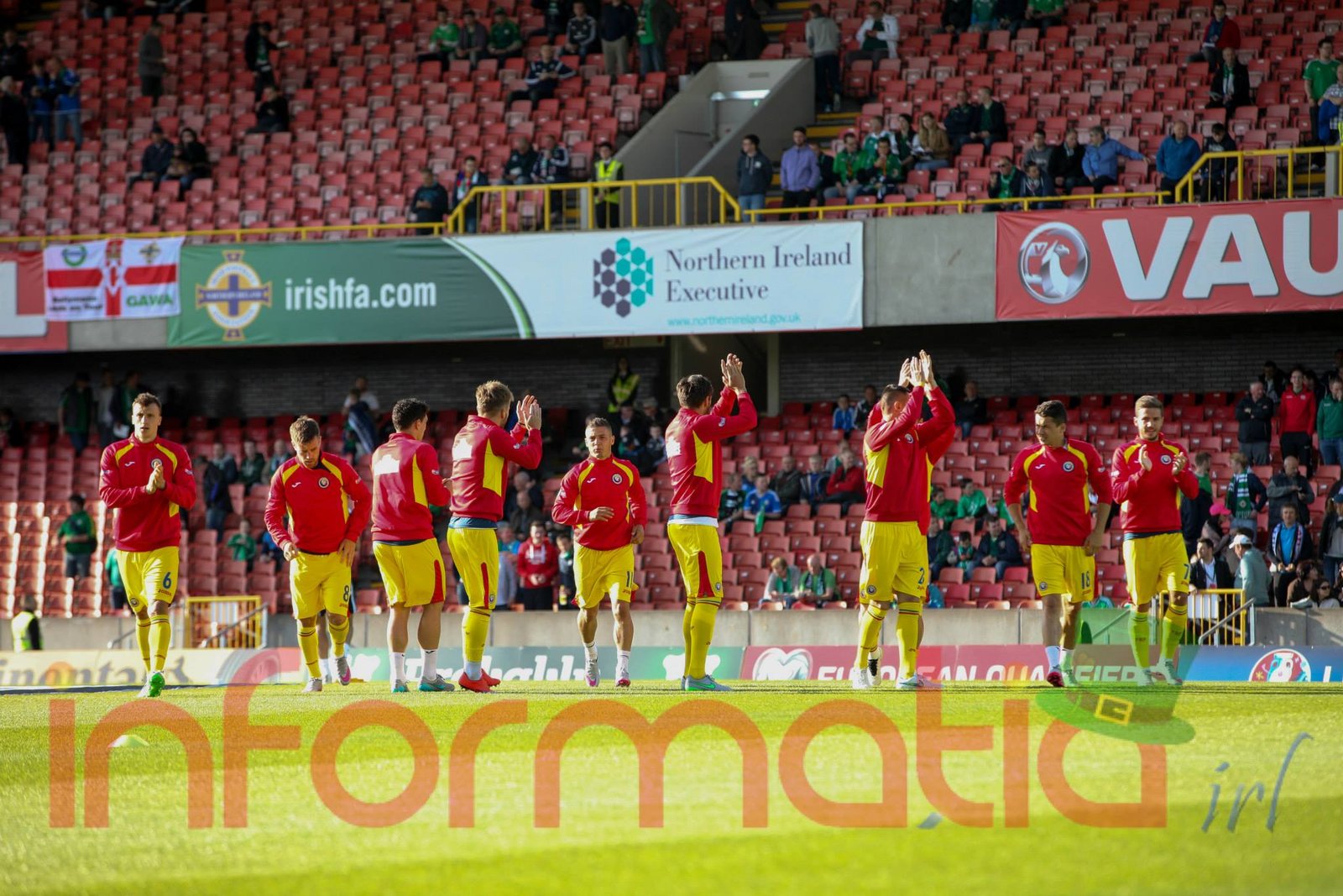 9.39 Jucatorii celor doua echipe ies pe teren, Jucatorii nostri in galben complet, irlandezii cu tricouri verzi si sorturi albe. Acum se canta imnul Romaniei