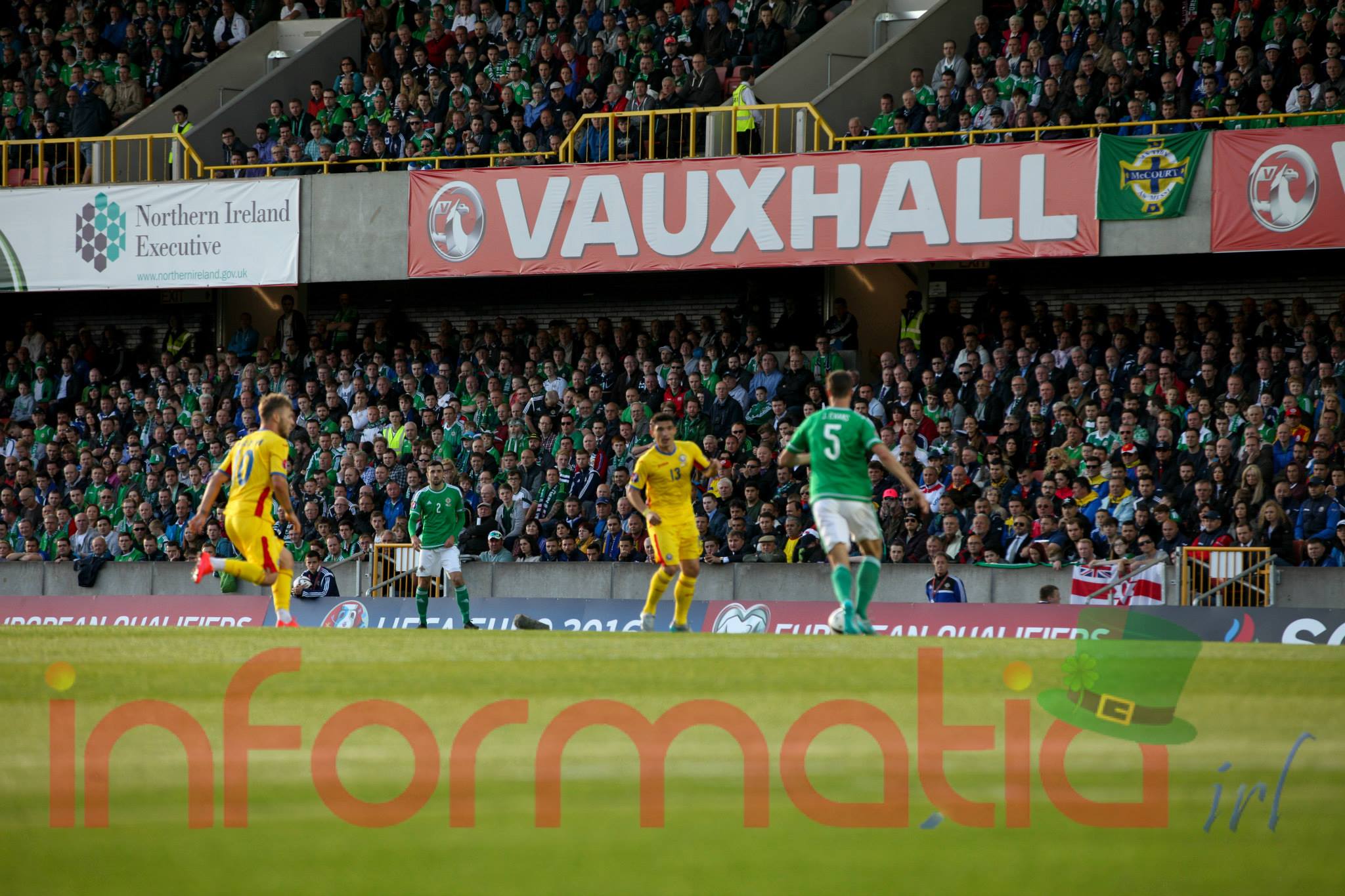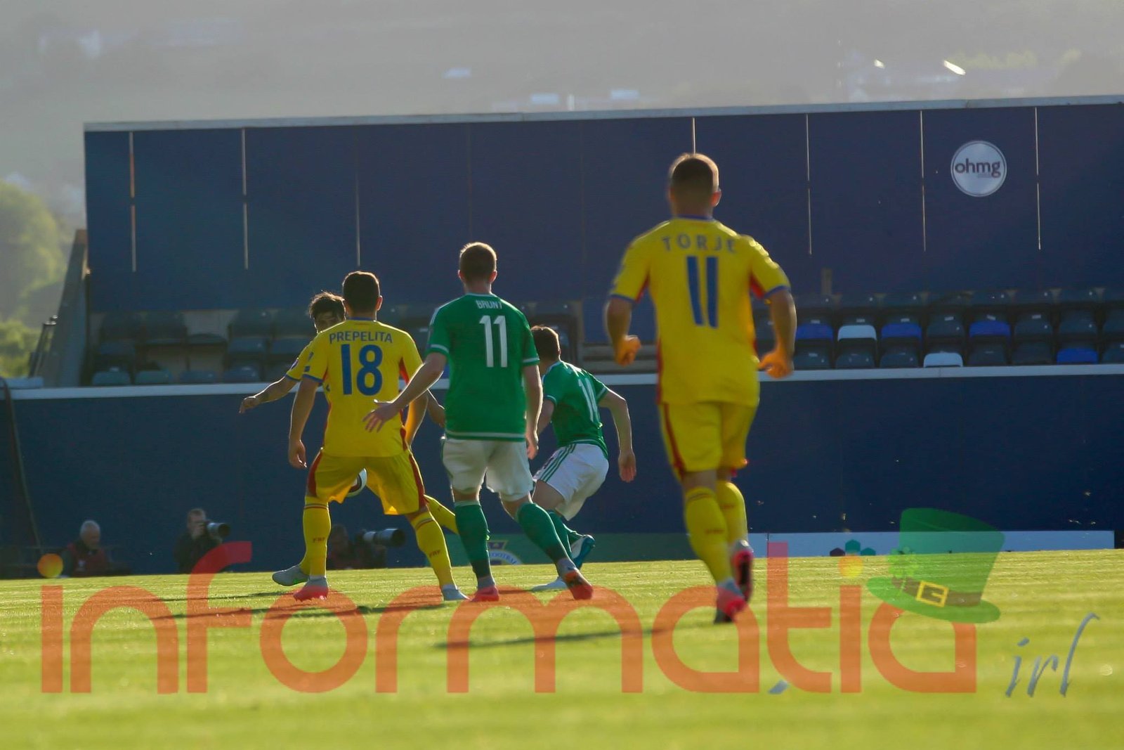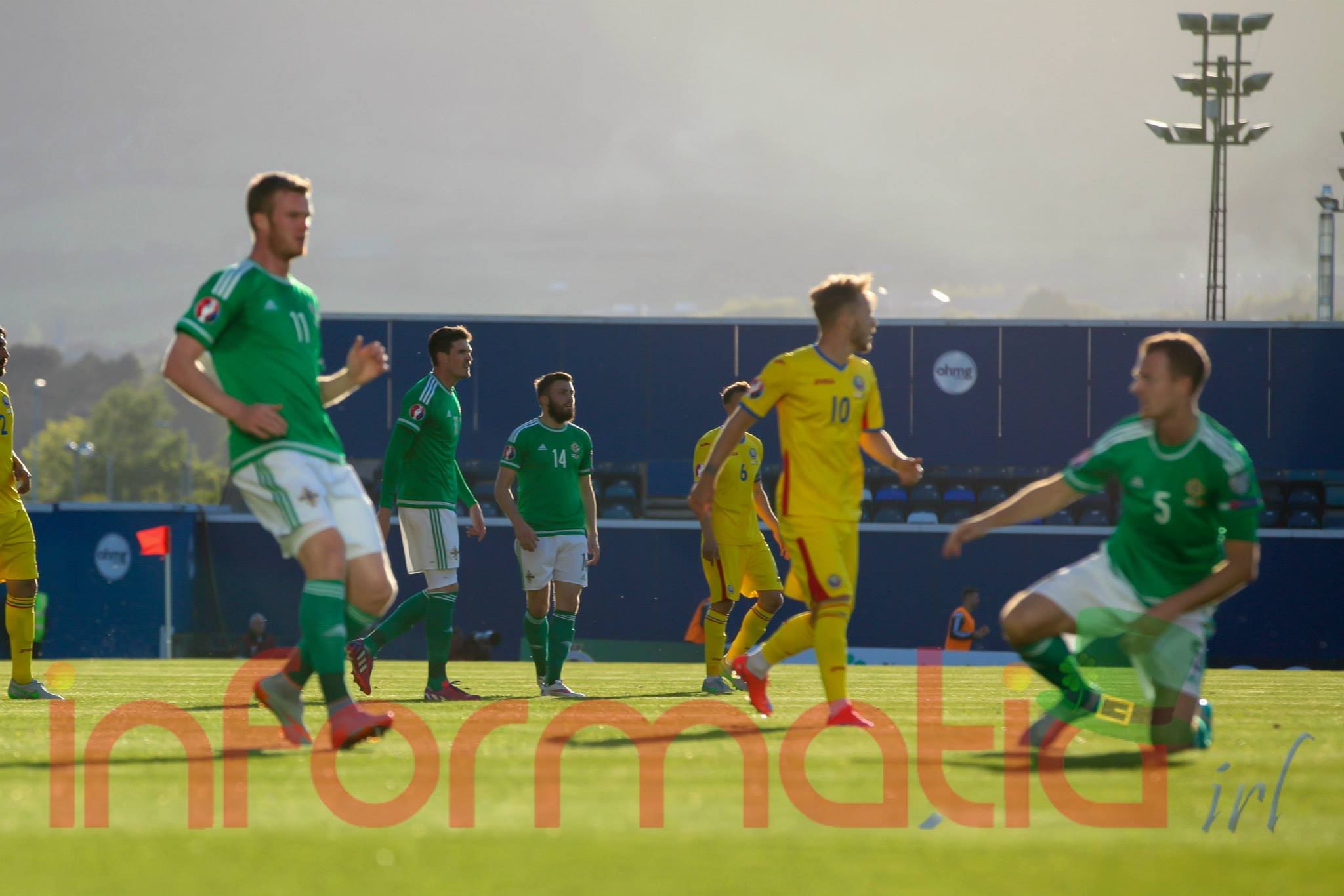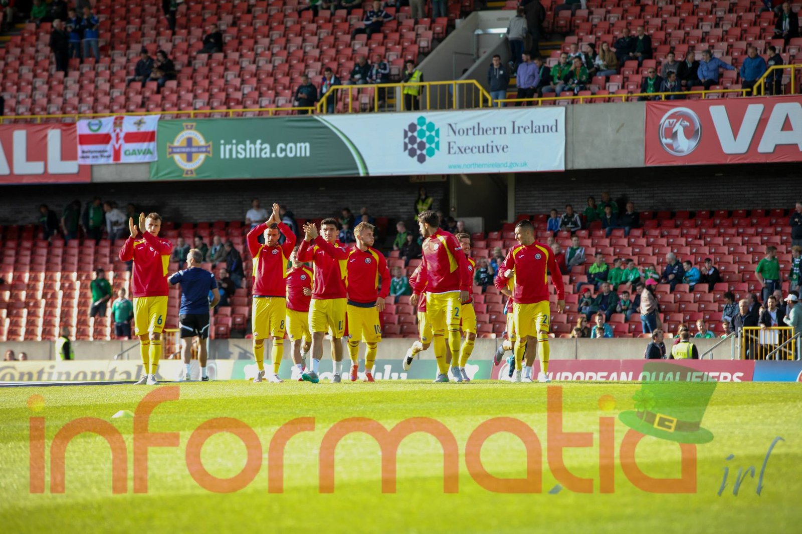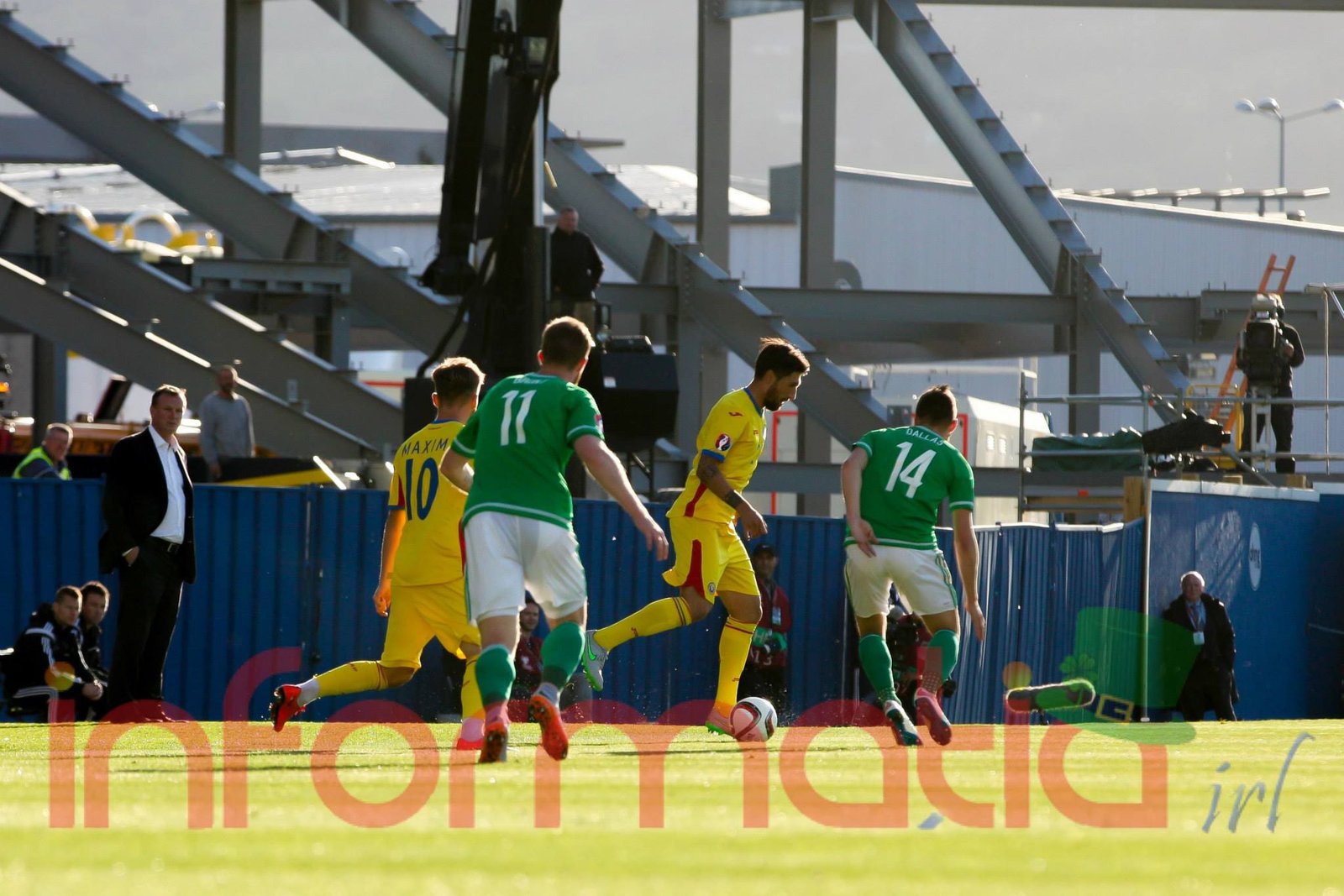 9.39 Jucatorii celor doua echipe ies pe teren, Jucatorii nostri in galben complet, irlandezii cu tricouri verzi si sorturi albe. Acum se canta imnul Romaniei