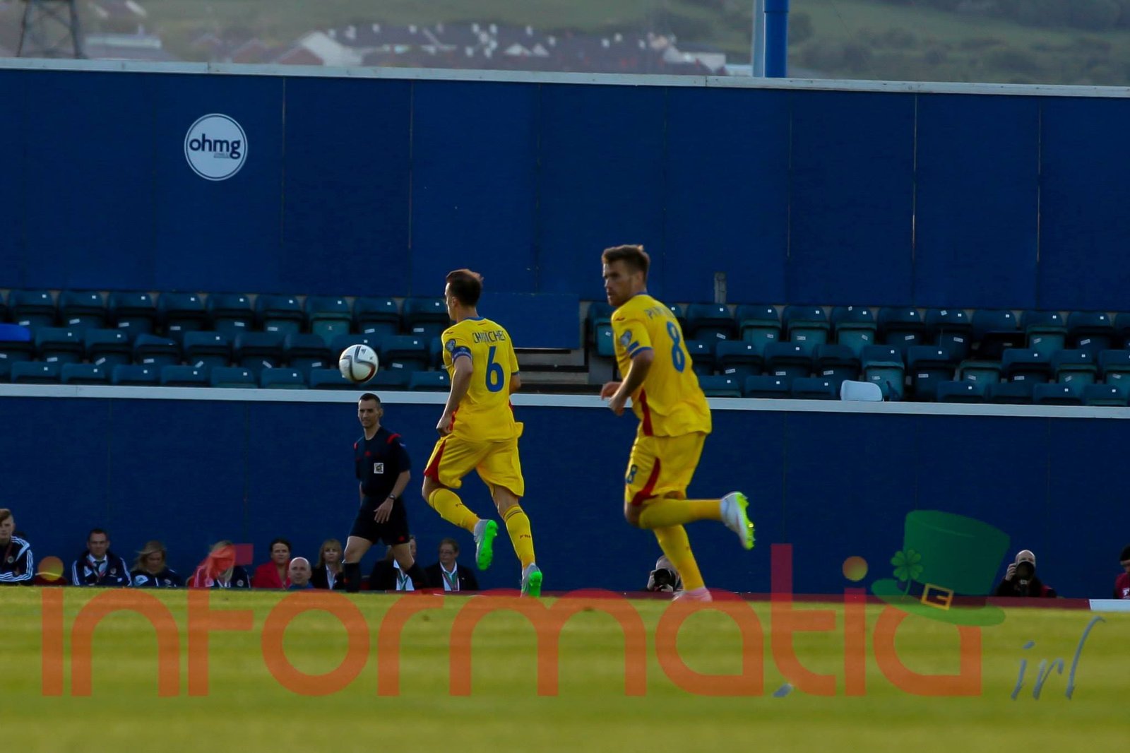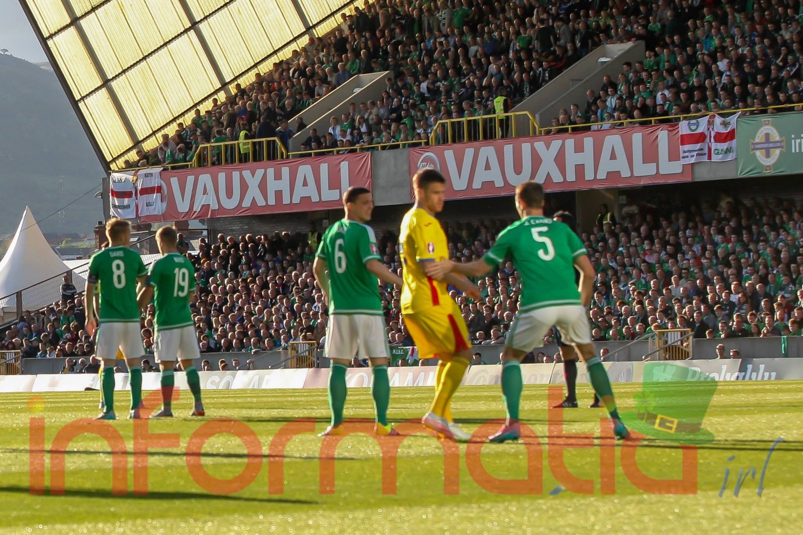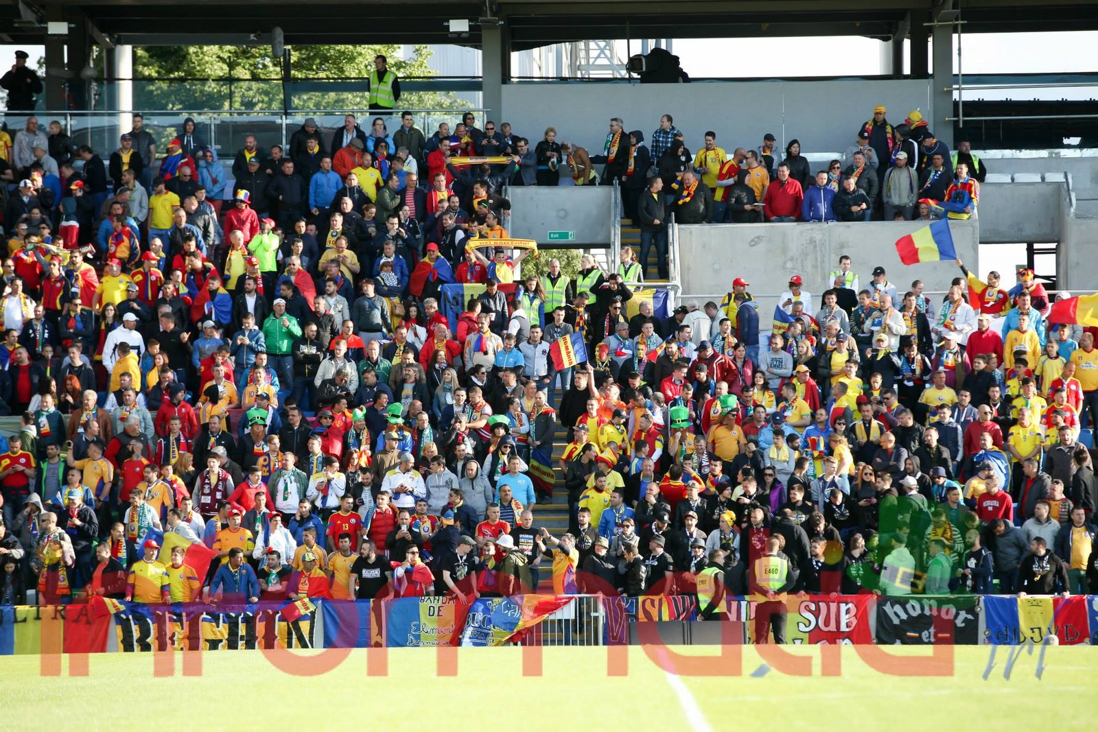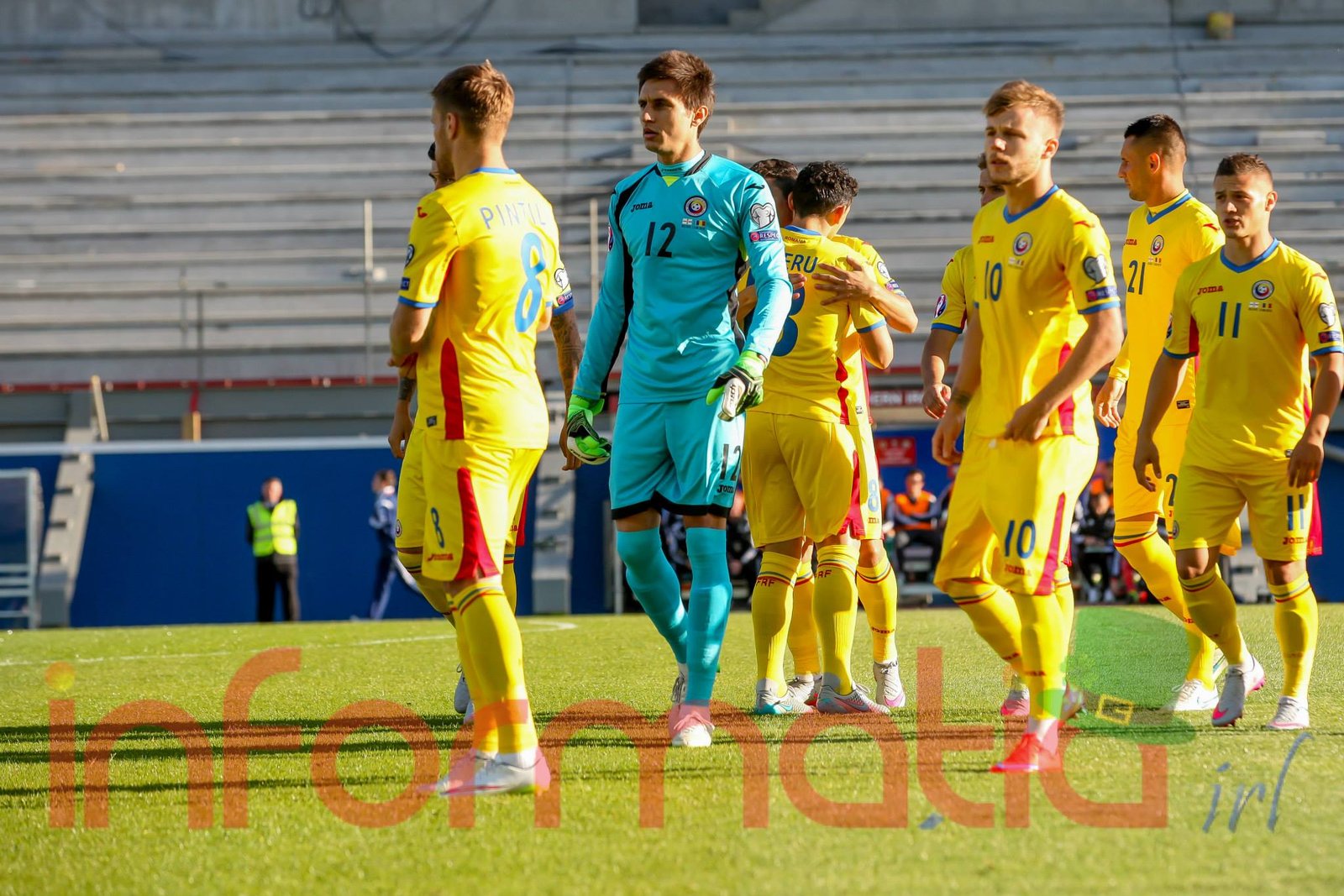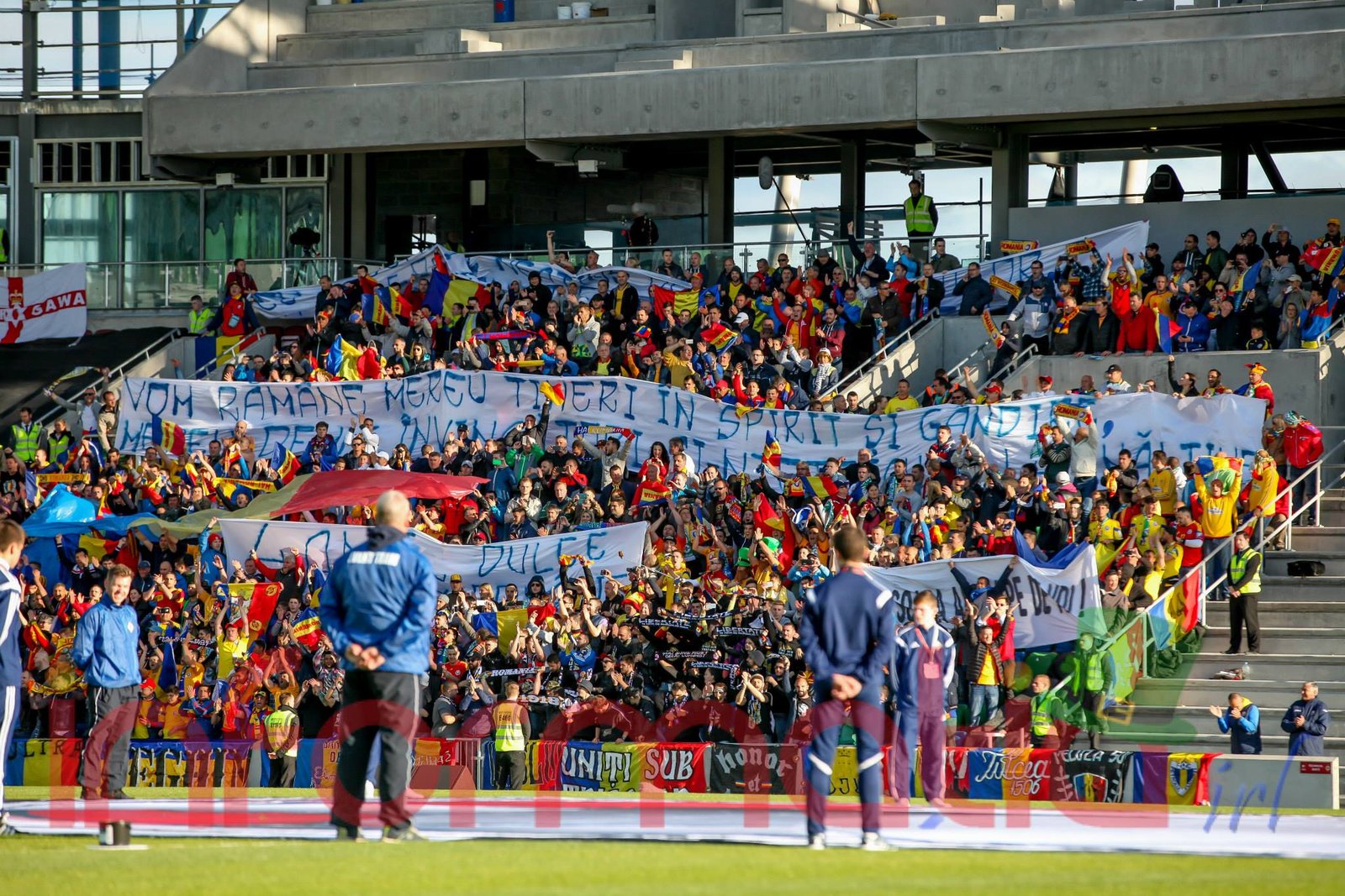 9.39 Jucatorii celor doua echipe ies pe teren, Jucatorii nostri in galben complet, irlandezii cu tricouri verzi si sorturi albe. Acum se canta imnul Romaniei