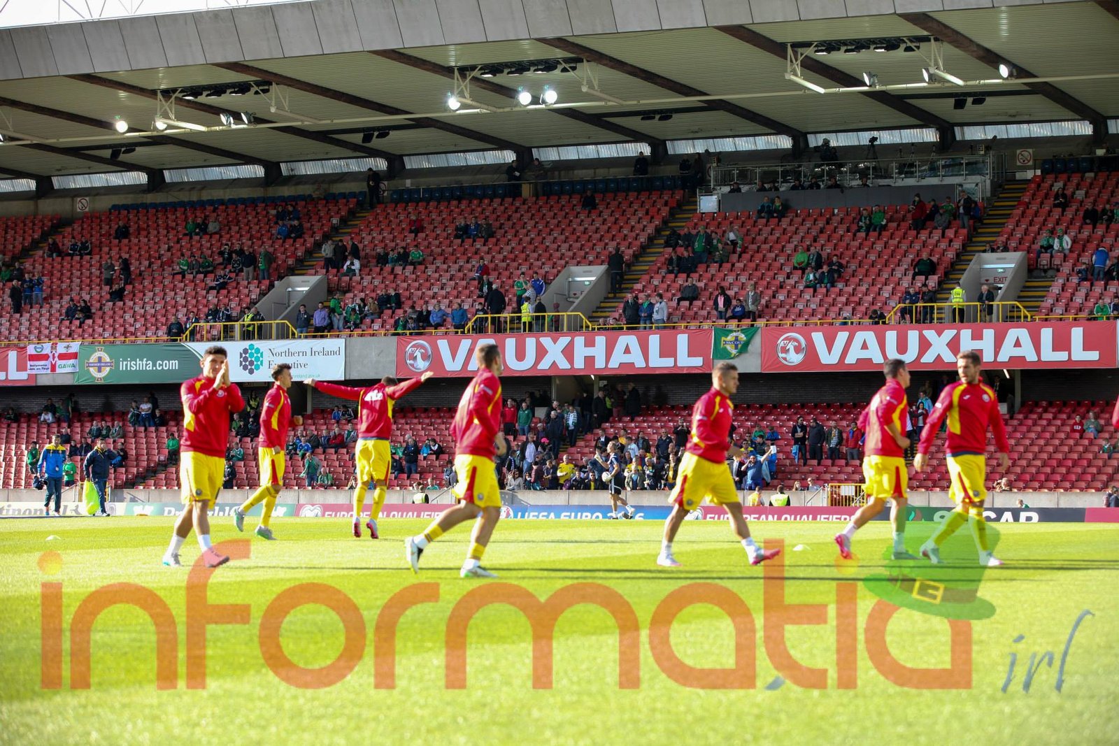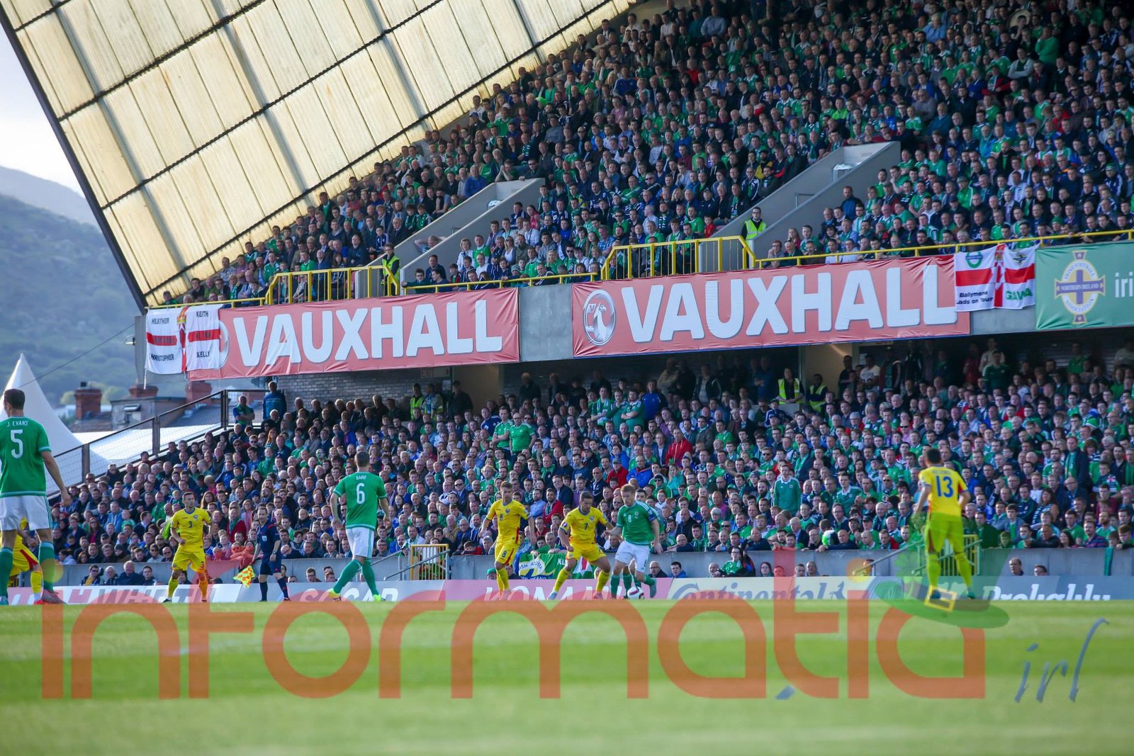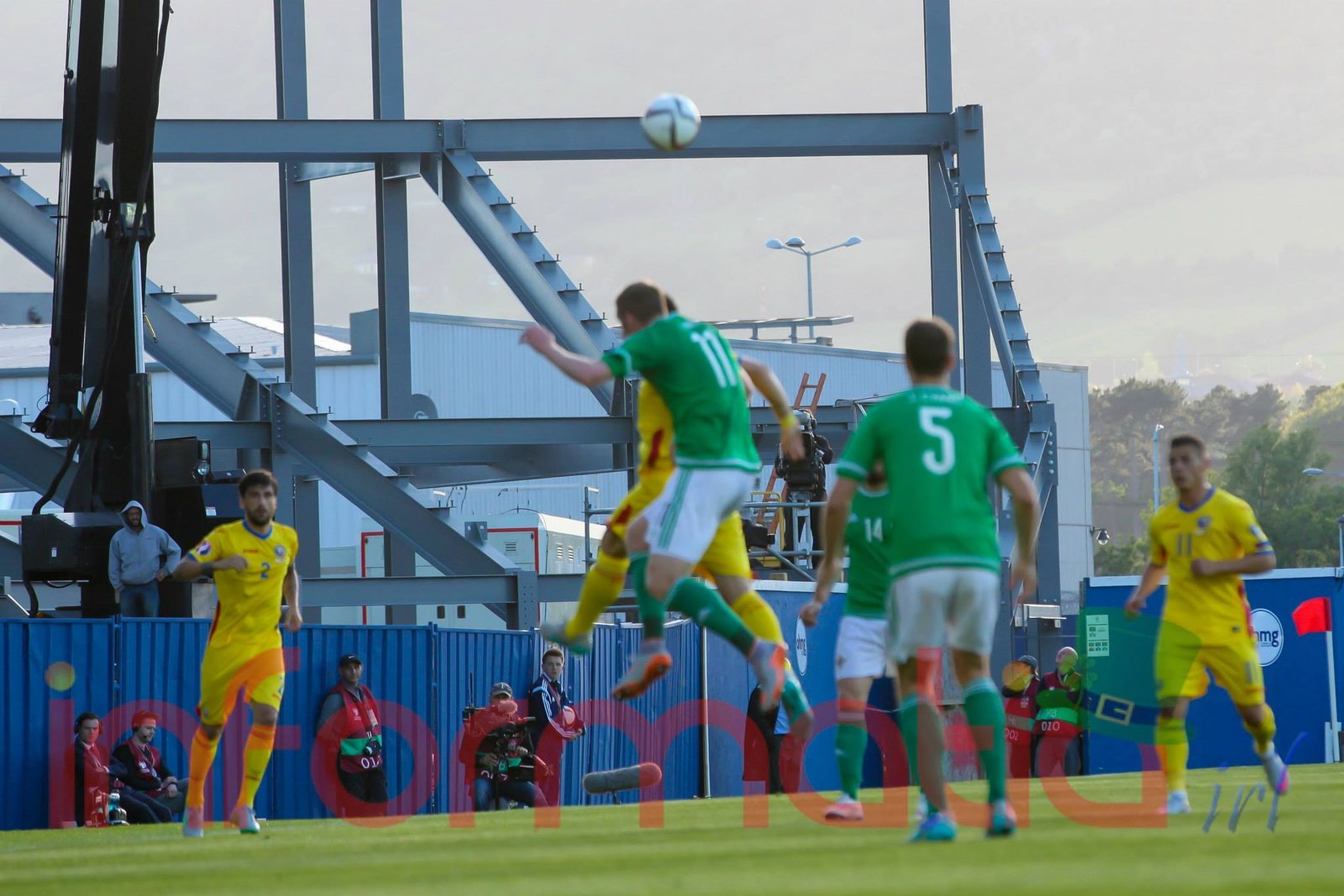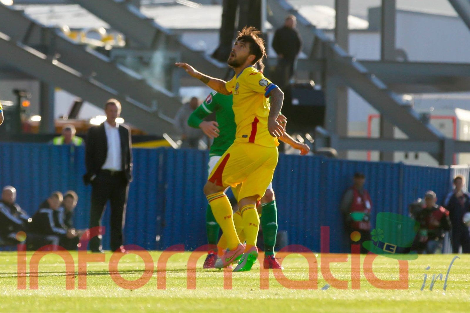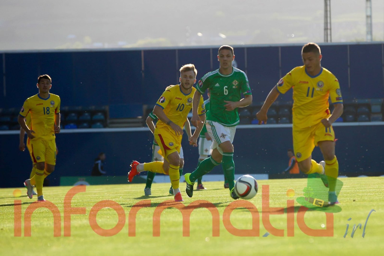 9.39 Jucatorii celor doua echipe ies pe teren, Jucatorii nostri in galben complet, irlandezii cu tricouri verzi si sorturi albe. Acum se canta imnul Romaniei