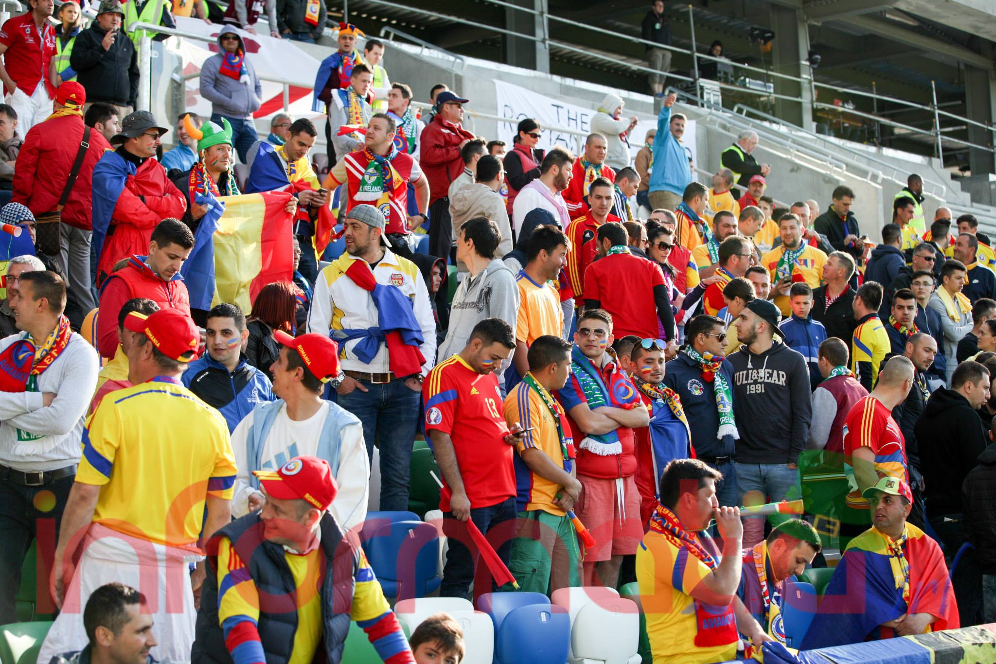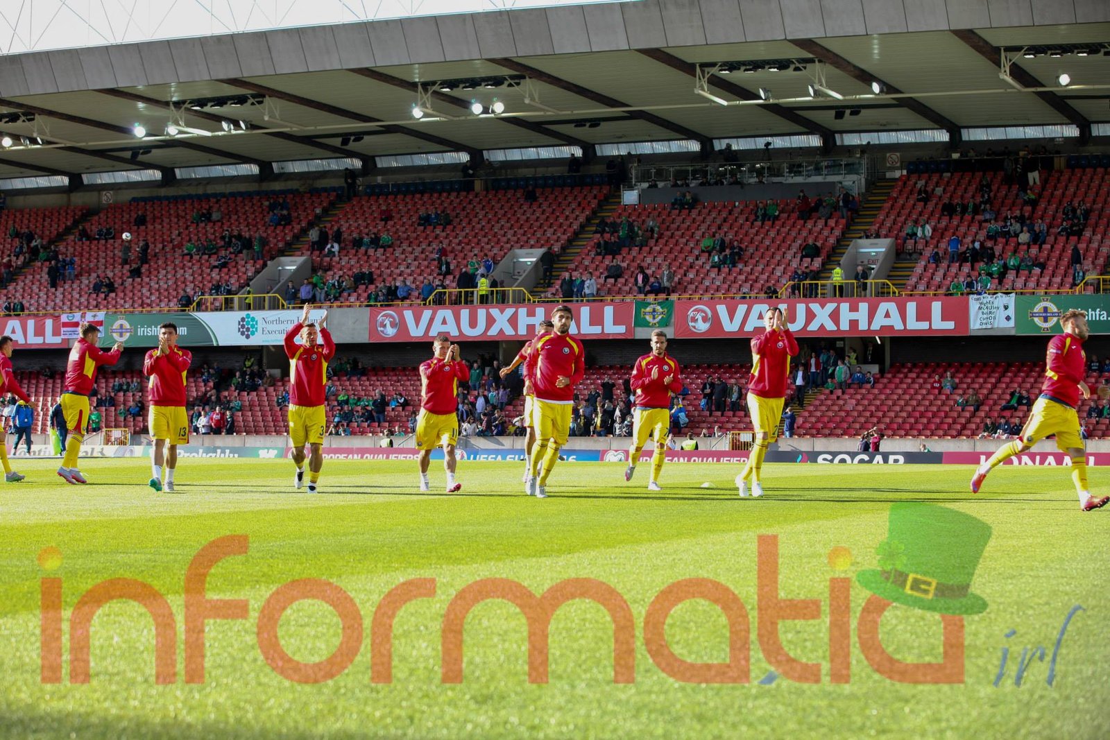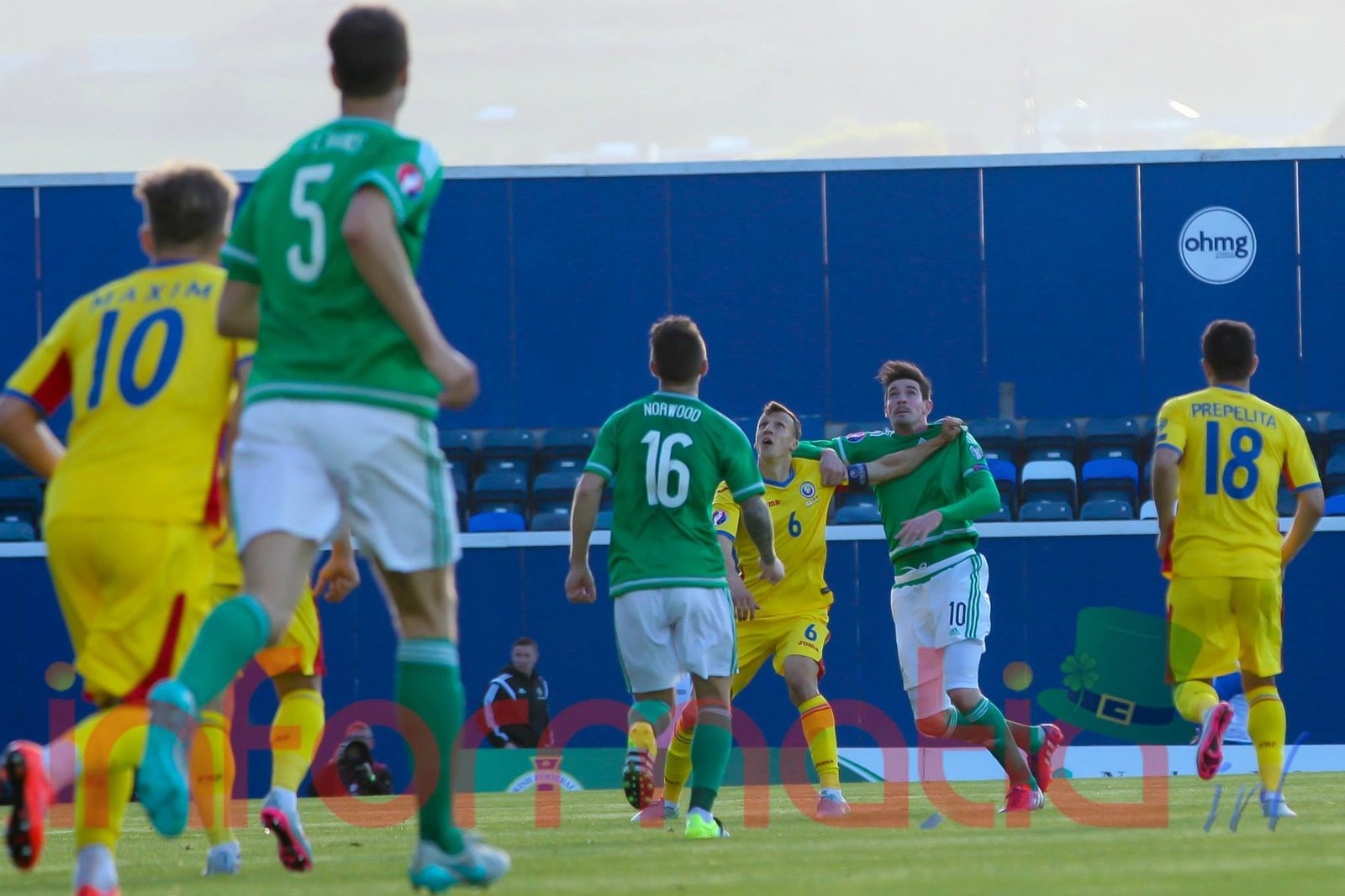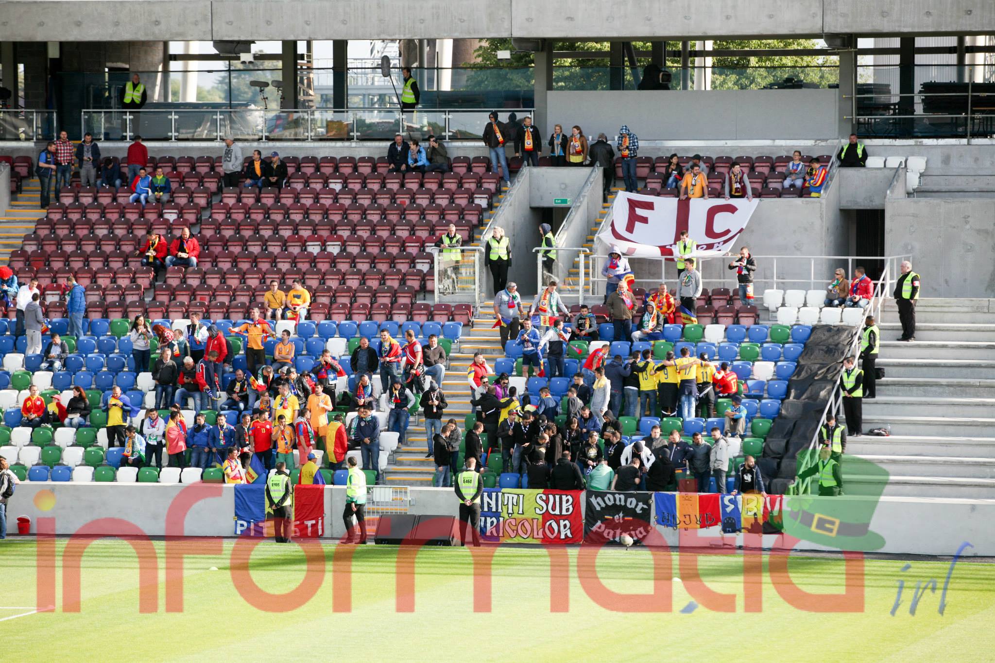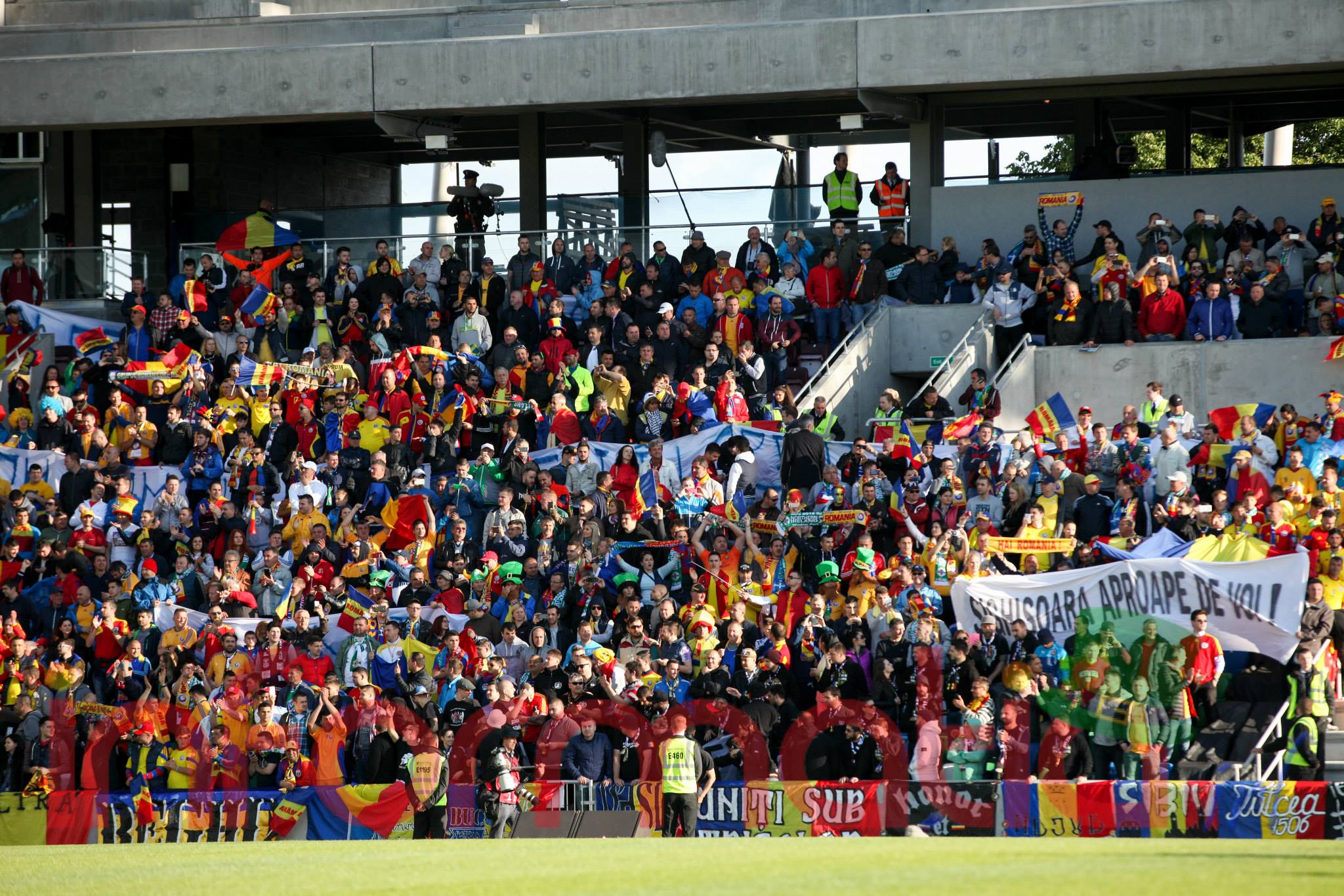 9.39 Jucatorii celor doua echipe ies pe teren, Jucatorii nostri in galben complet, irlandezii cu tricouri verzi si sorturi albe. Acum se canta imnul Romaniei