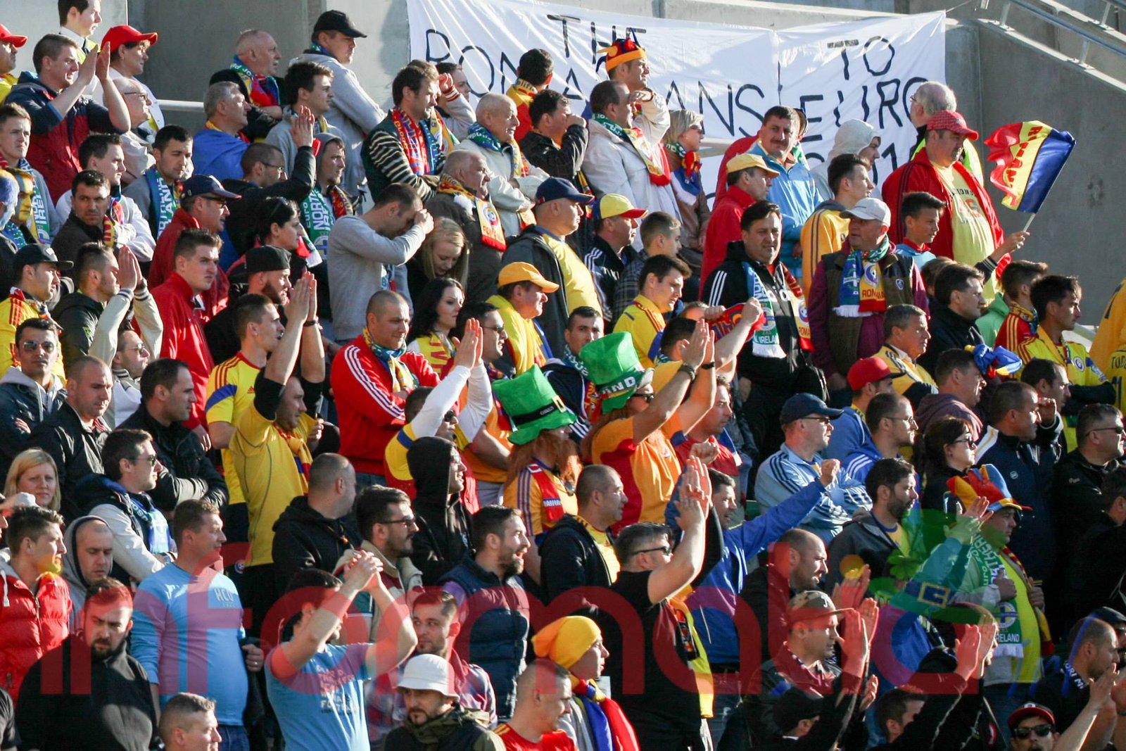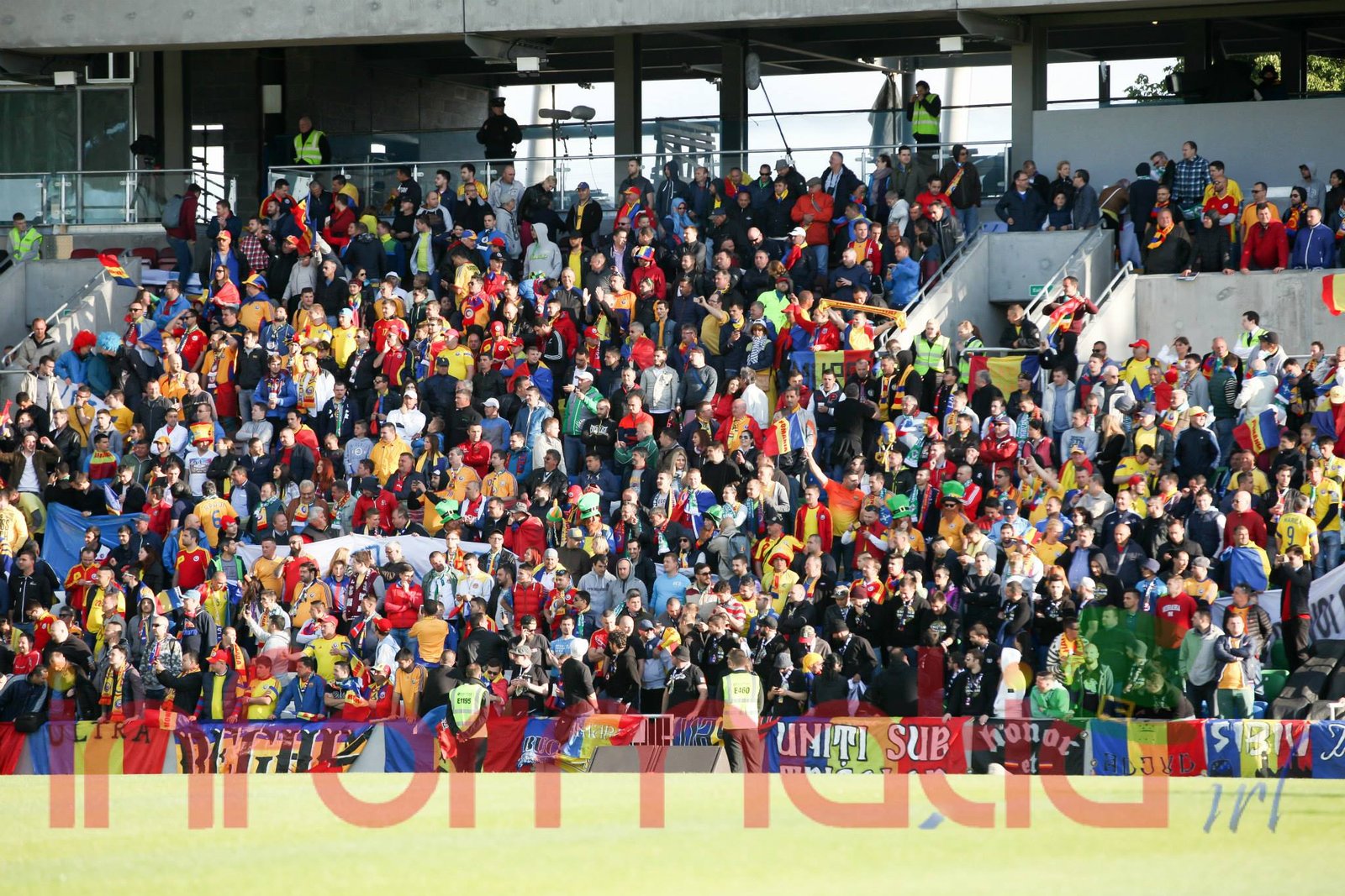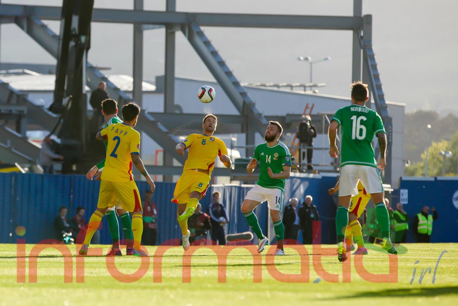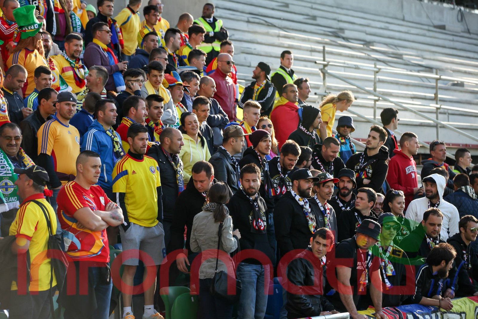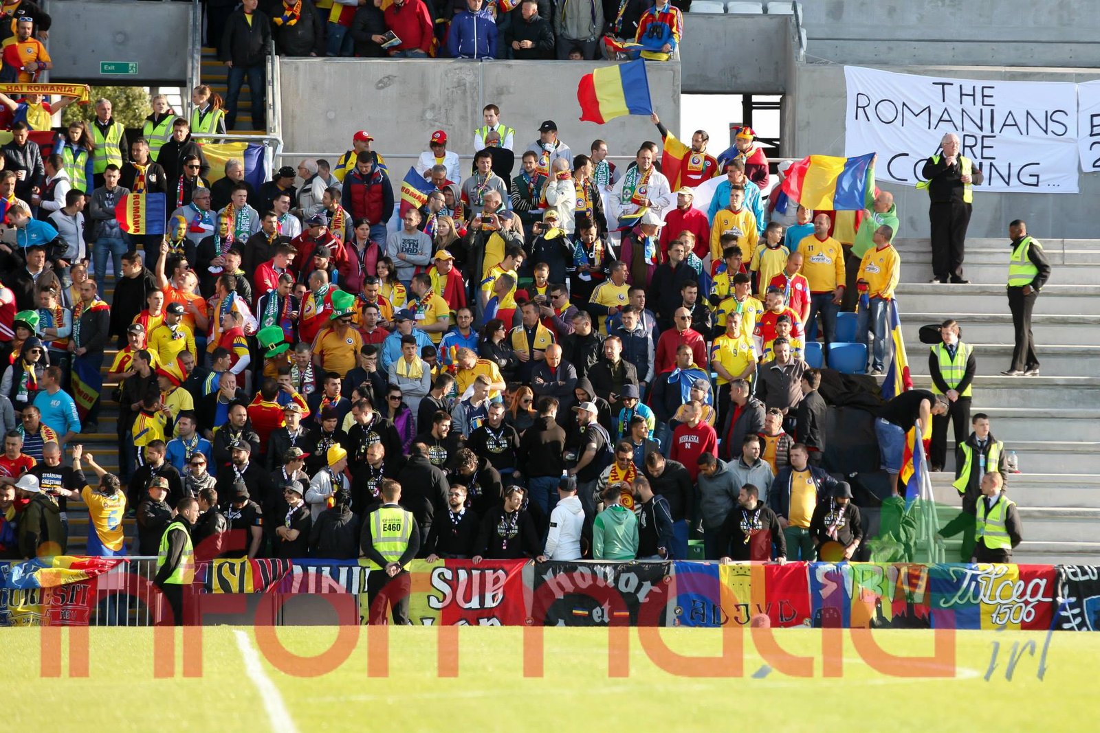 9.39 Jucatorii celor doua echipe ies pe teren, Jucatorii nostri in galben complet, irlandezii cu tricouri verzi si sorturi albe. Acum se canta imnul Romaniei