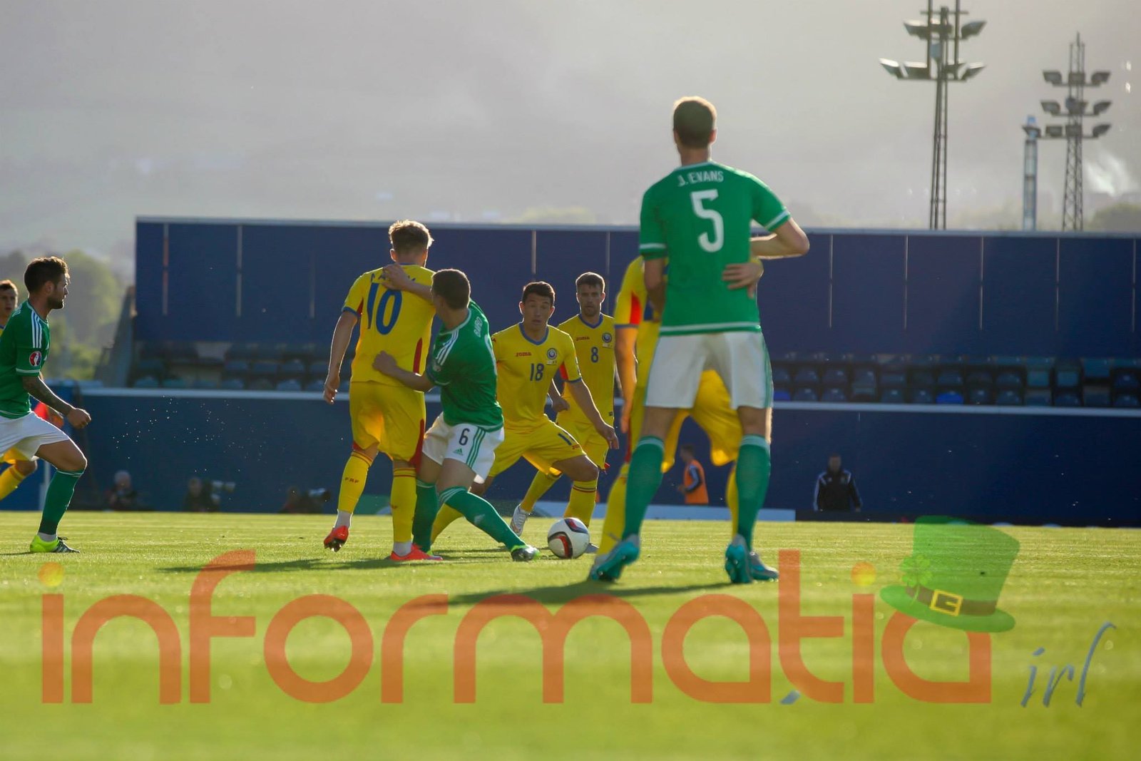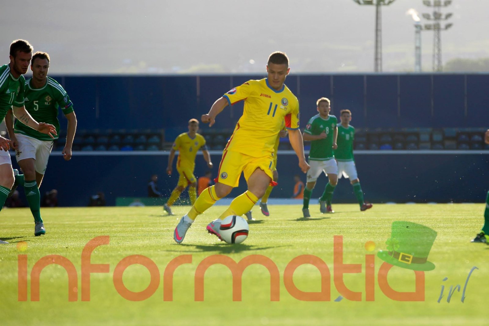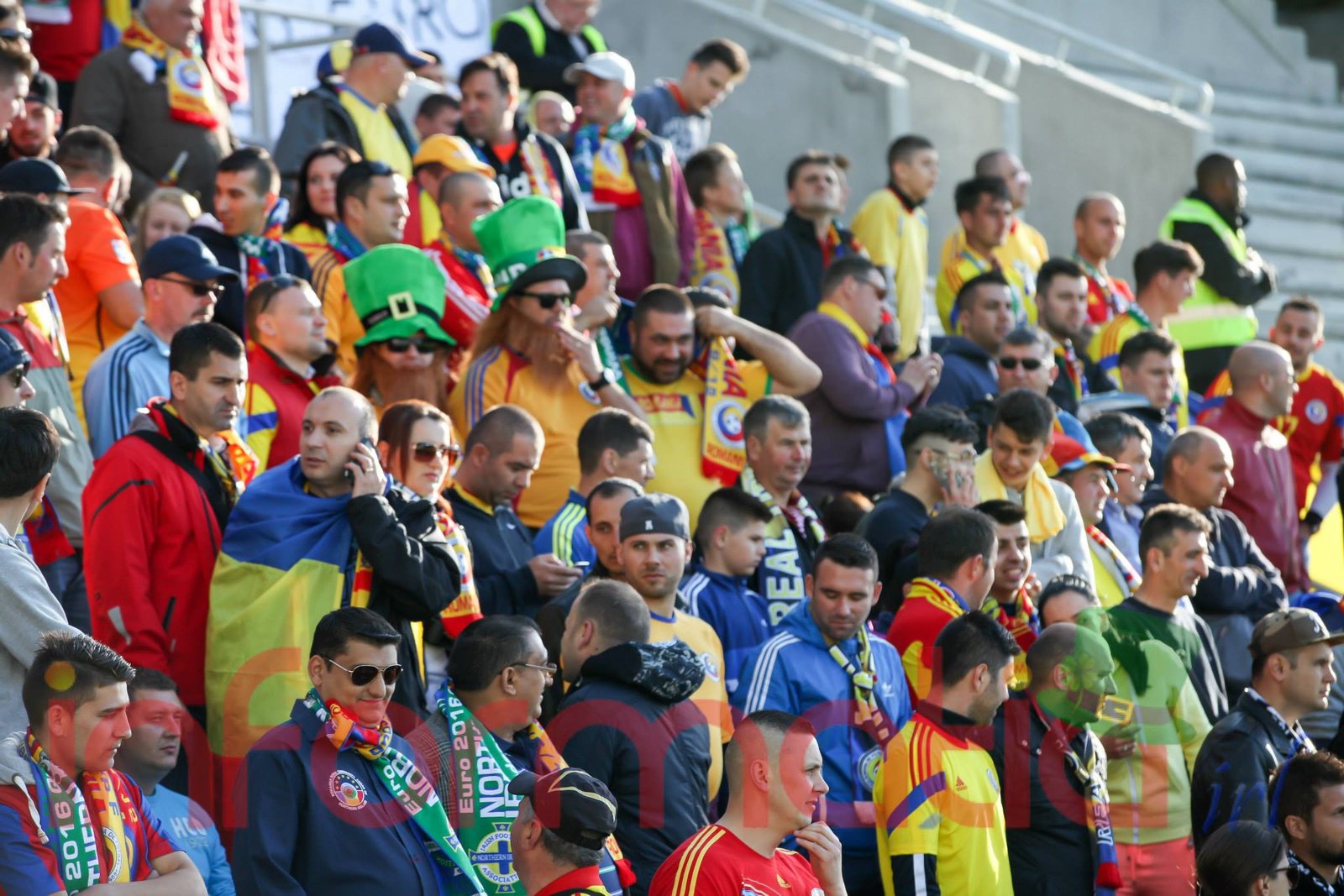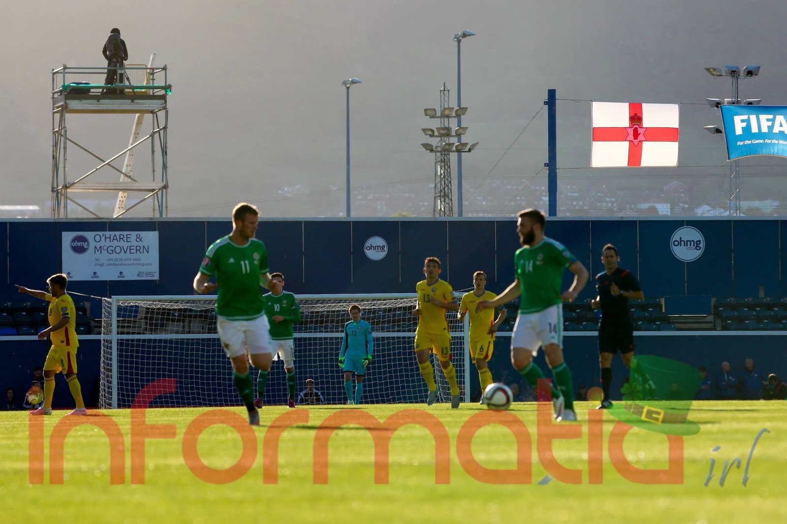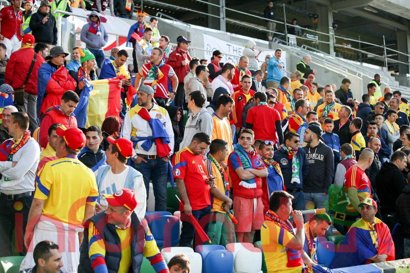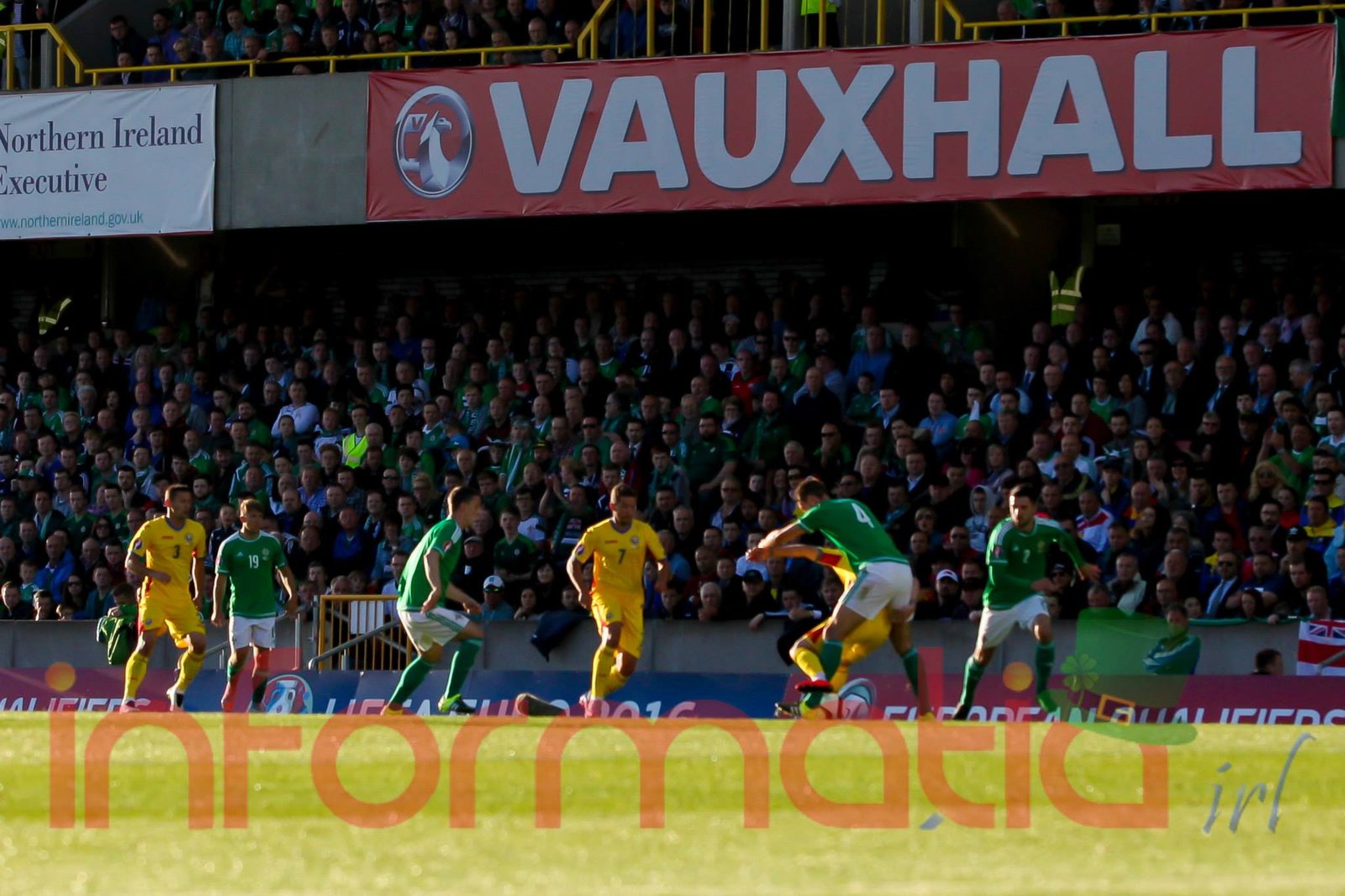 9.39 Jucatorii celor doua echipe ies pe teren, Jucatorii nostri in galben complet, irlandezii cu tricouri verzi si sorturi albe. Acum se canta imnul Romaniei