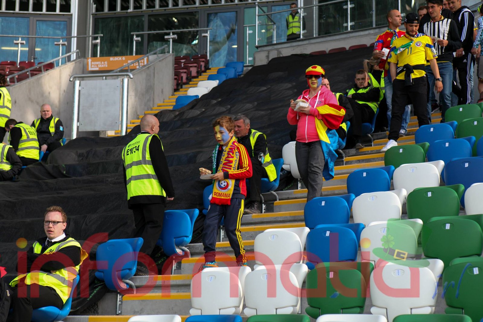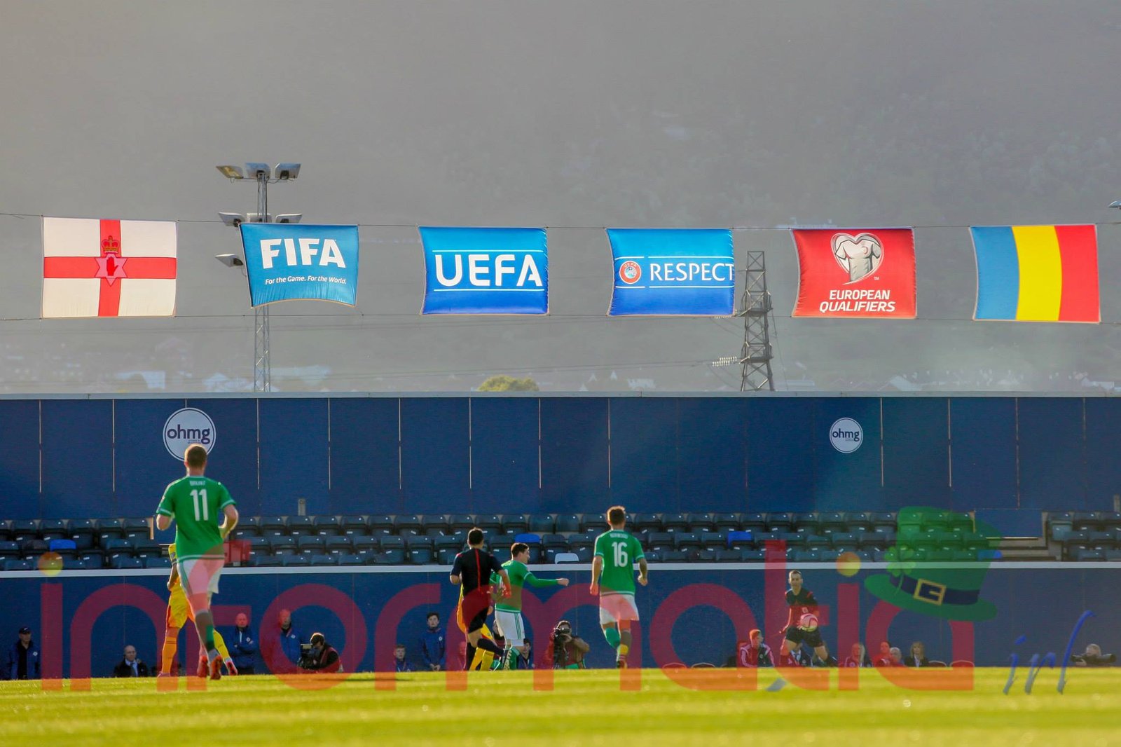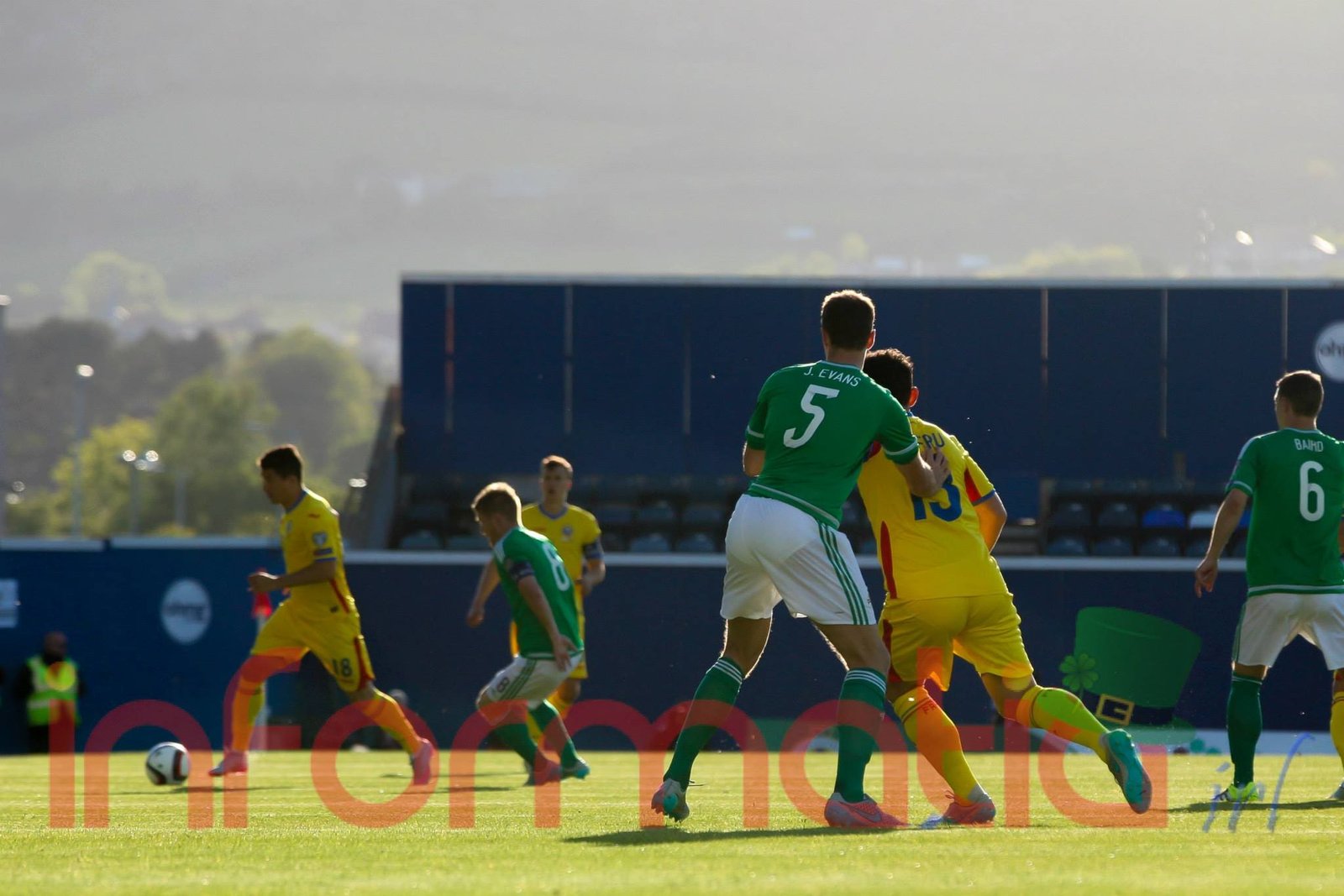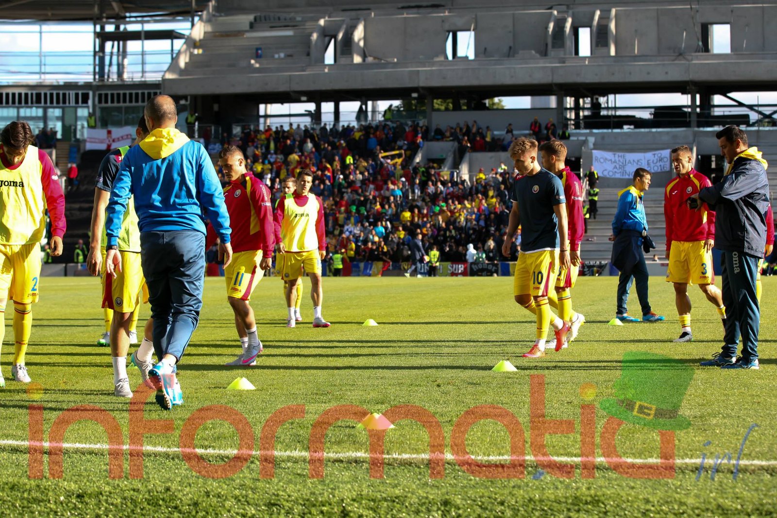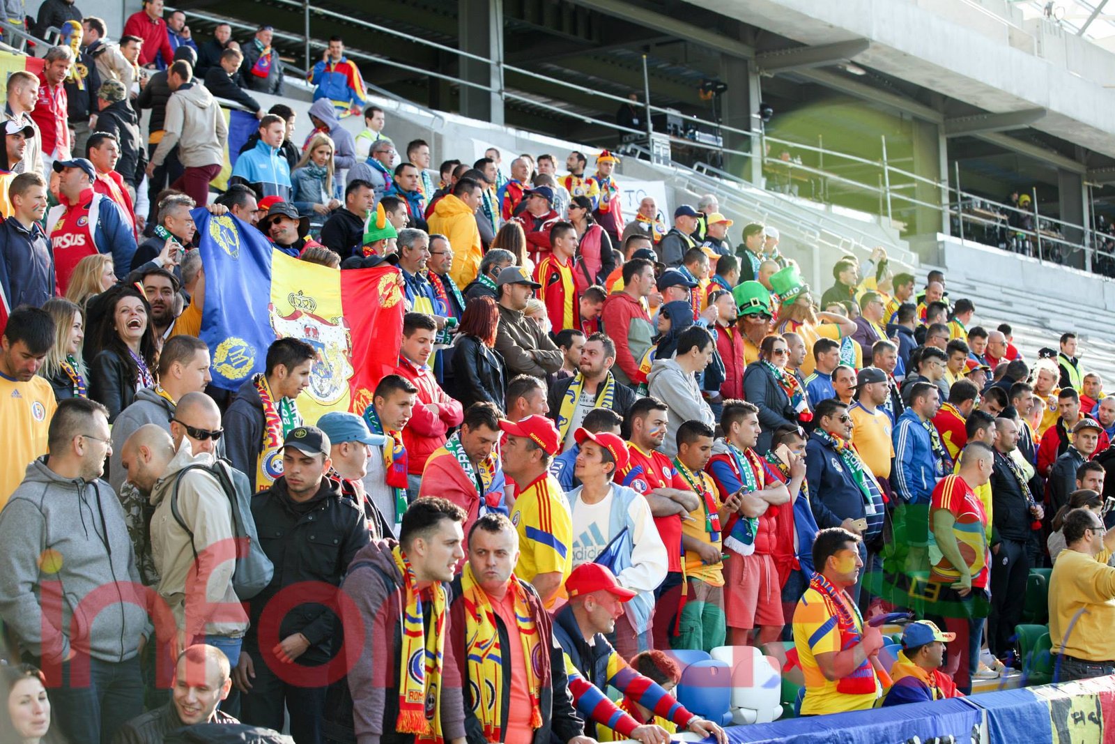 9.39 Jucatorii celor doua echipe ies pe teren, Jucatorii nostri in galben complet, irlandezii cu tricouri verzi si sorturi albe. Acum se canta imnul Romaniei