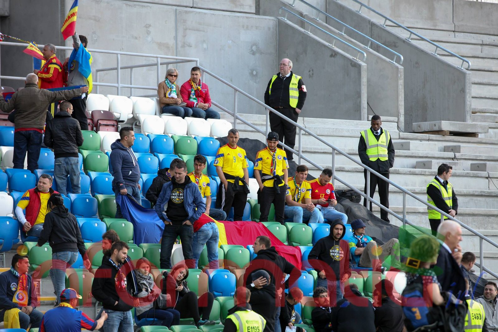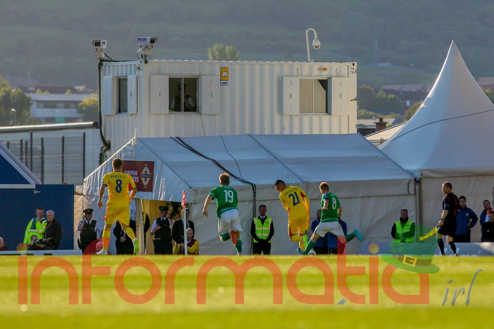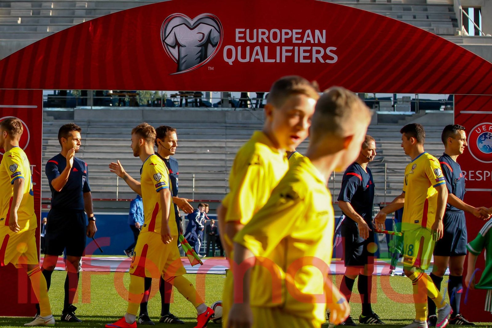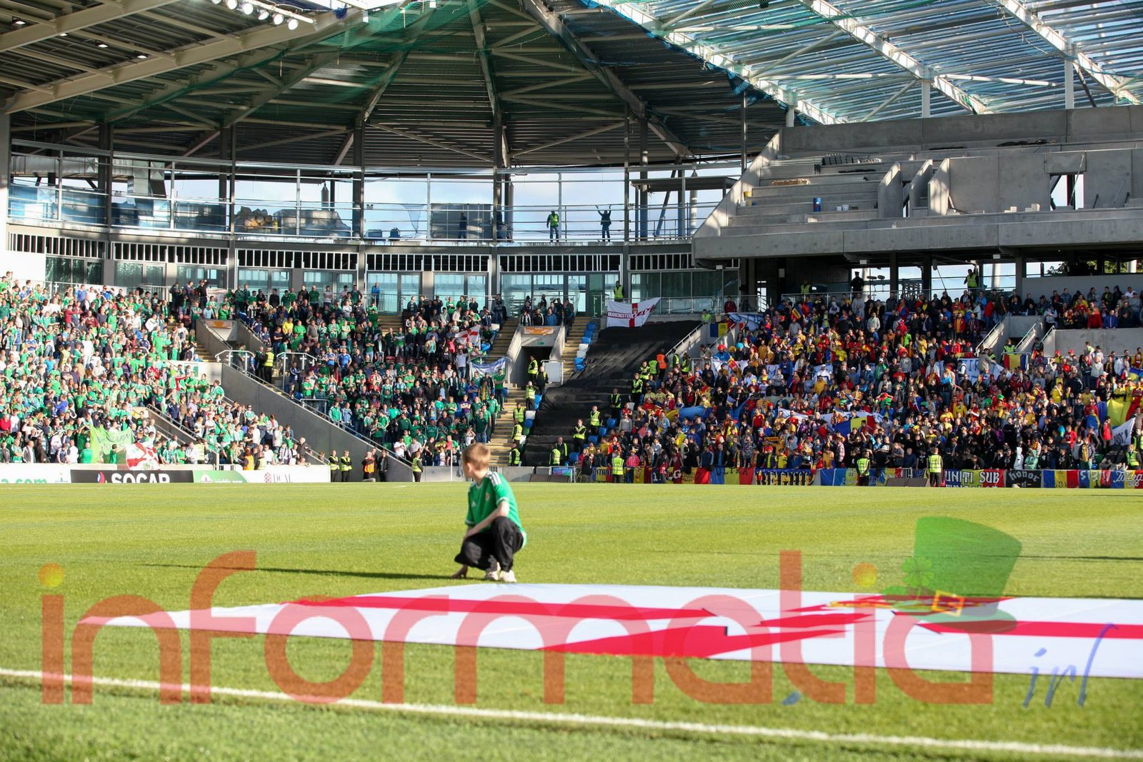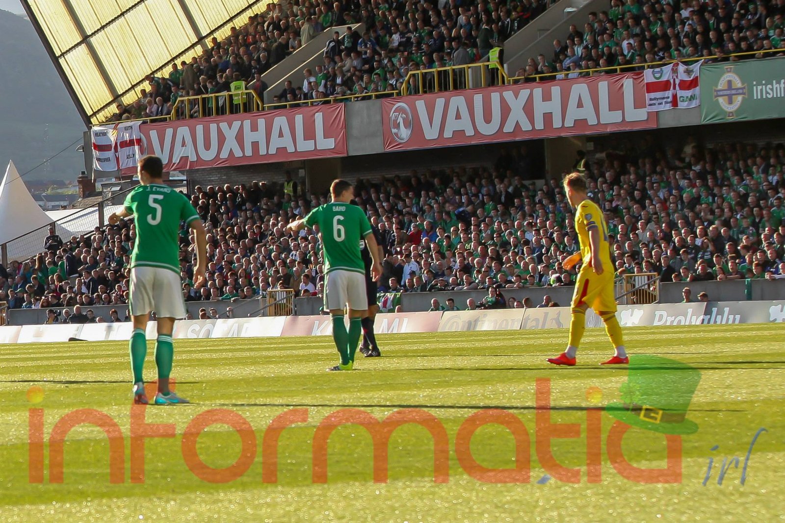 9.39 Jucatorii celor doua echipe ies pe teren, Jucatorii nostri in galben complet, irlandezii cu tricouri verzi si sorturi albe. Acum se canta imnul Romaniei