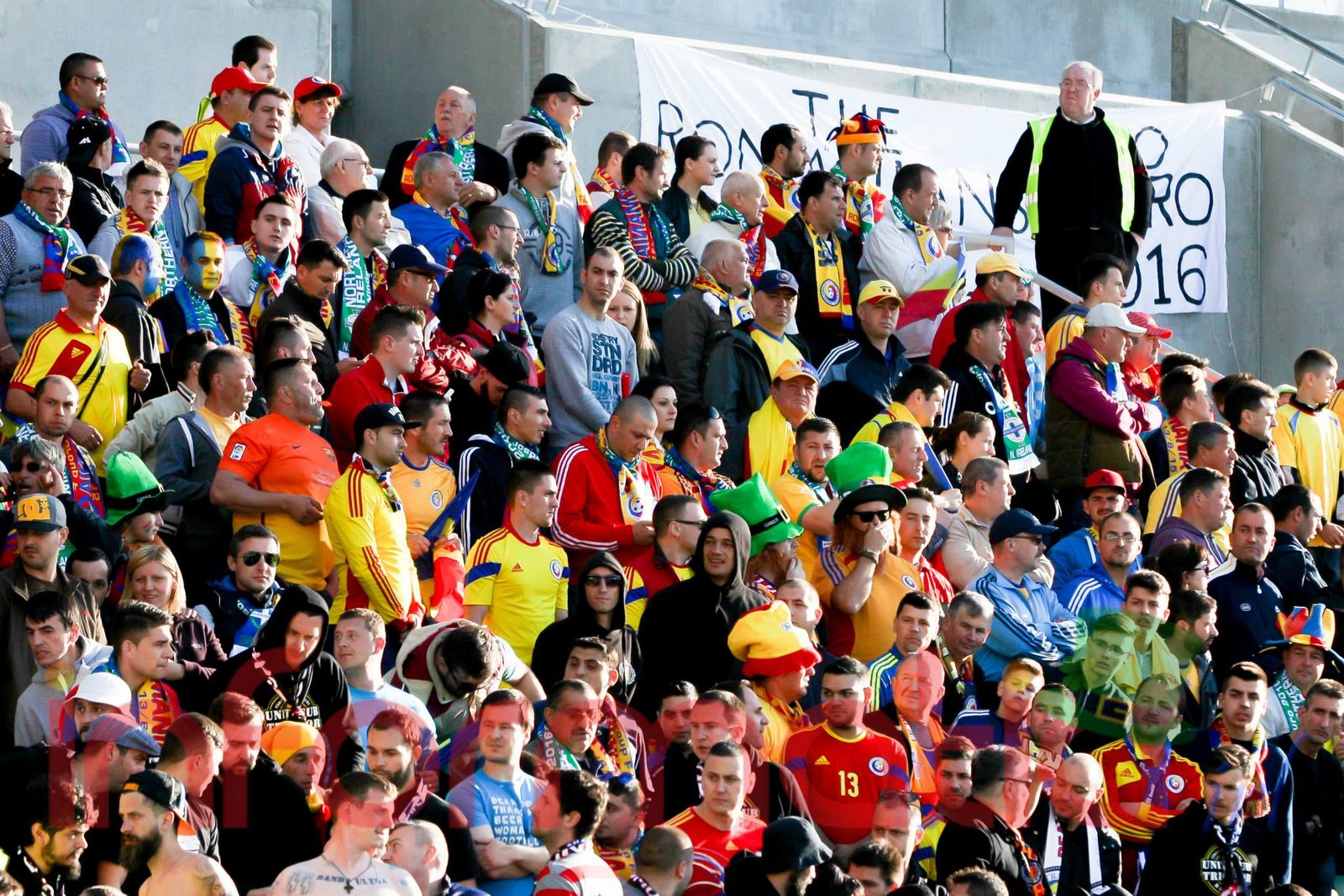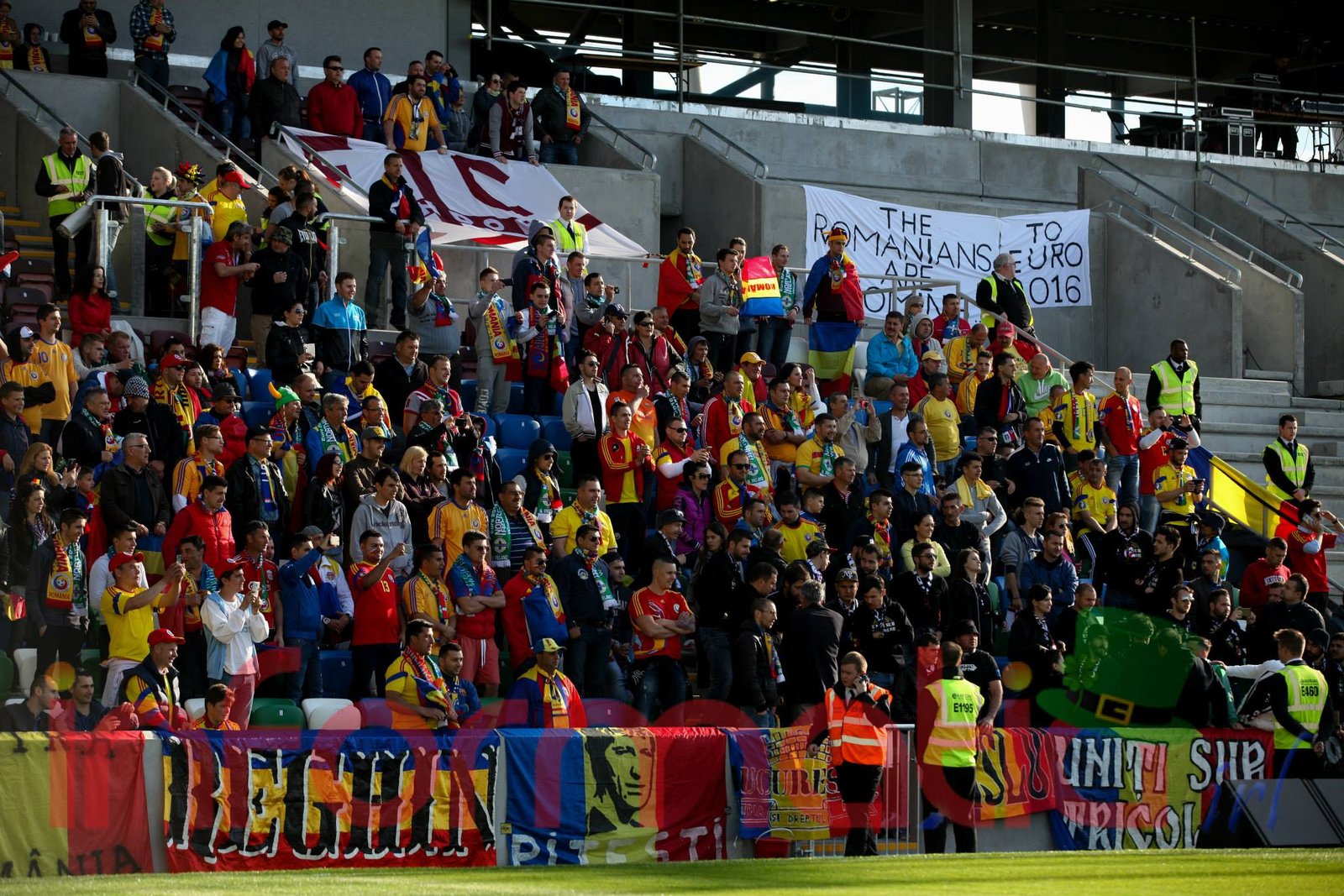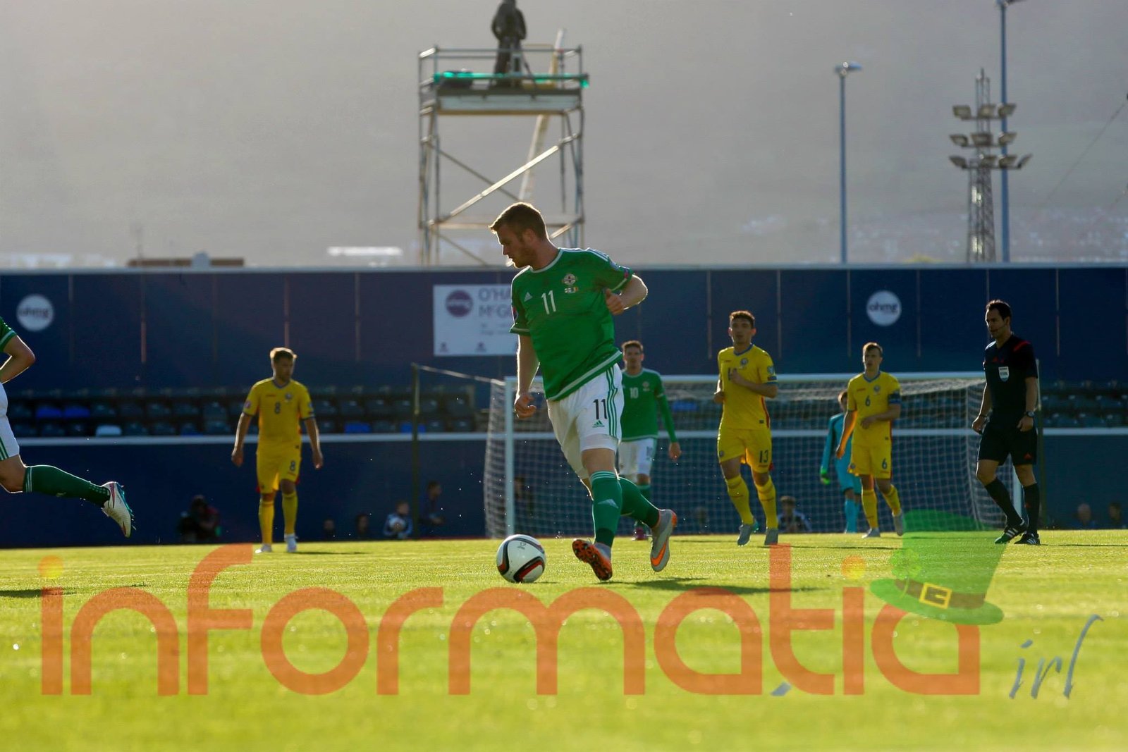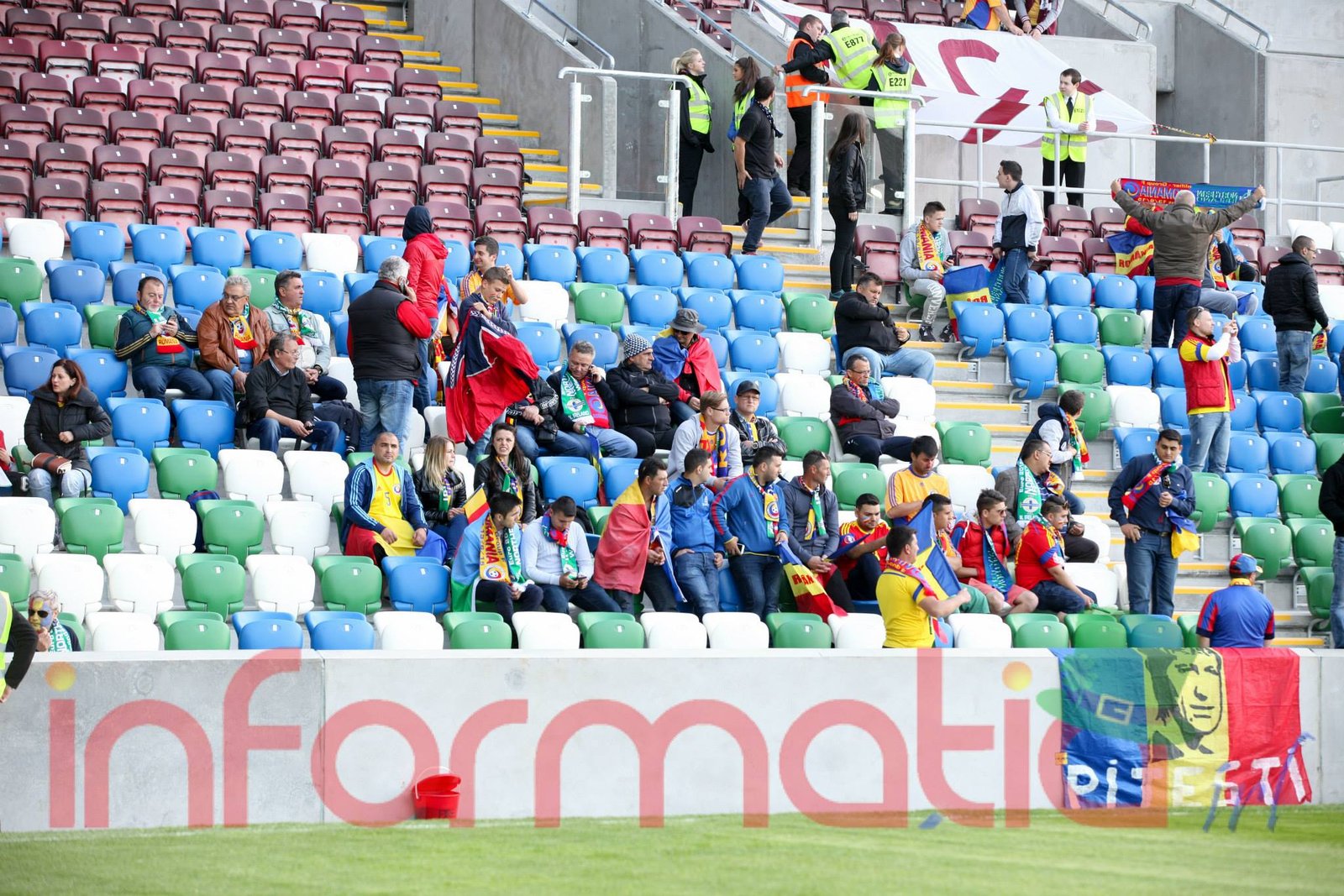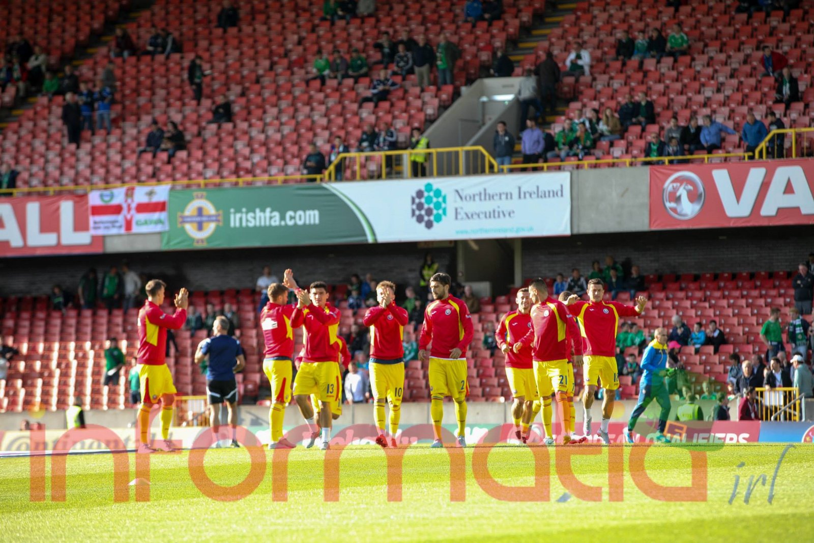 9.39 Jucatorii celor doua echipe ies pe teren, Jucatorii nostri in galben complet, irlandezii cu tricouri verzi si sorturi albe. Acum se canta imnul Romaniei
