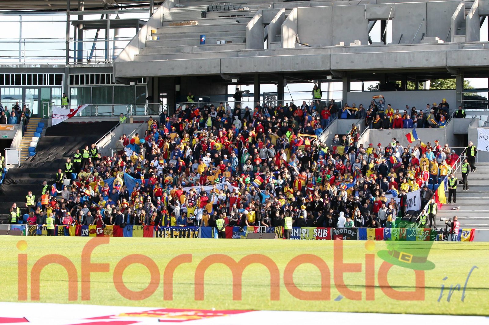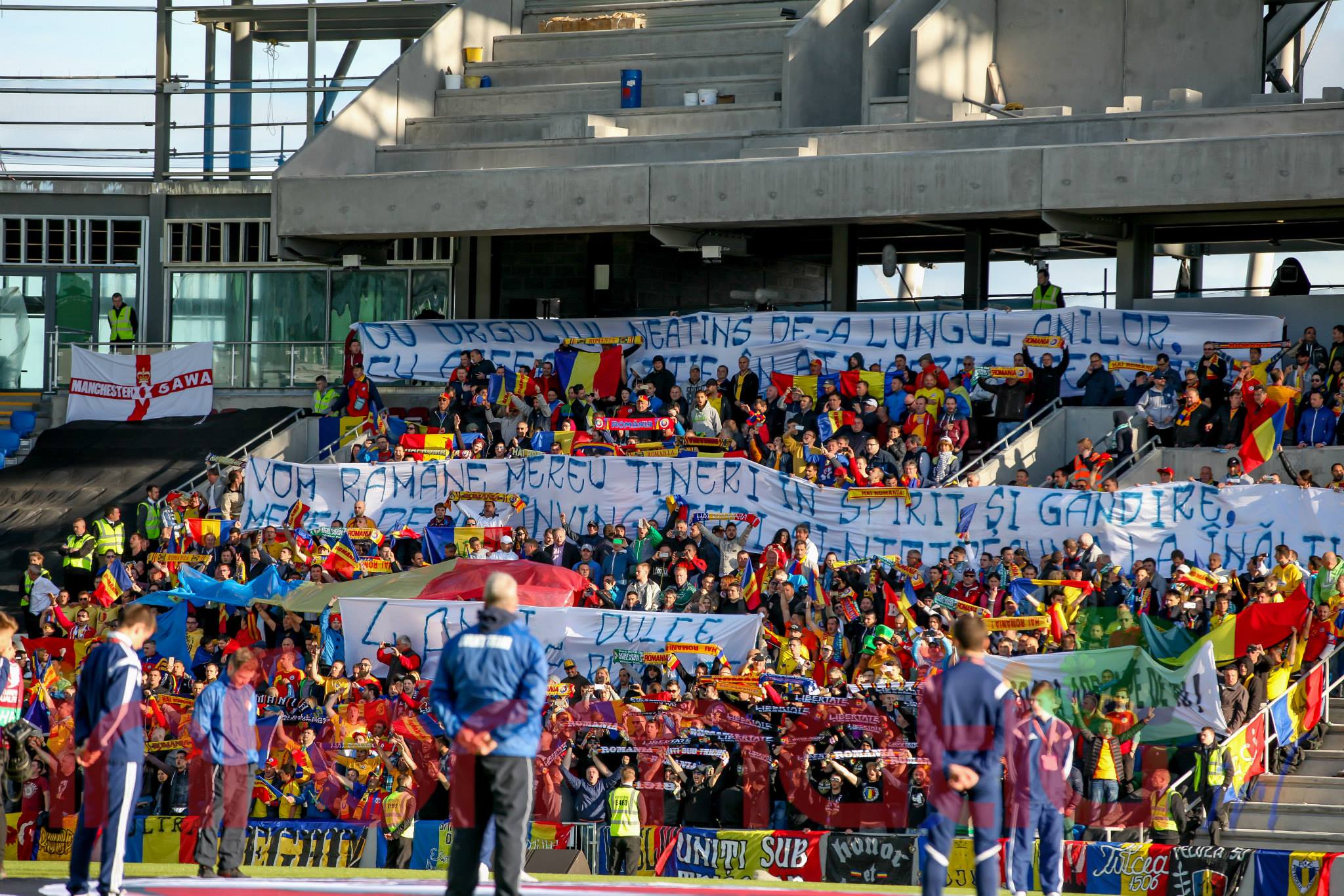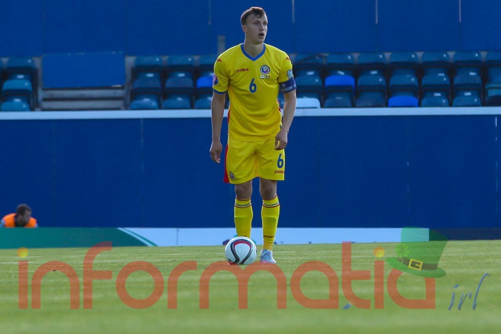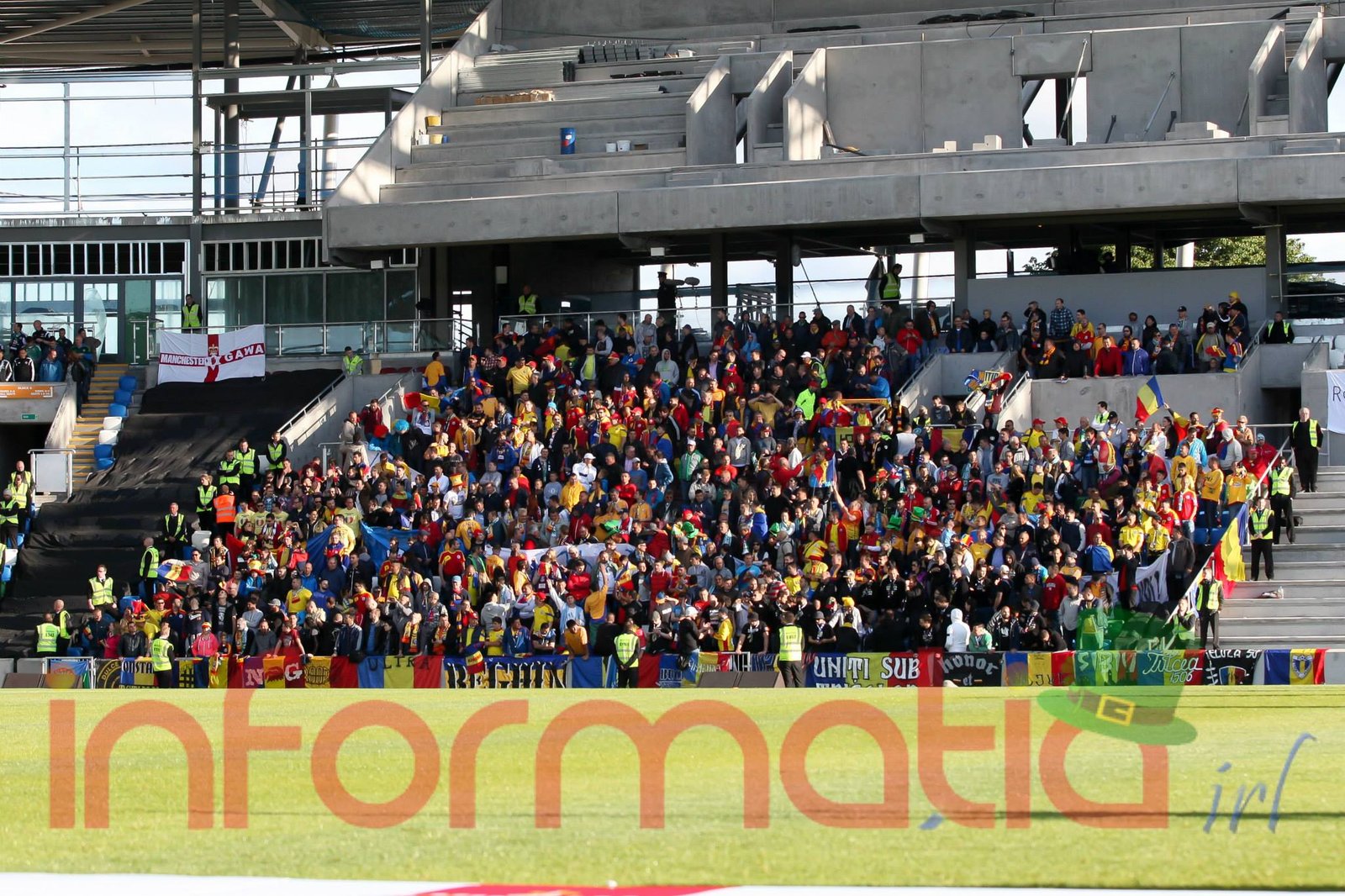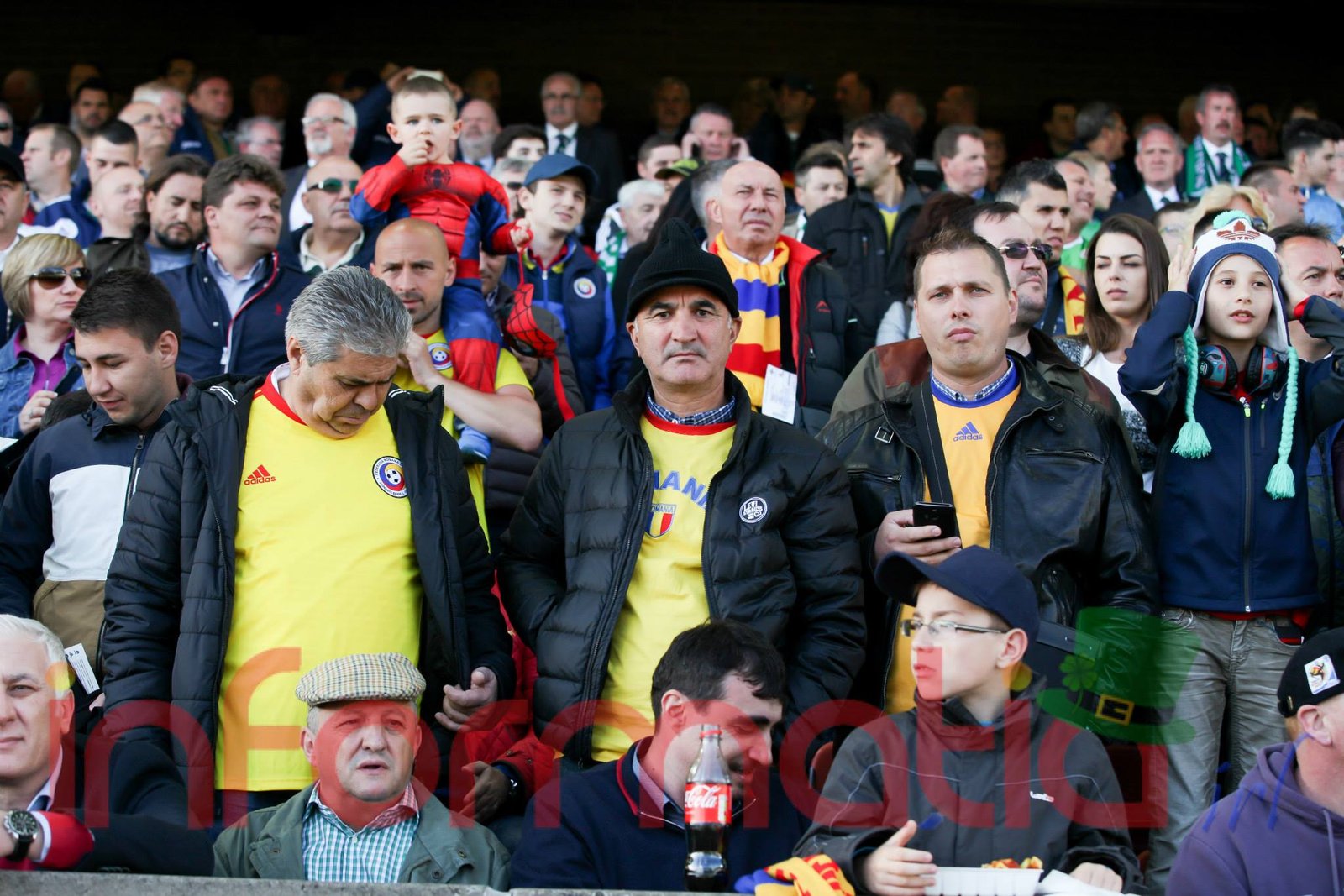 9.39 Jucatorii celor doua echipe ies pe teren, Jucatorii nostri in galben complet, irlandezii cu tricouri verzi si sorturi albe. Acum se canta imnul Romaniei
