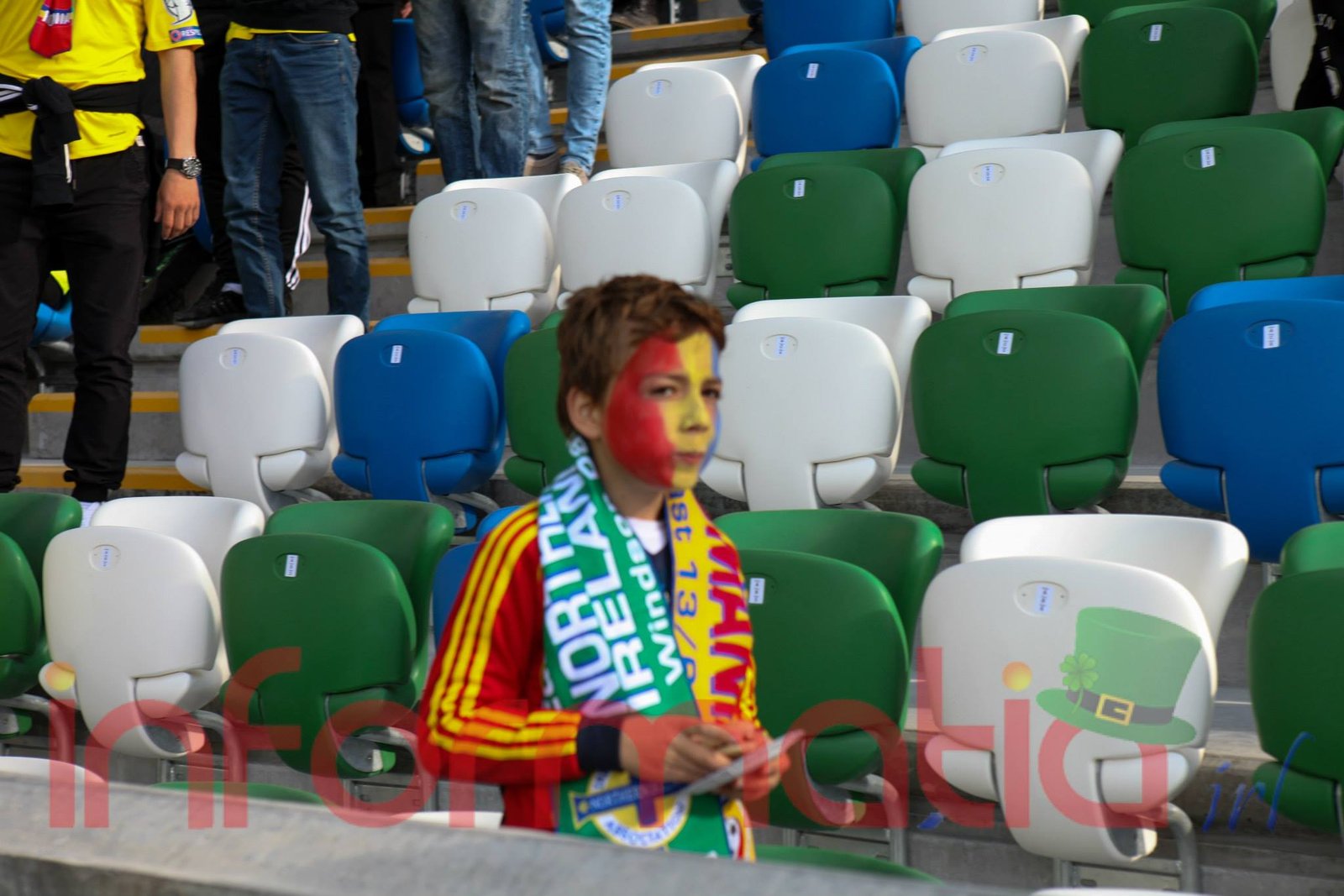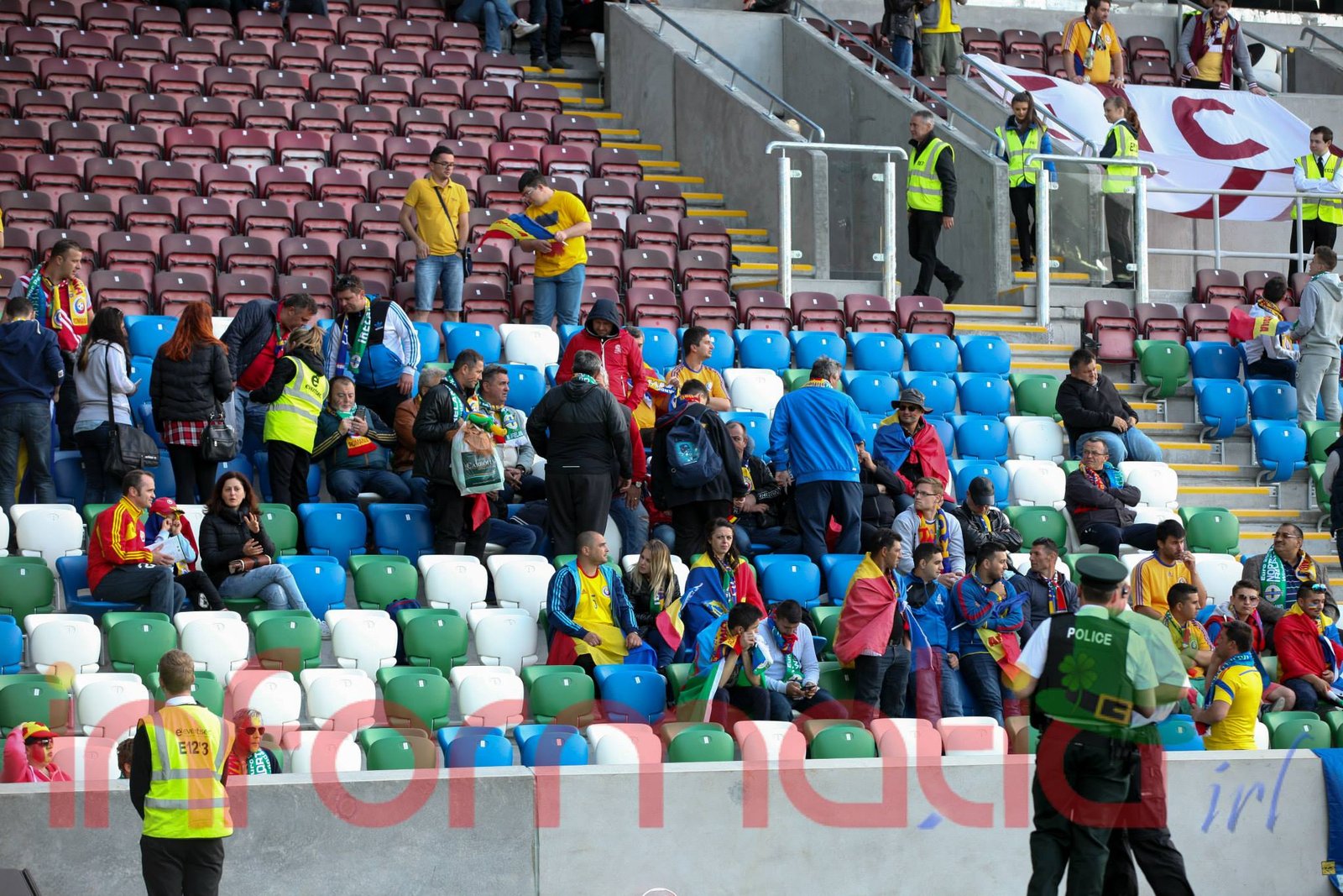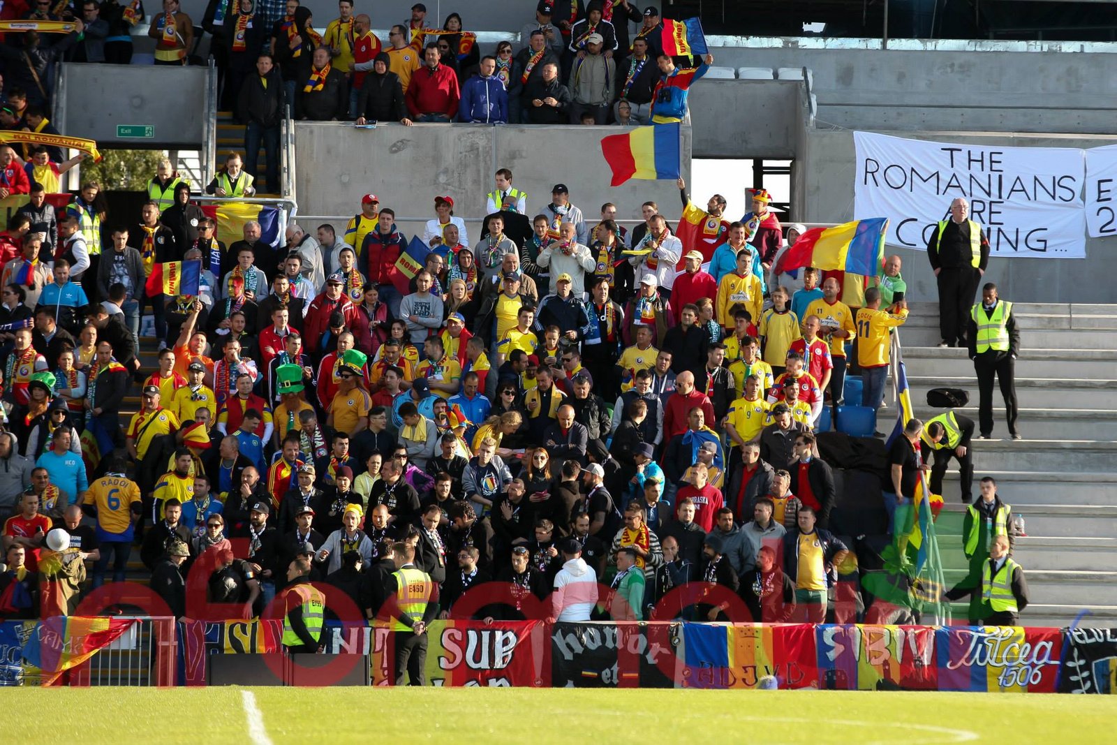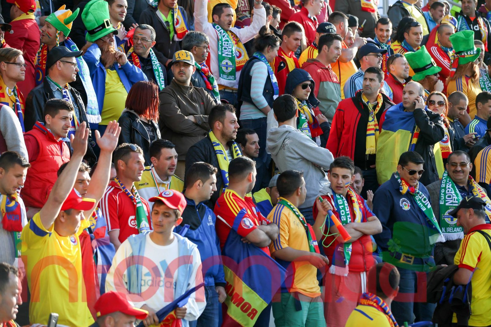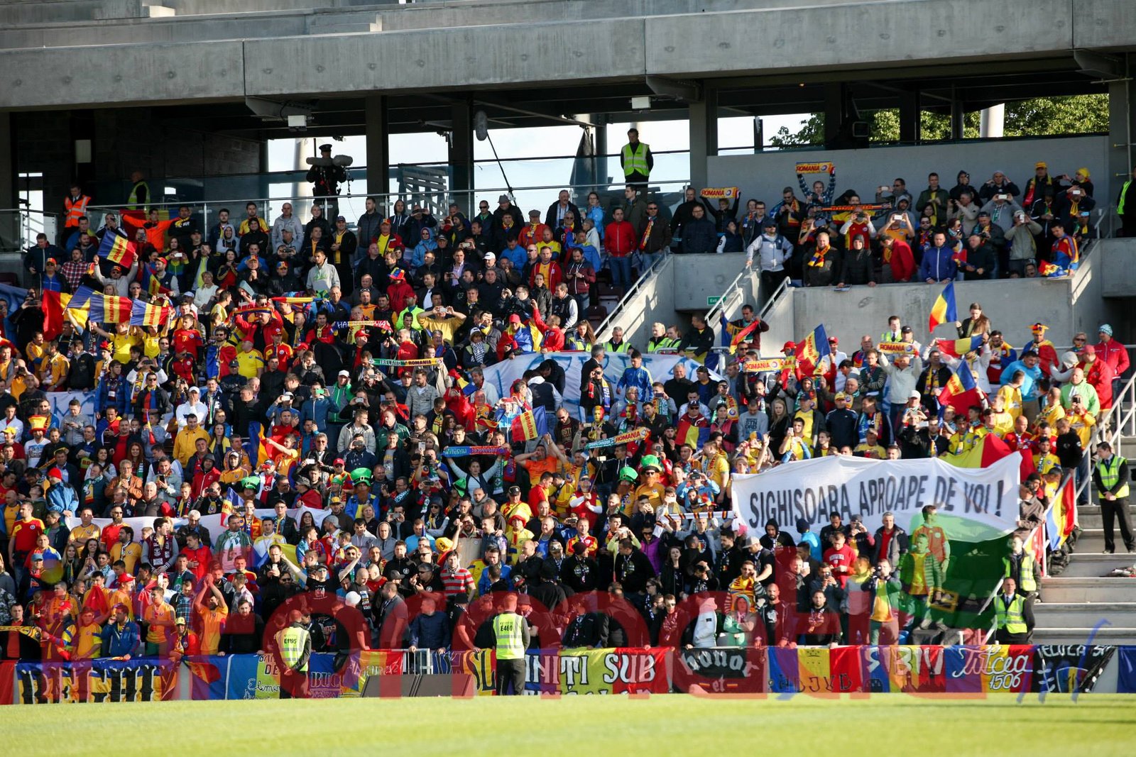 9.39 Jucatorii celor doua echipe ies pe teren, Jucatorii nostri in galben complet, irlandezii cu tricouri verzi si sorturi albe. Acum se canta imnul Romaniei