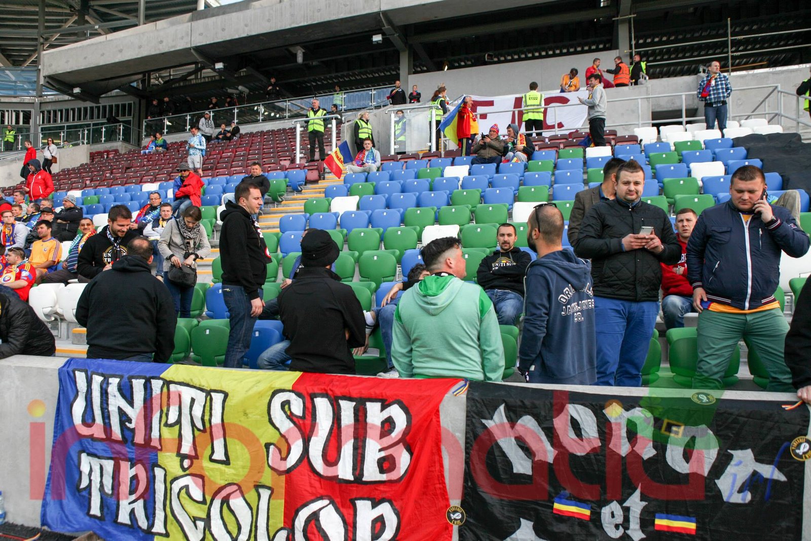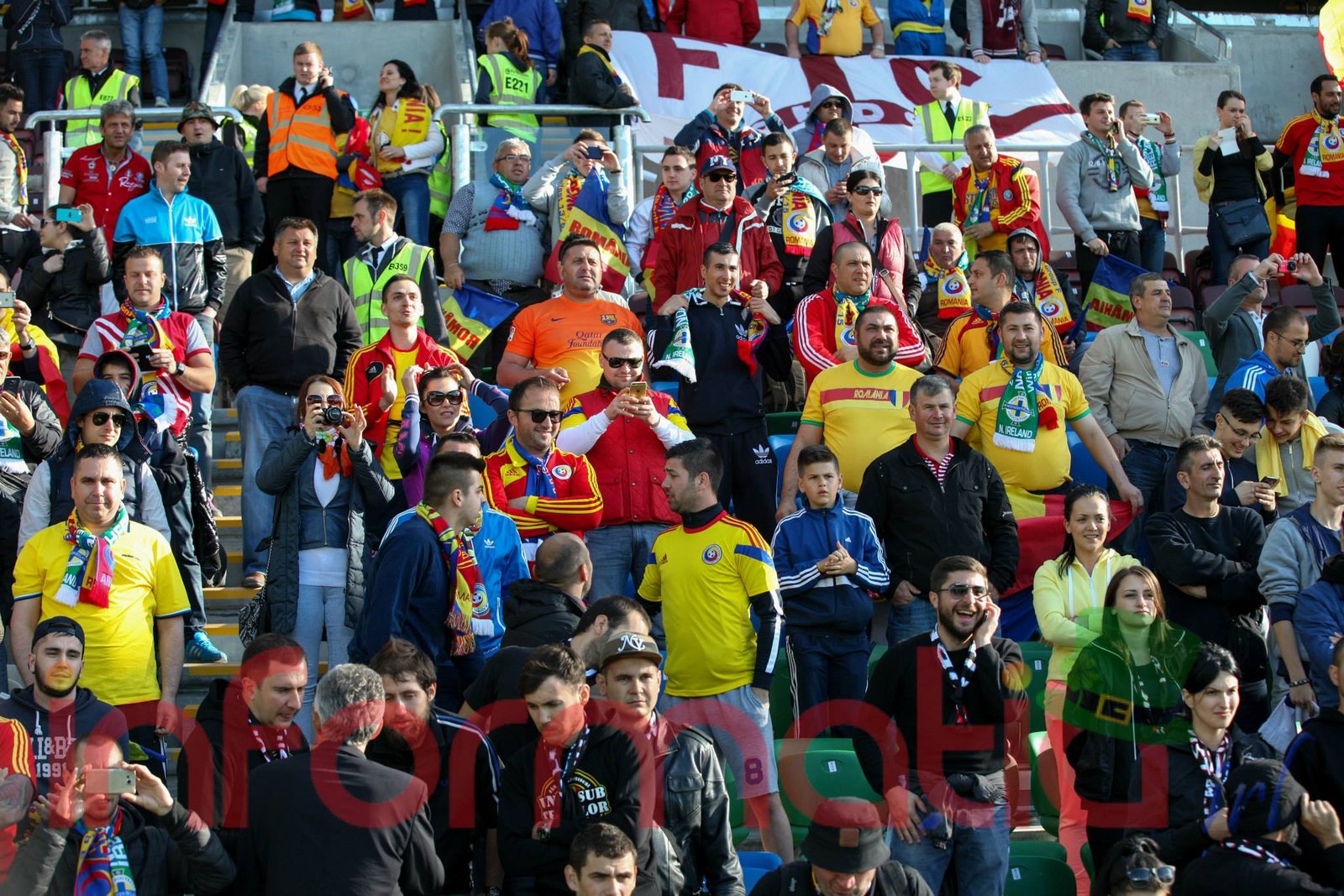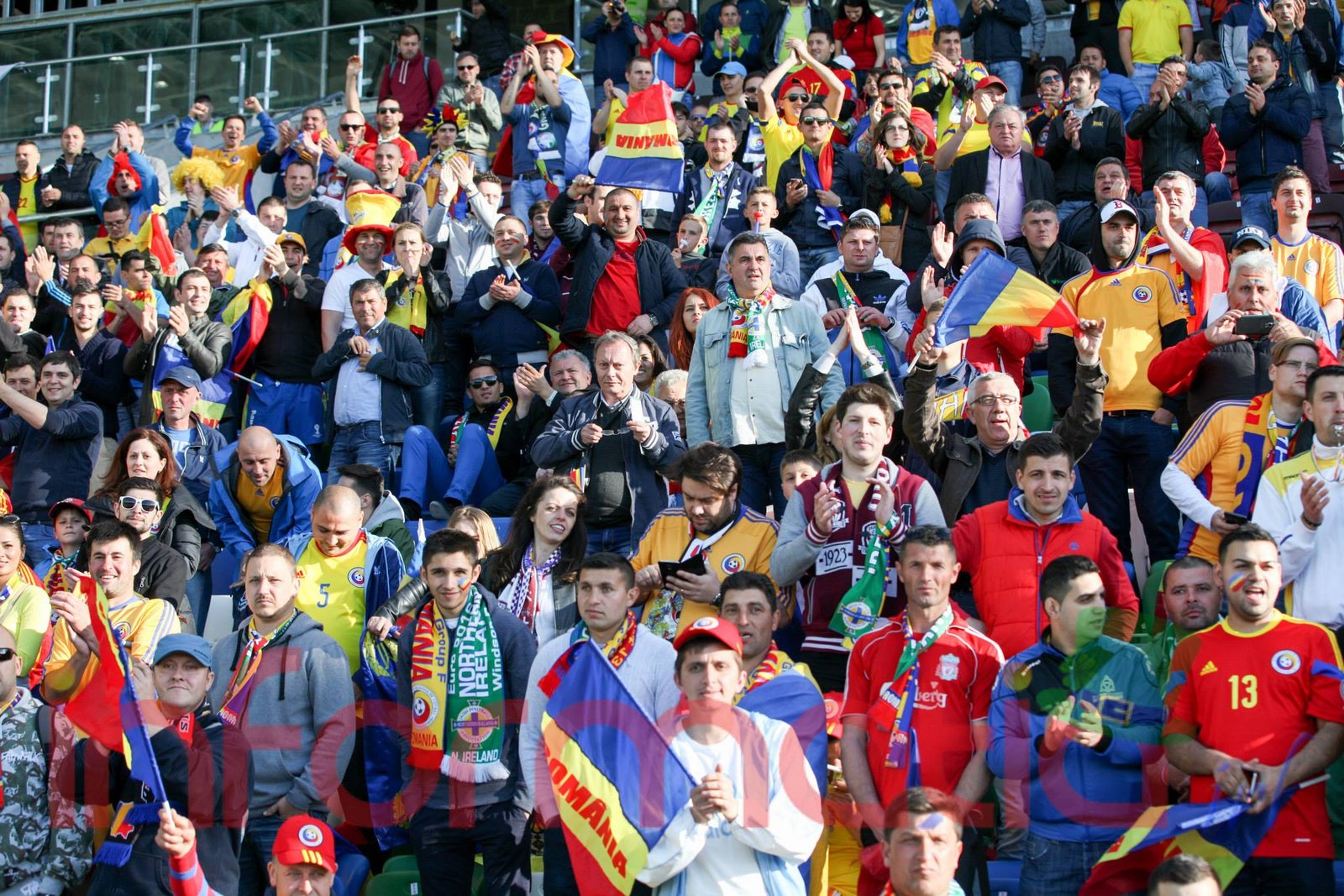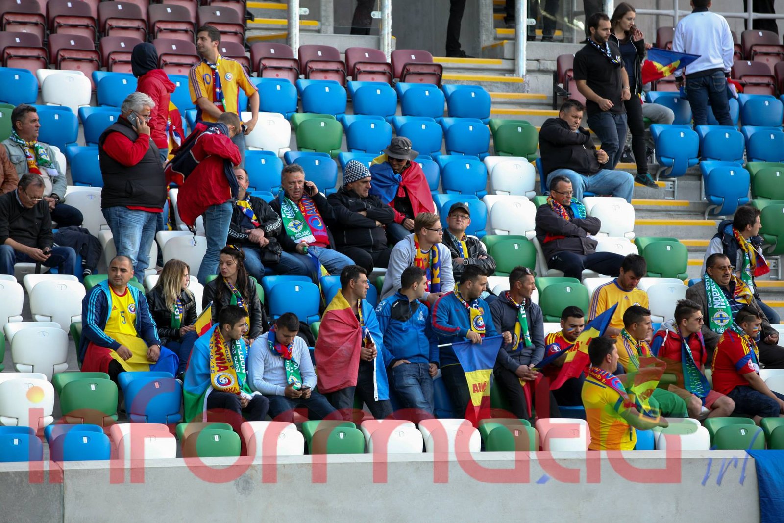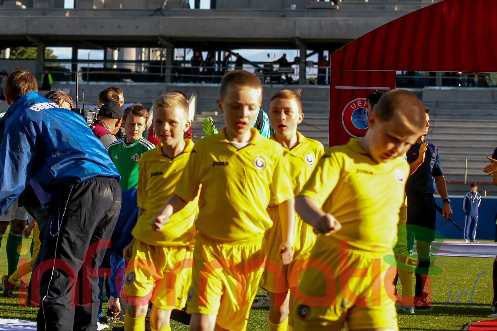 9.39 Jucatorii celor doua echipe ies pe teren, Jucatorii nostri in galben complet, irlandezii cu tricouri verzi si sorturi albe. Acum se canta imnul Romaniei