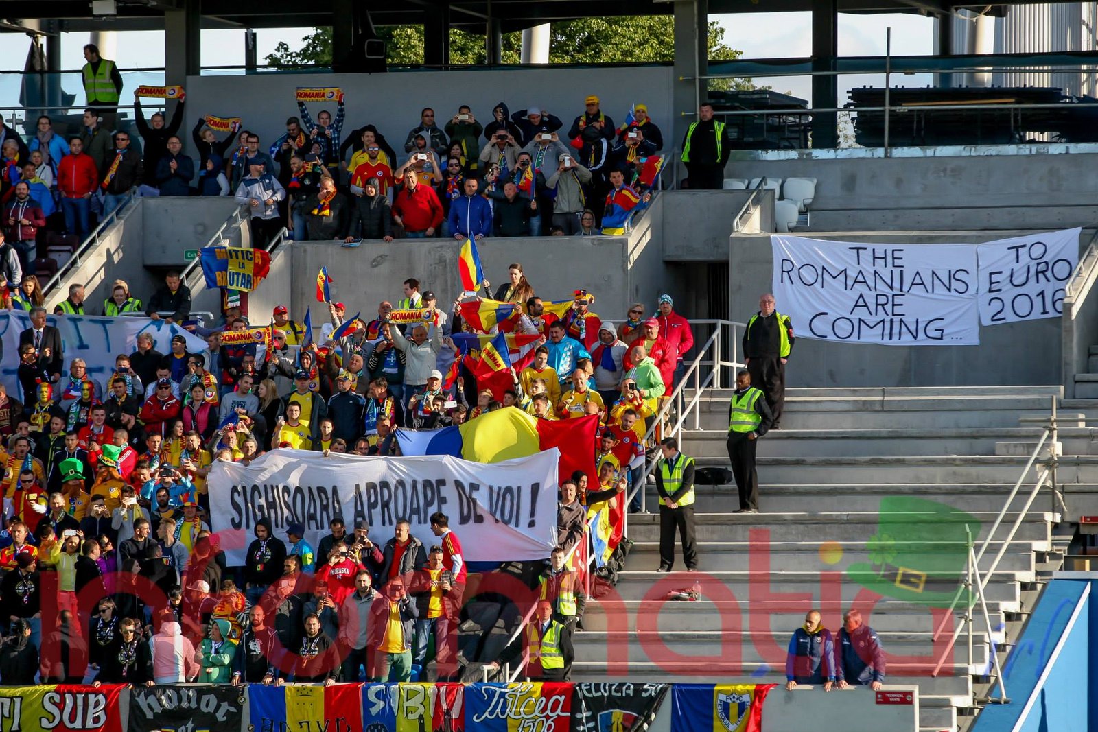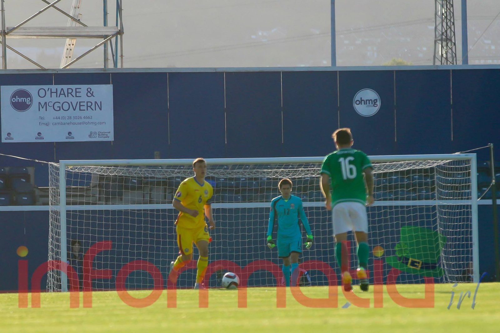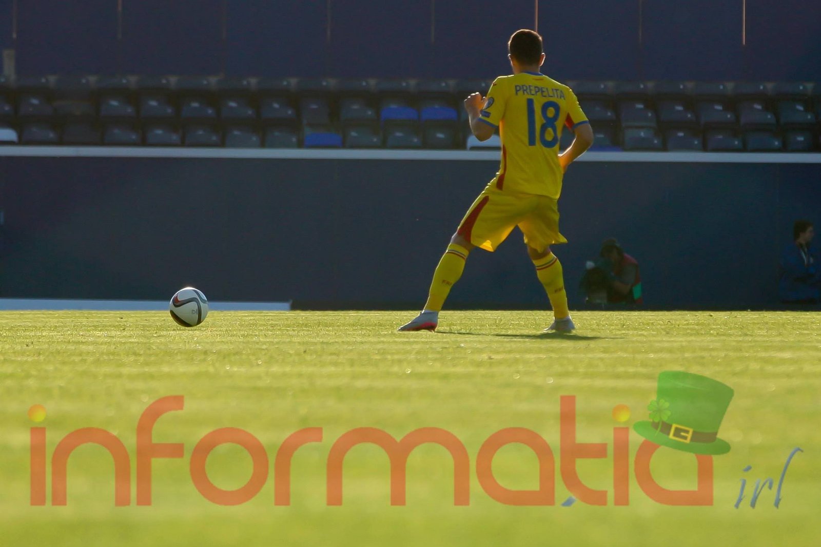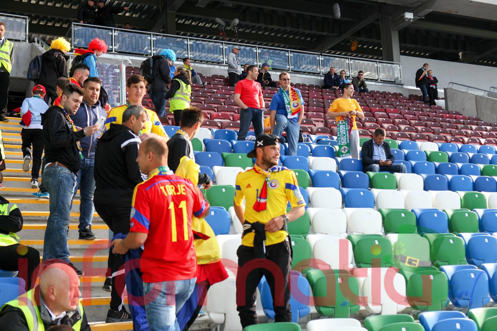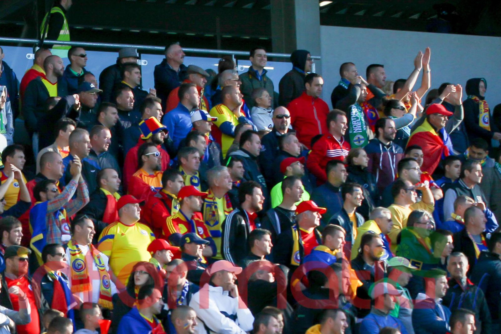 9.39 Jucatorii celor doua echipe ies pe teren, Jucatorii nostri in galben complet, irlandezii cu tricouri verzi si sorturi albe. Acum se canta imnul Romaniei