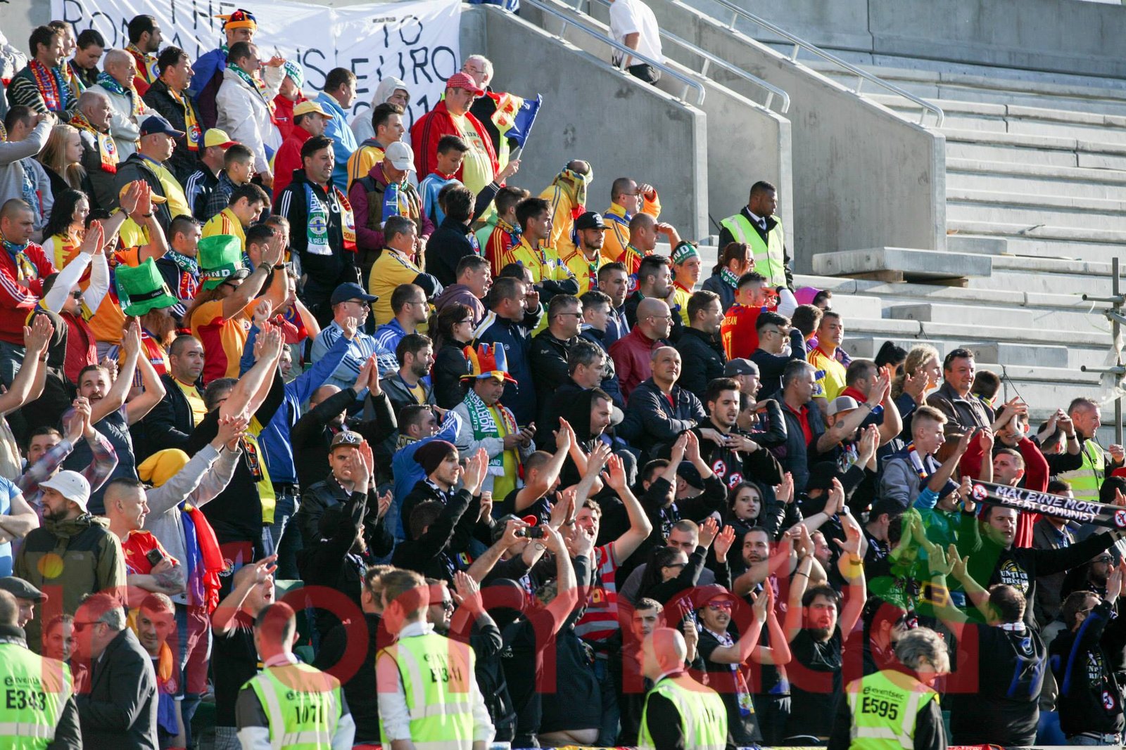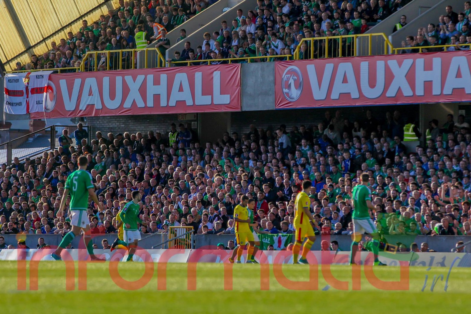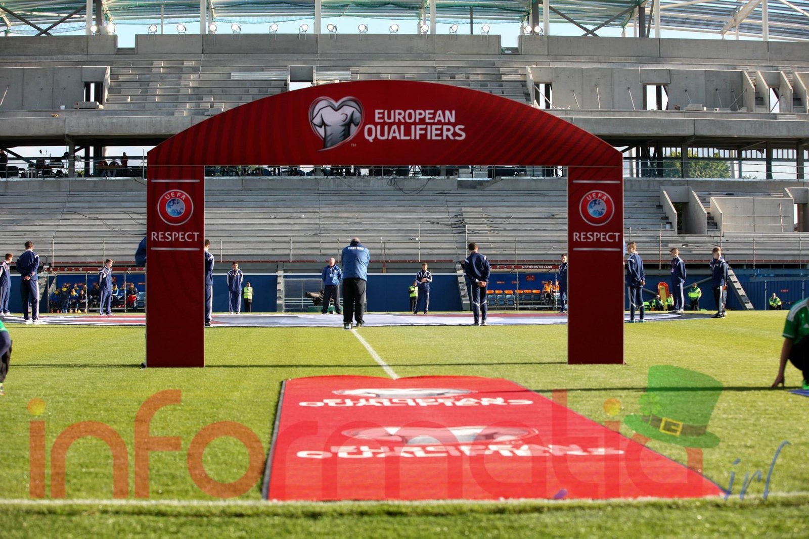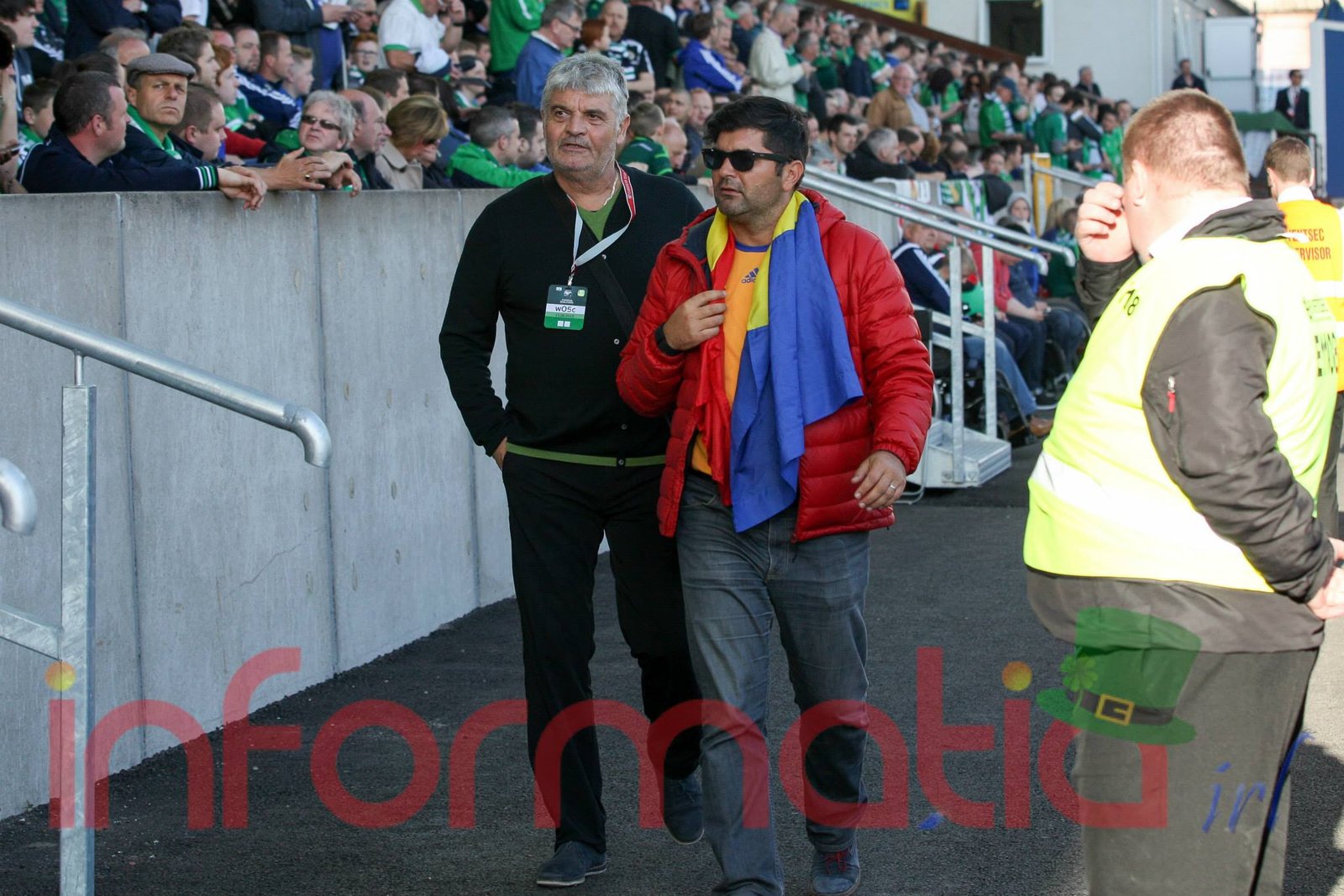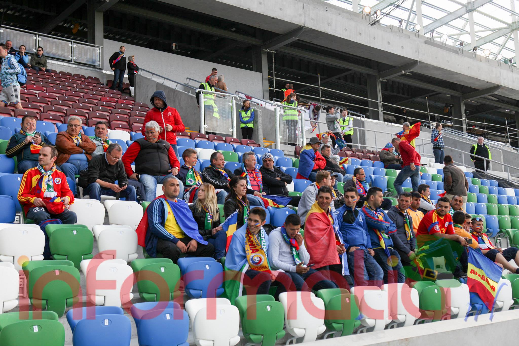 9.39 Jucatorii celor doua echipe ies pe teren, Jucatorii nostri in galben complet, irlandezii cu tricouri verzi si sorturi albe. Acum se canta imnul Romaniei