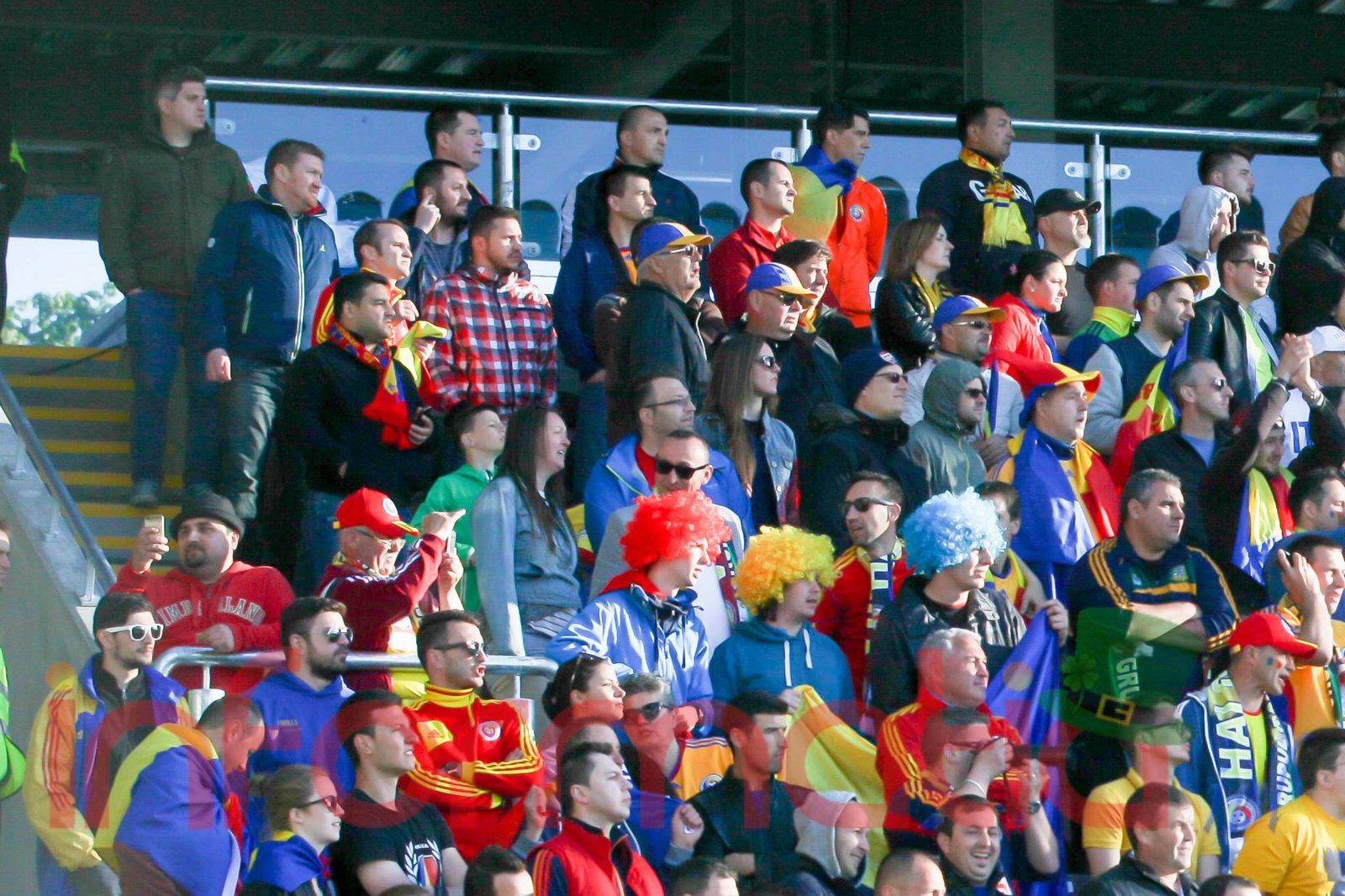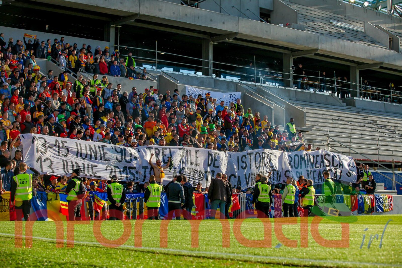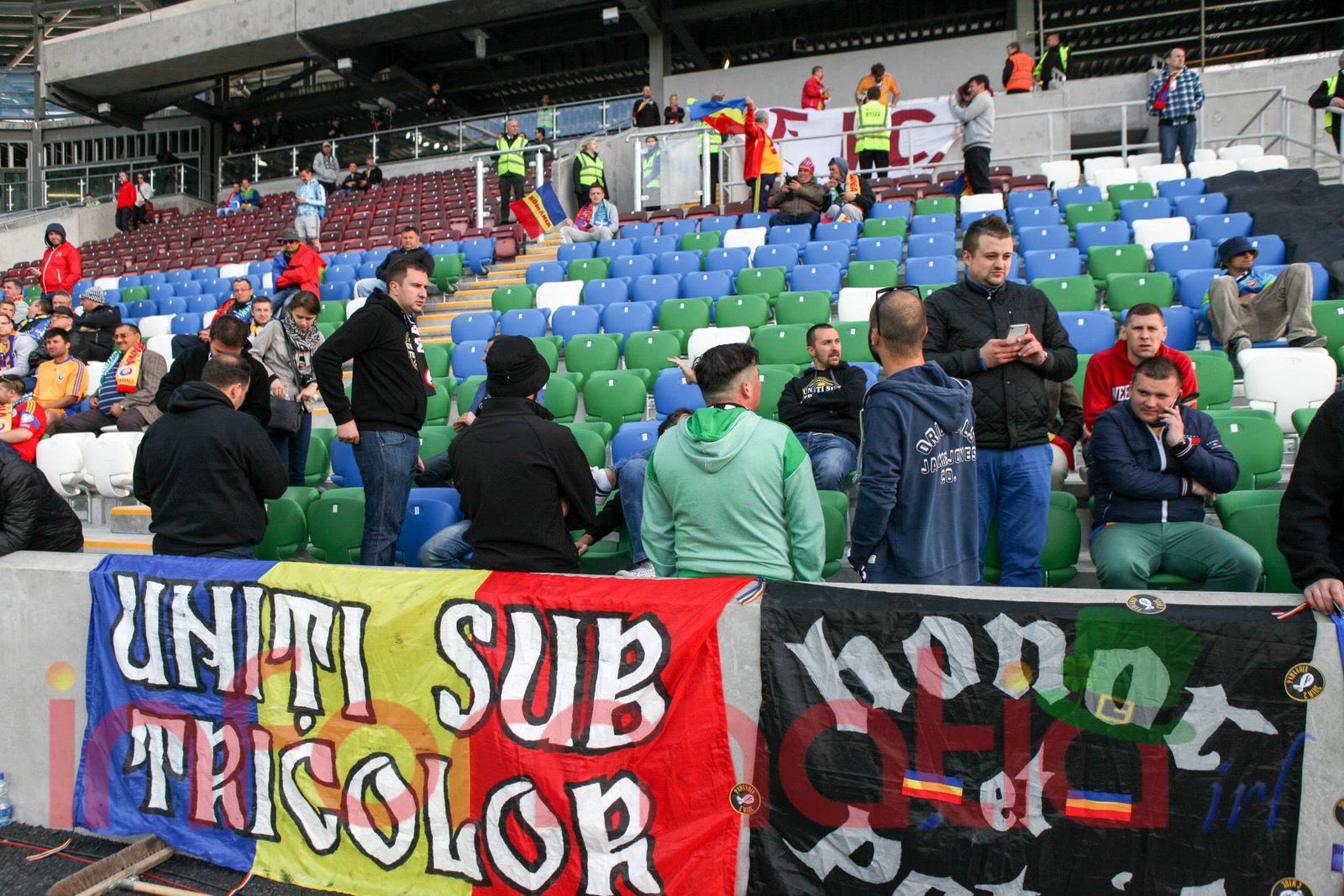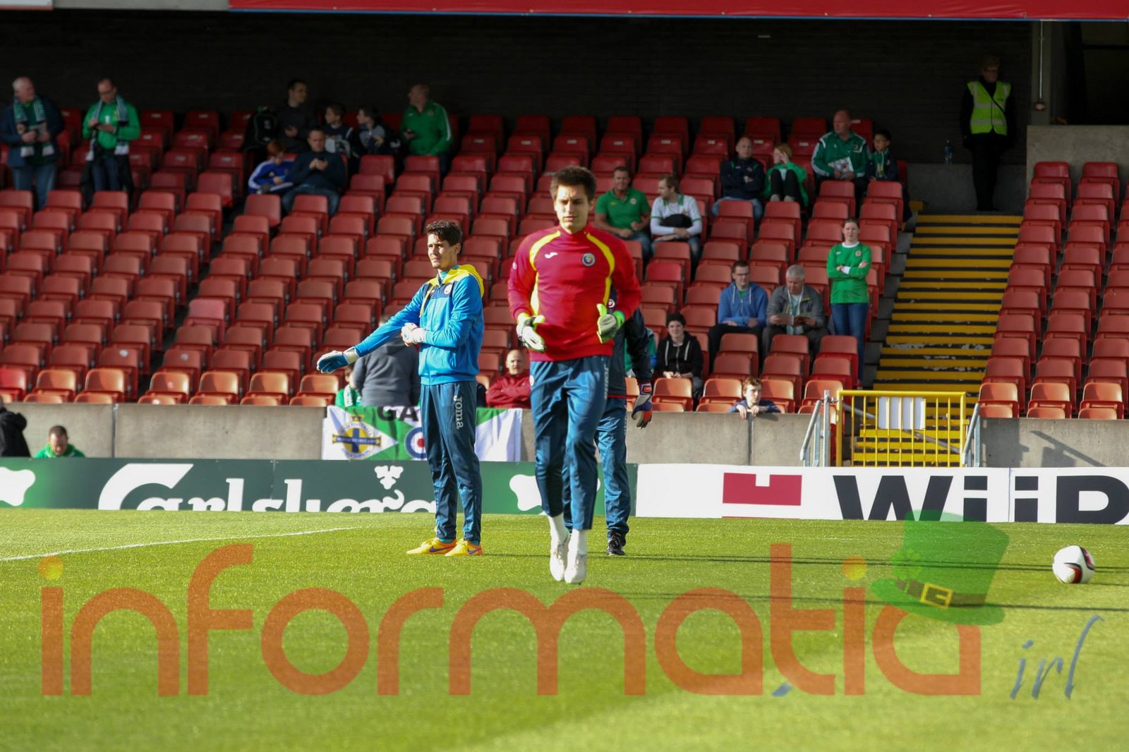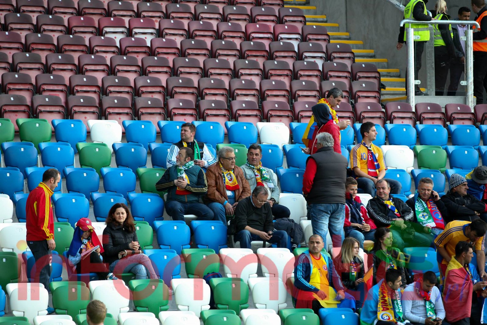 9.39 Jucatorii celor doua echipe ies pe teren, Jucatorii nostri in galben complet, irlandezii cu tricouri verzi si sorturi albe. Acum se canta imnul Romaniei