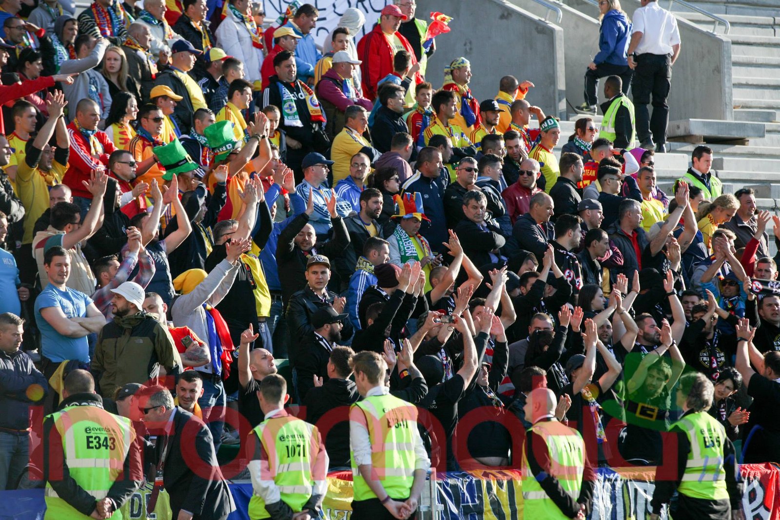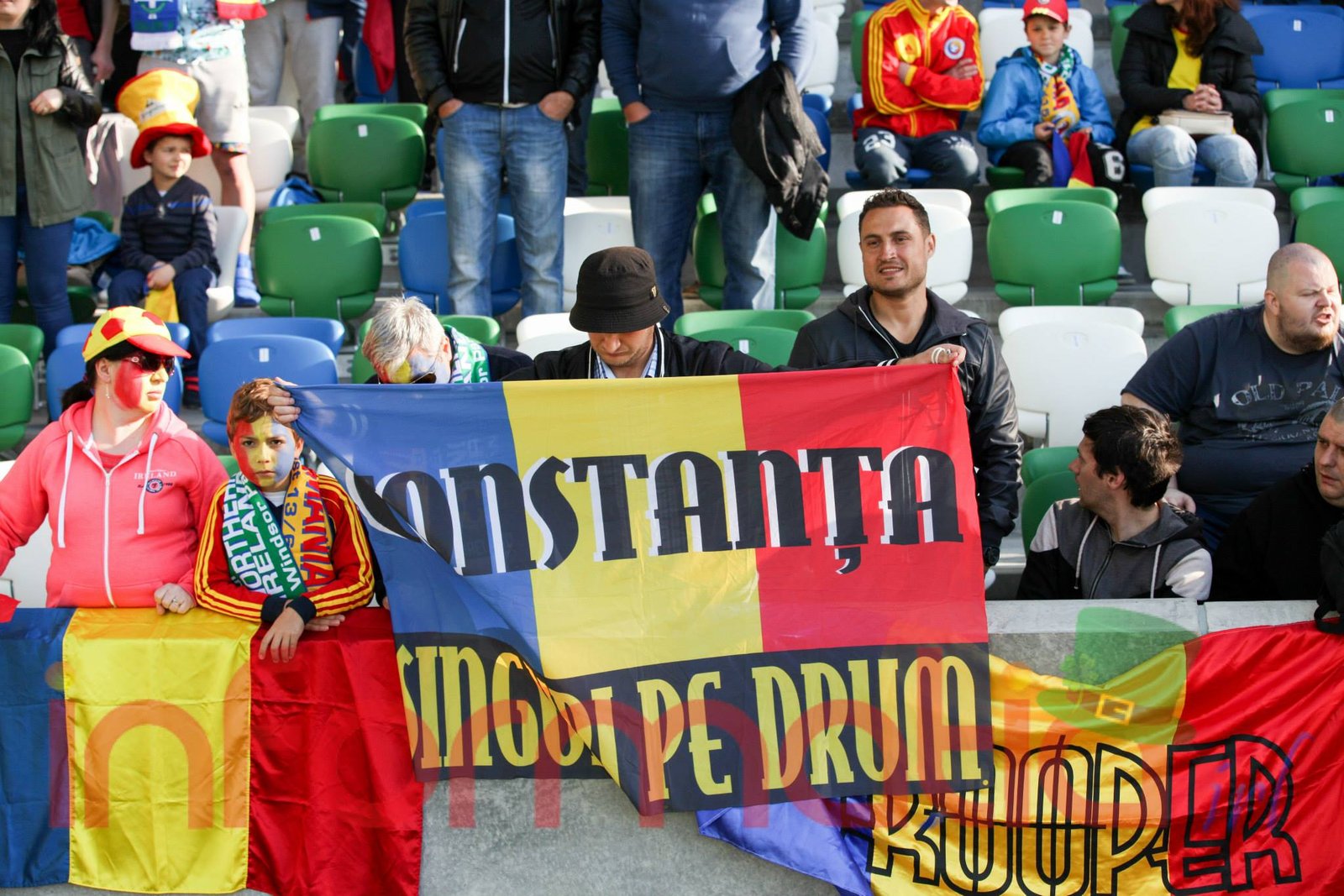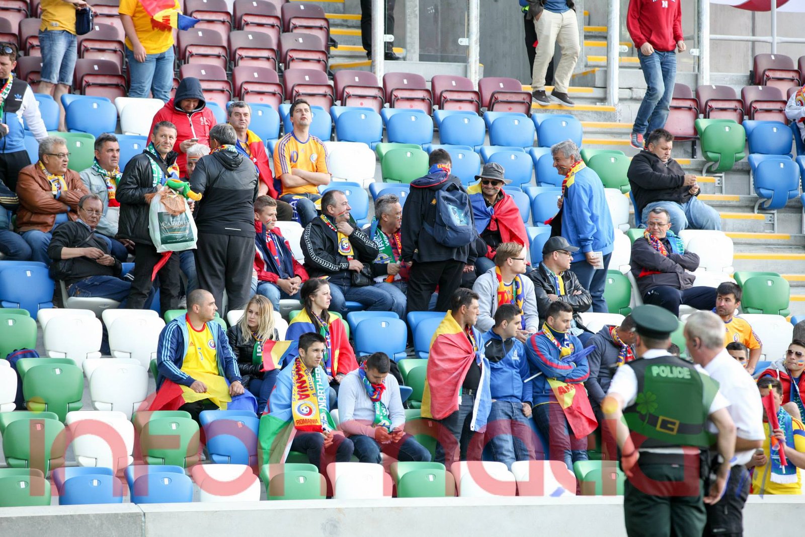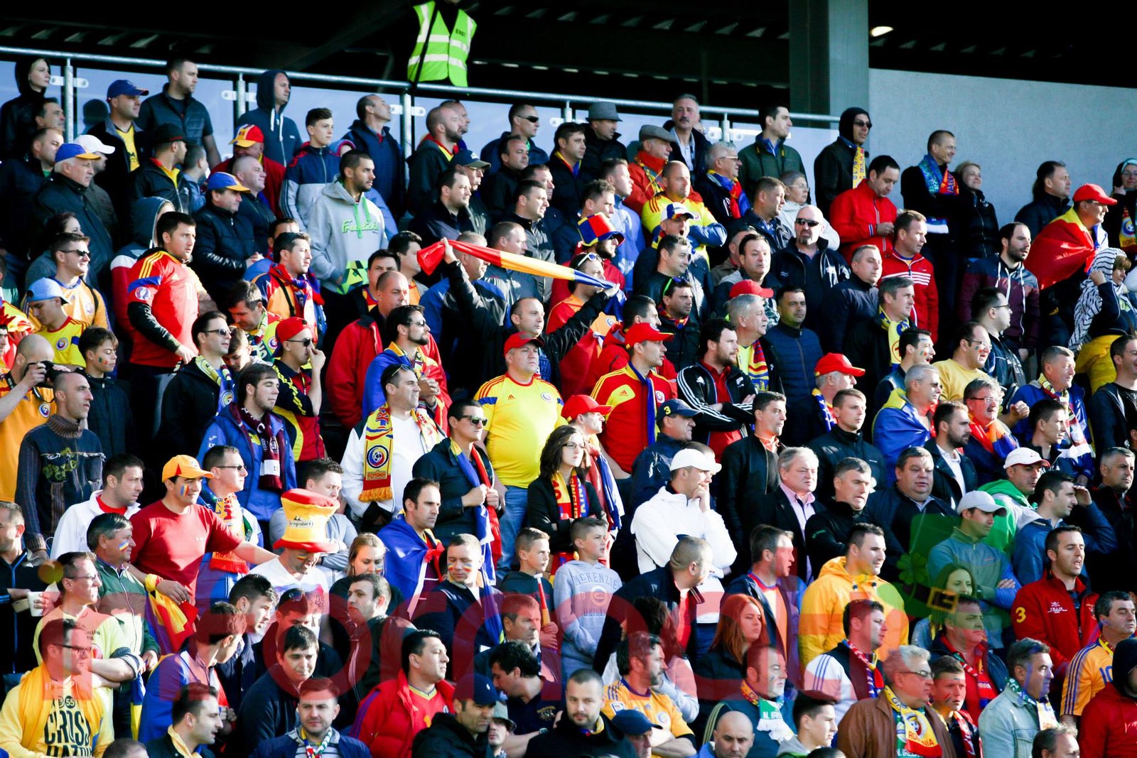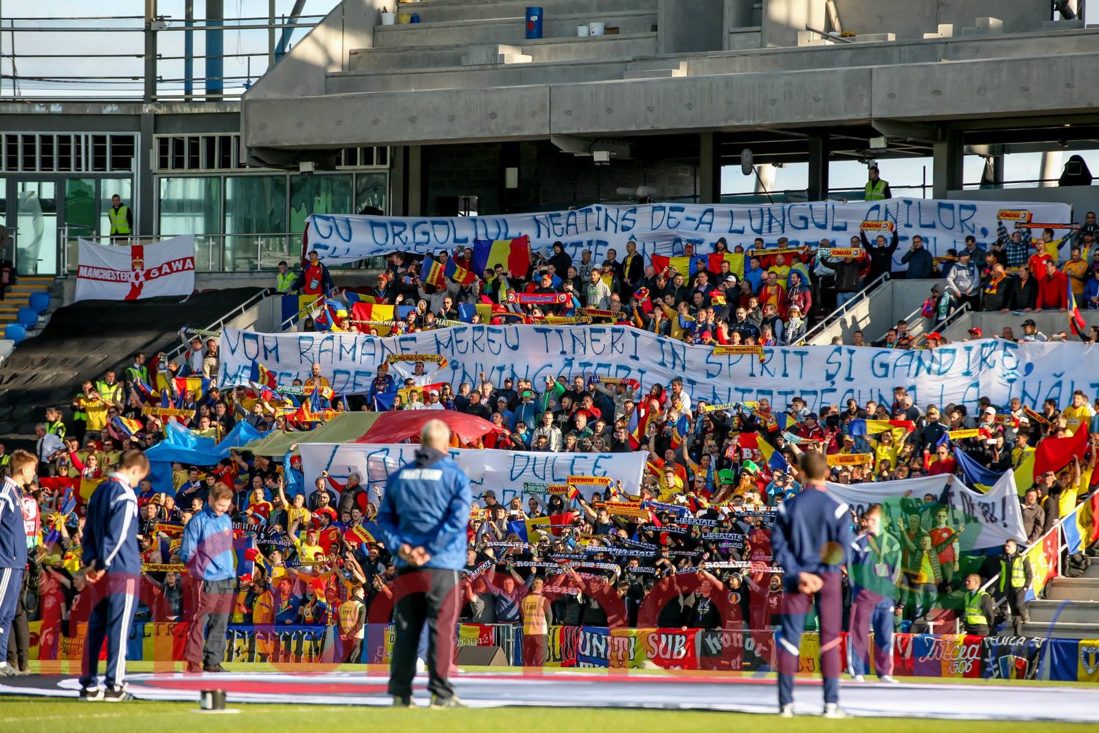 9.39 Jucatorii celor doua echipe ies pe teren, Jucatorii nostri in galben complet, irlandezii cu tricouri verzi si sorturi albe. Acum se canta imnul Romaniei