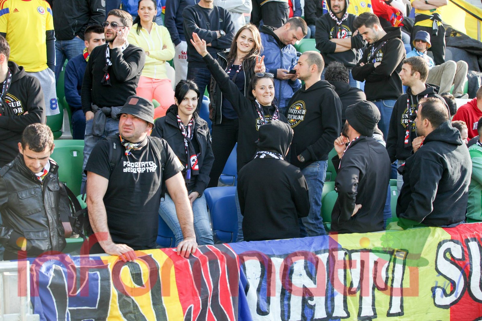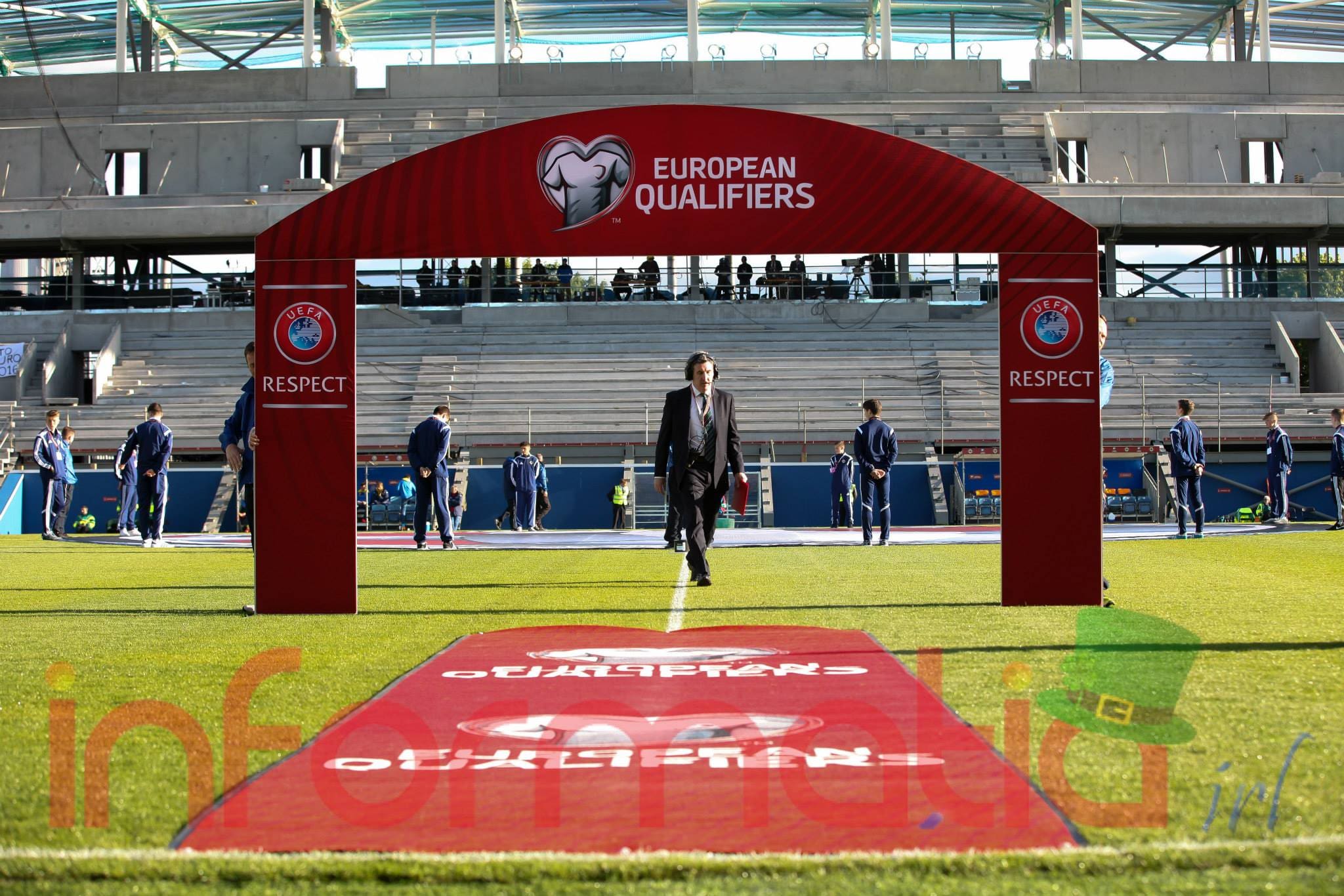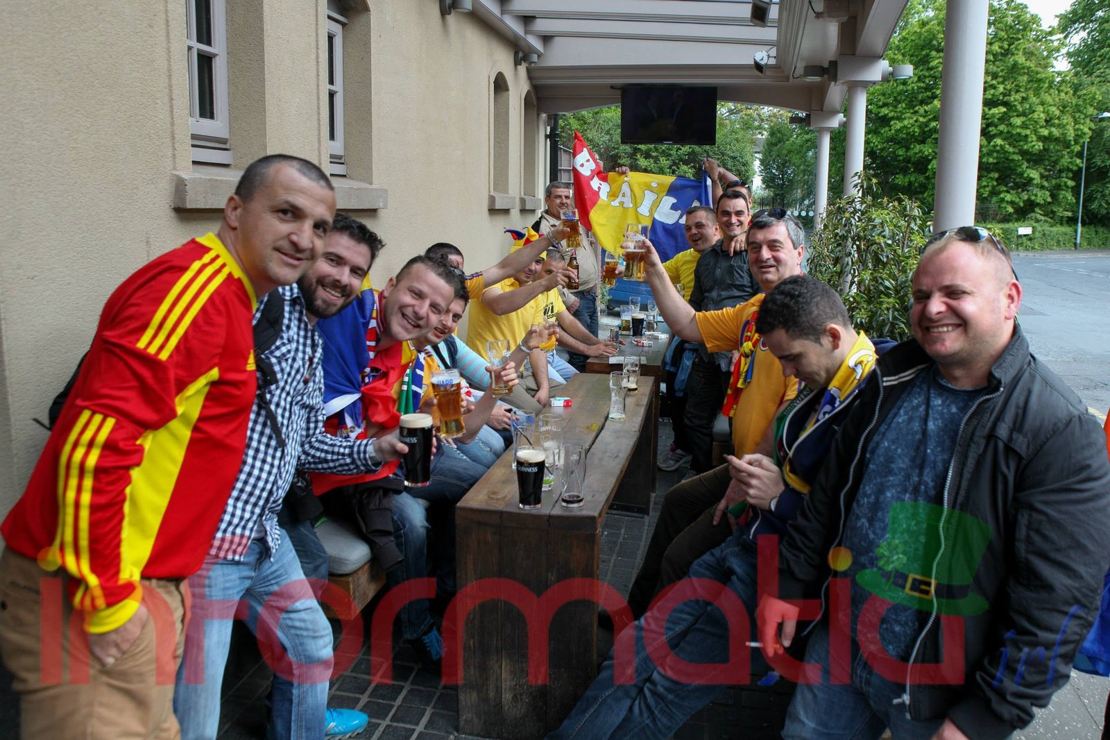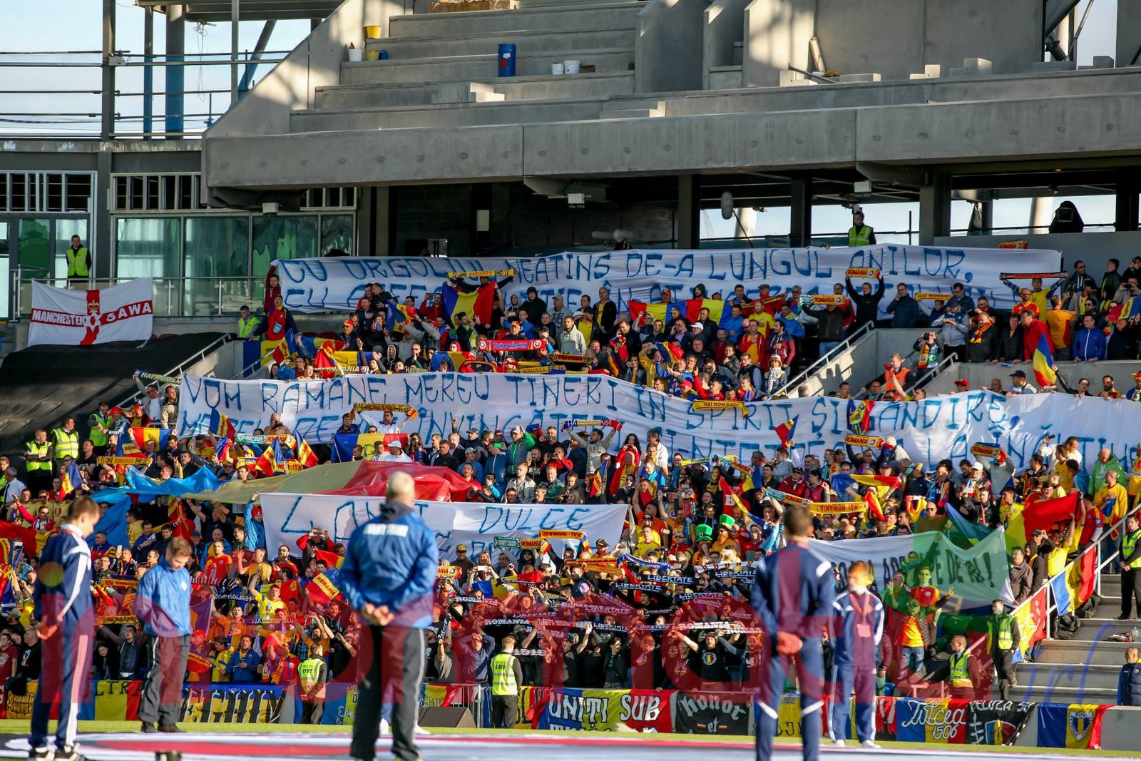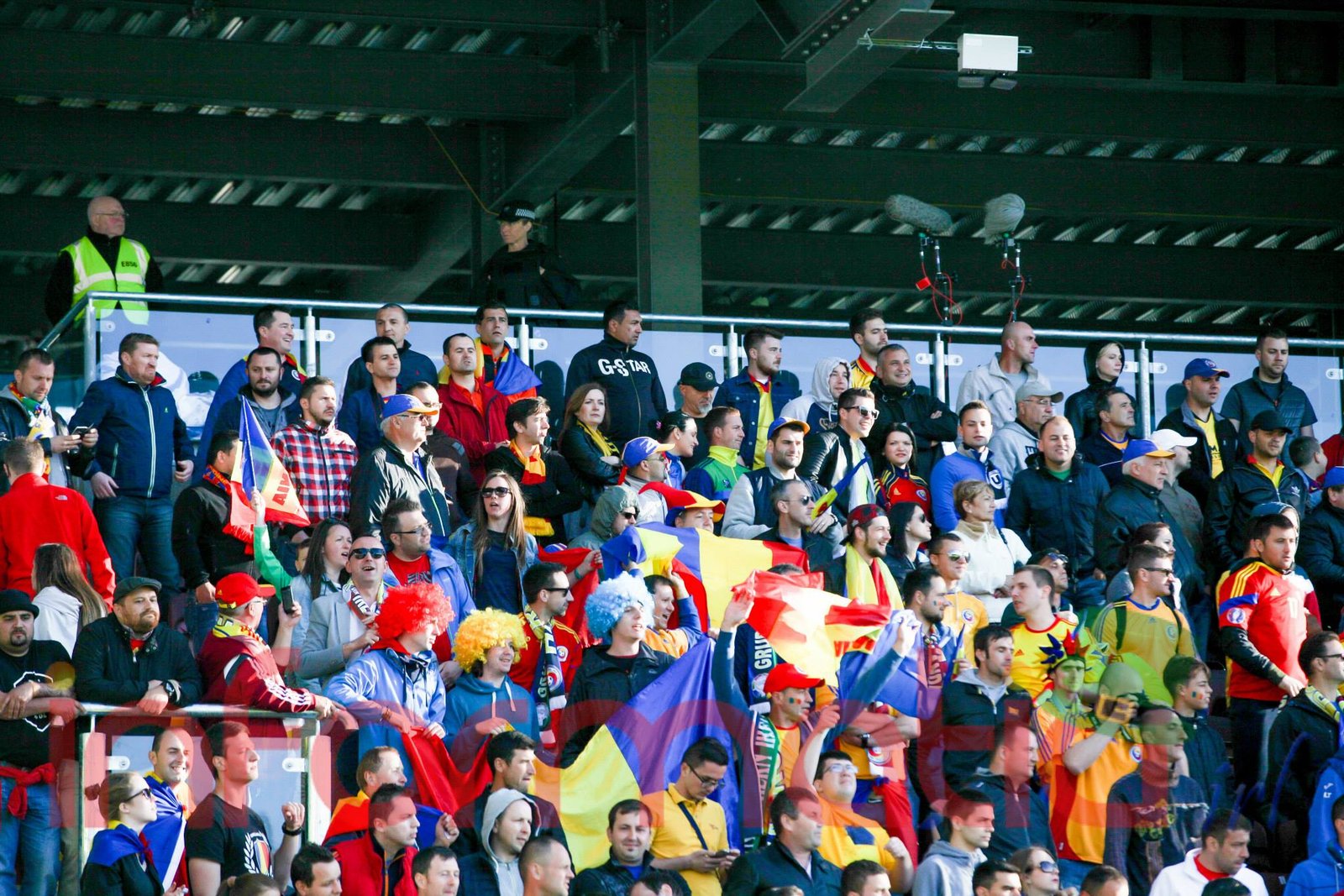 9.39 Jucatorii celor doua echipe ies pe teren, Jucatorii nostri in galben complet, irlandezii cu tricouri verzi si sorturi albe. Acum se canta imnul Romaniei