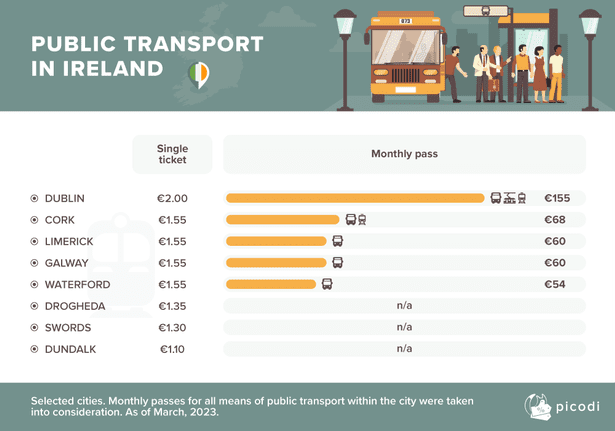 Într-o analiză a costurilor pentru tarifele de transport public din 45 de orașe, Picodi.com a constatat că Dublin are printre cele mai mari costuri pentru un abonament lunar de autobuz, cu 155 de euro începând cu martie 2023.
