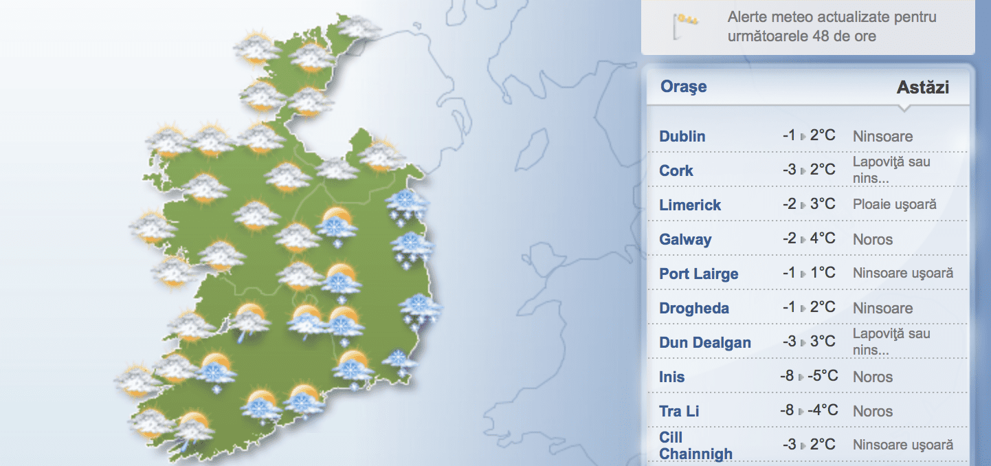În prezent în Irlanda este un cod portocaliu de zăpadă și gheață pentru comitatele Dublin, Kildare, Louth, Wexford, Wicklow, Meath și Waterford.