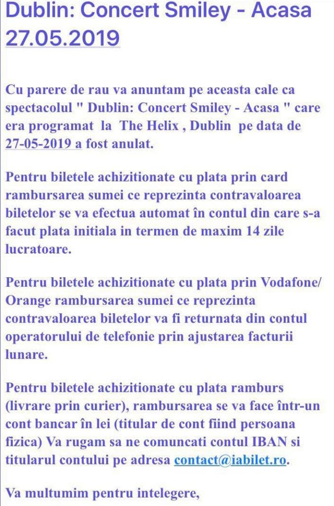 ? CONCERTUL LUI SMILEY DIN DUBLIN A FOST ANULAT!