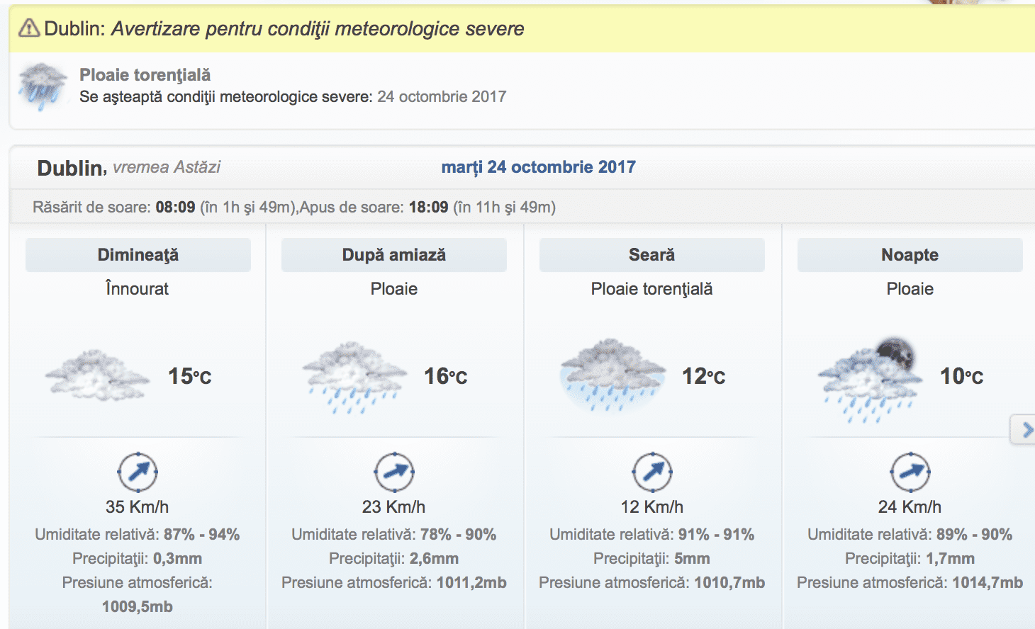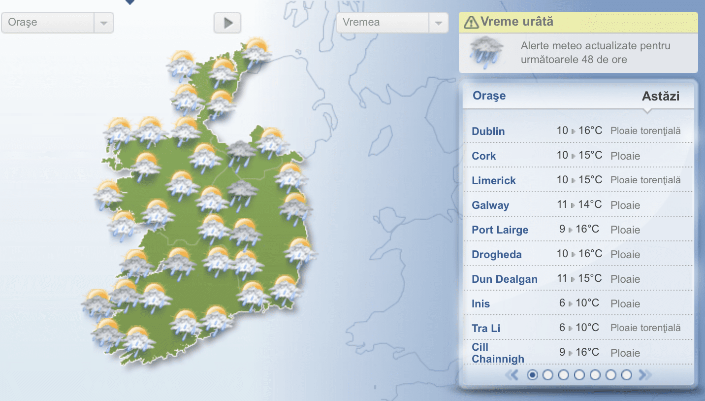 Astăzi o zi ploioasă în Irlanda. Ploile pot avea caracter torențial inclusiv în capitala Dublin. Temperaturile maxime ajung la aproximativ 16 grade.