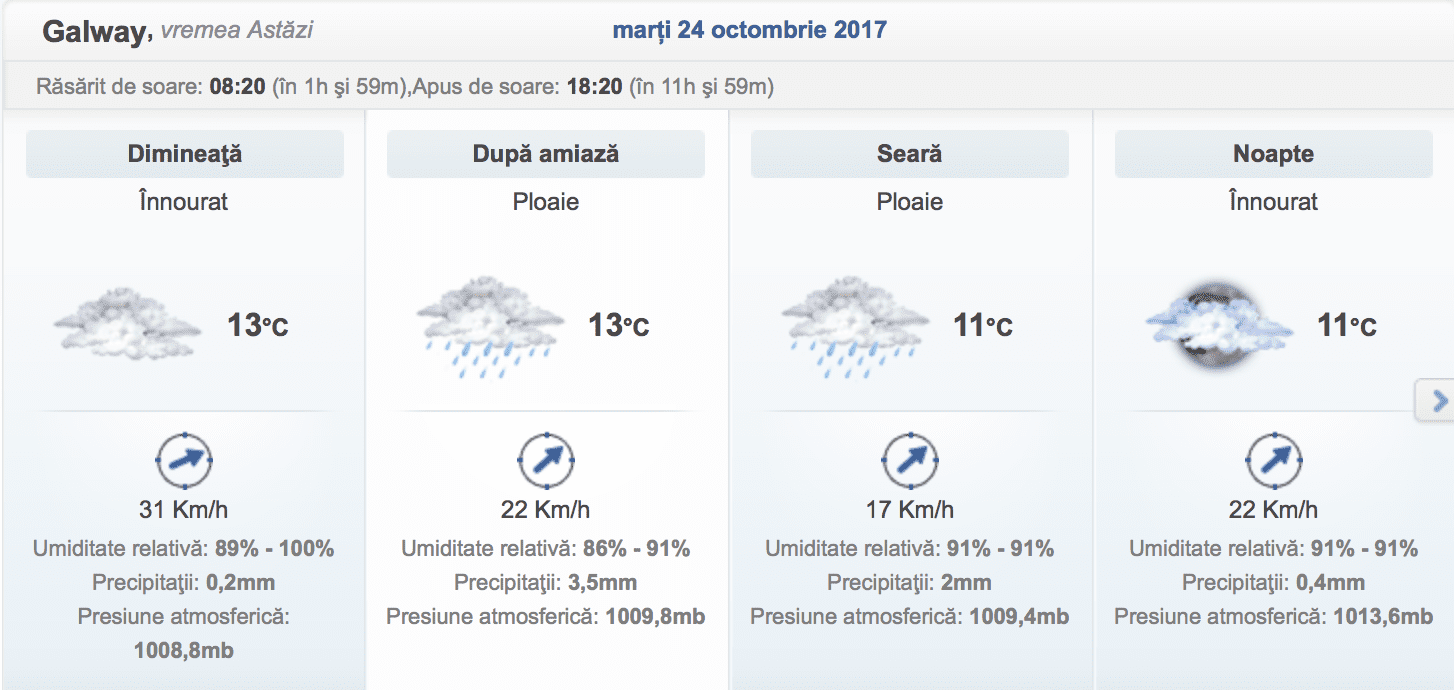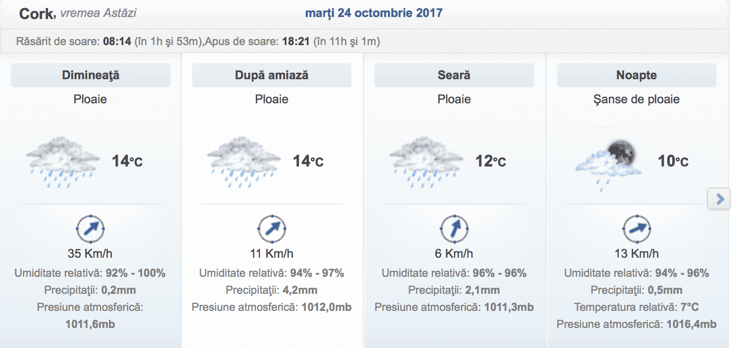 Astăzi o zi ploioasă în Irlanda. Ploile pot avea caracter torențial inclusiv în capitala Dublin. Temperaturile maxime ajung la aproximativ 16 grade.