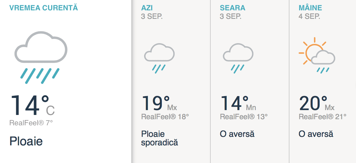 Astăzi fenomenul meteo predominant este ploaia. Temperaturile maxime astăzi ajung la 19 grade.