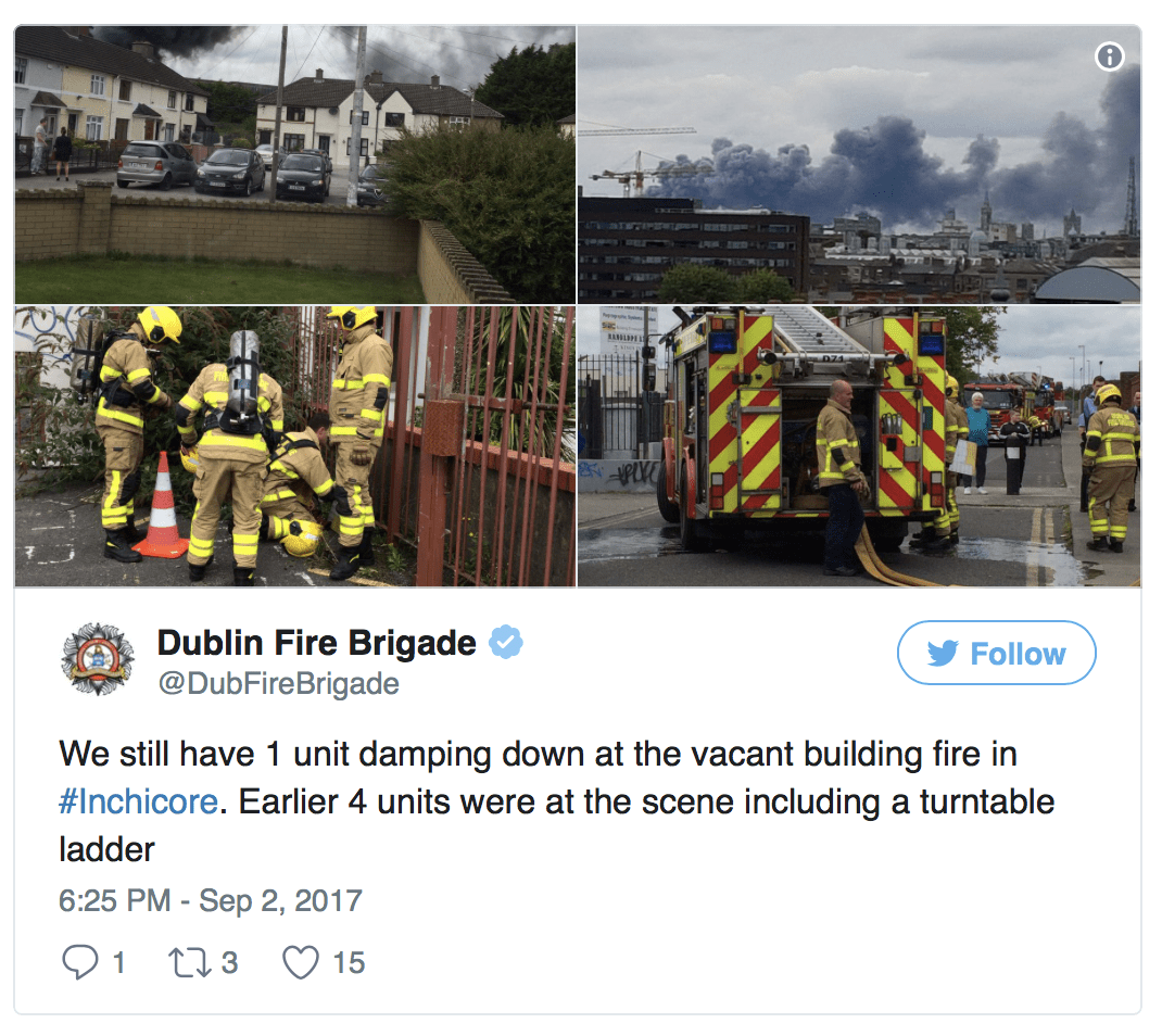 Aproximativ 20 de pompieri s-au luptat cu focul la o fostă fabrică din Inchicore, Dublin. Patru mașini de pompieri au fost chemate ieri după amiază în jurul orei 2.30 la fabrica nefolosită din Inchicore. Norul de fum putea fi văzut din aproape tot Dublinul pentru câteva ore până când incendiul a fost stins în jurul orei 7 seara.
