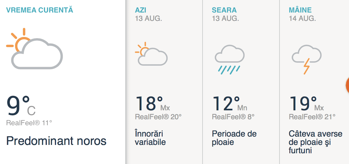 Astăzi va fi o zi cu cer variabil, mai mult noros și ploaie către seară. Temperaturile maxime ajung la 18 grade.