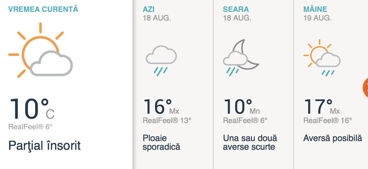 Astăzi va fi o zi cu cer variabil mai mult noros și cu câteva ploi sporadice. Temperaturile maxime ajung la 16 de grade.