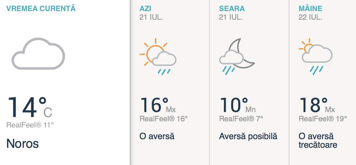 Astăzi va fi o zi rece cu temperaturi maxime ce ajung la 16-17 grade. Cerul va fi variabil și sunt posibile câteva averse de ploaie.