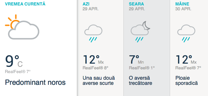 ✤ Astăzi cerul va fi variabil mai mult noros cu câteva averse de ploaie. Temperaturile maxime vor ajunge la 11-13 grade.