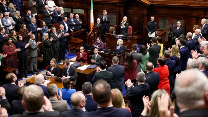 Președintele Ucrainei, Volodimir Zelensky, a susținut astăzi un discurs de referință în fața celor două camere ale Parlamentului irlandez – Dáil și Seanad – fiind întâmpinat cu ovații.